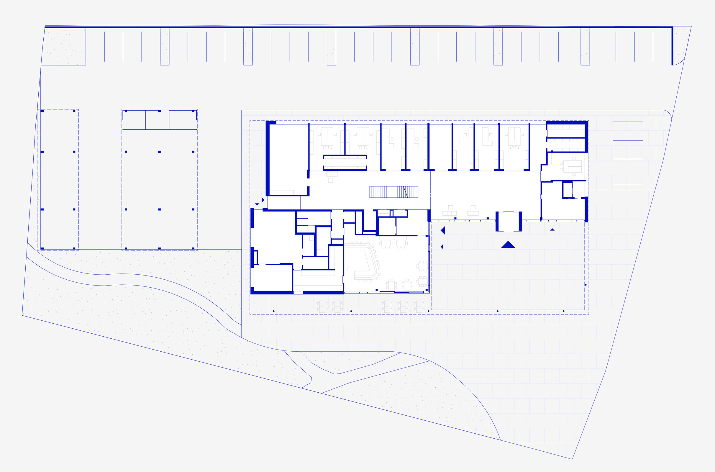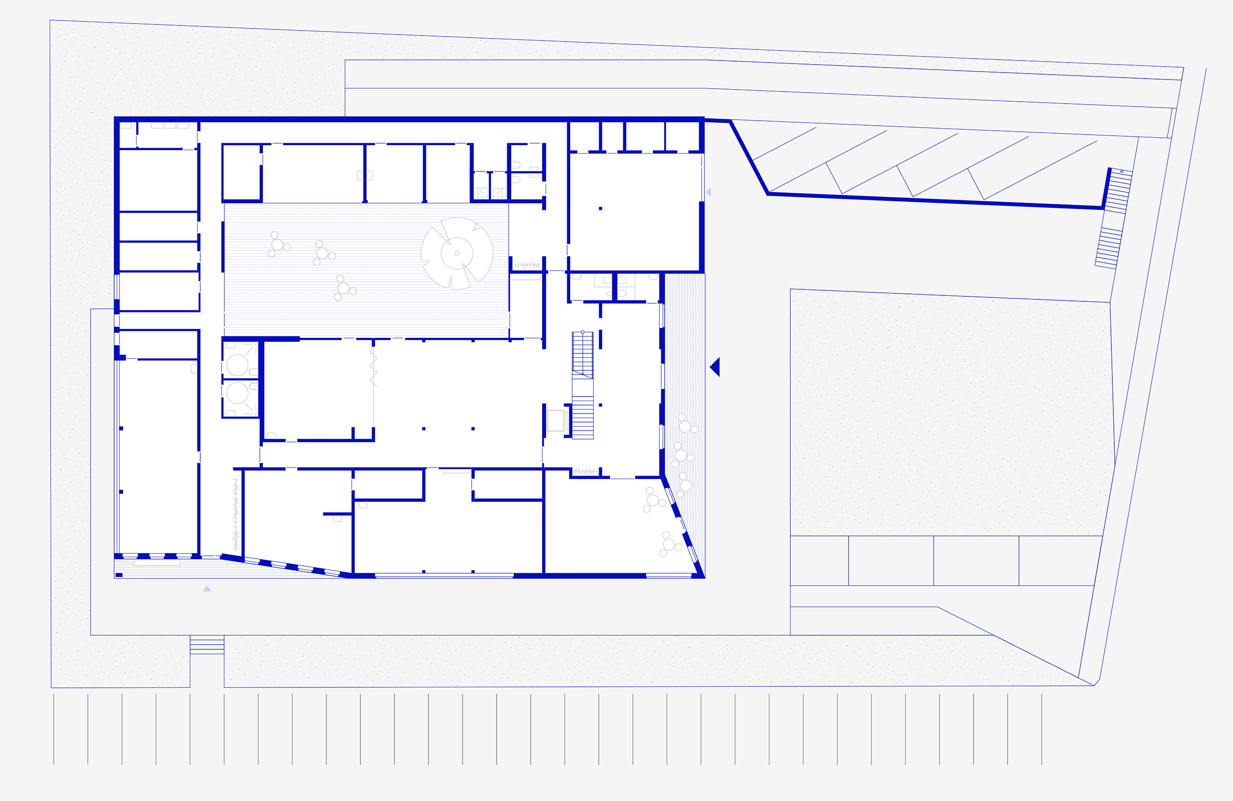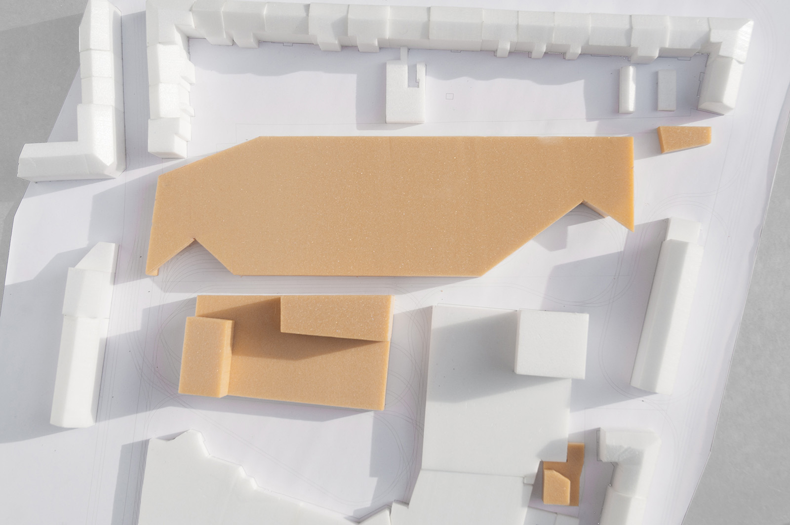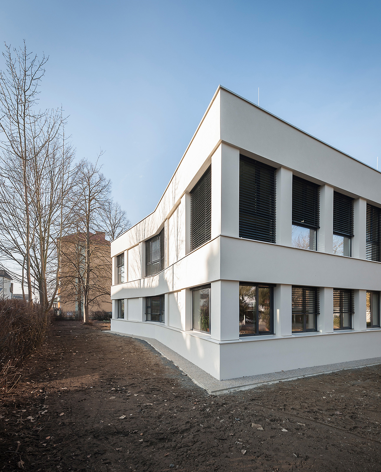 Dies gelingt, indem der neue Baukörper auf der Seite der Wohnblöcke die Straßenflucht zweigeschossig aufnimmt und dadurch eine repräsentative urbane Situation ausbildet. Hangseitig ist das Gebäude eingegraben, um mit den kleineren Nachbarhäusern in Form einer eingeschossigen Fassade in Dialog zu treten.