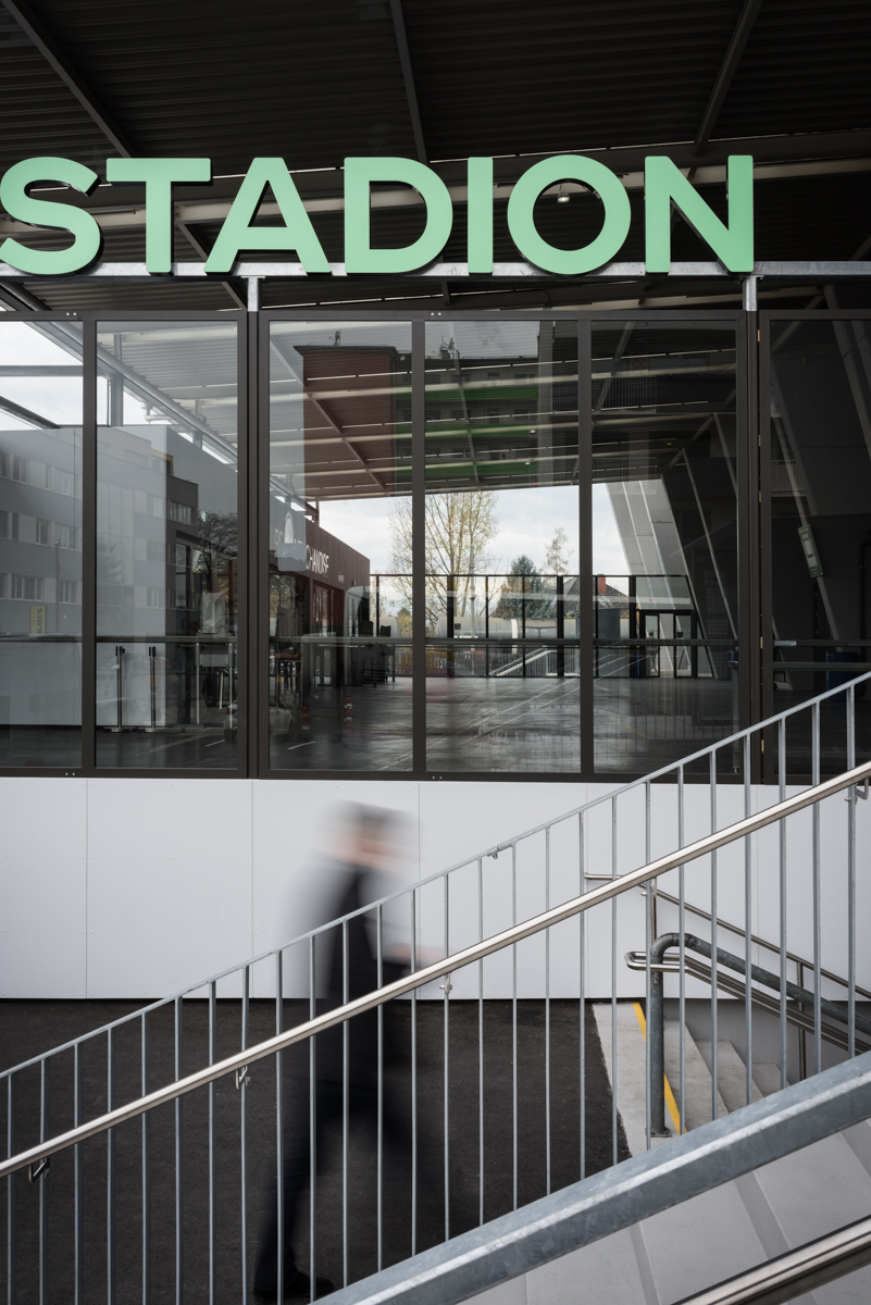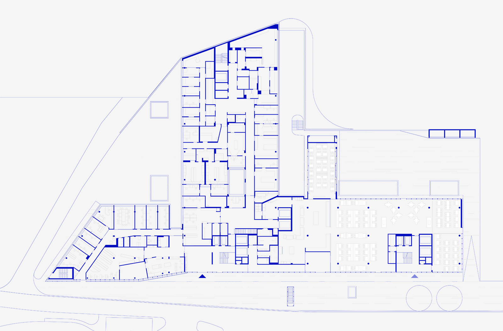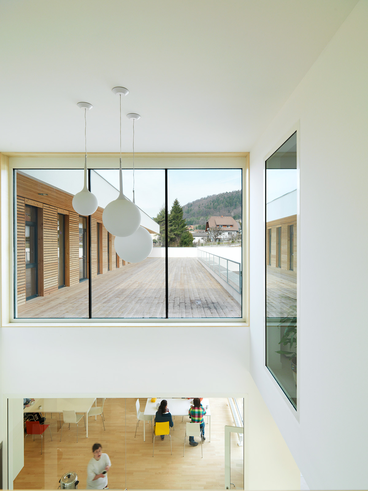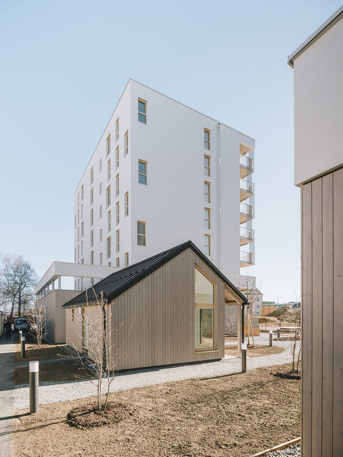 Dies gelingt, indem der neue Baukörper auf der Seite der Wohnblöcke die Straßenflucht zweigeschossig aufnimmt und dadurch eine repräsentative urbane Situation ausbildet. Hangseitig ist das Gebäude eingegraben, um mit den kleineren Nachbarhäusern in Form einer eingeschossigen Fassade in Dialog zu treten.