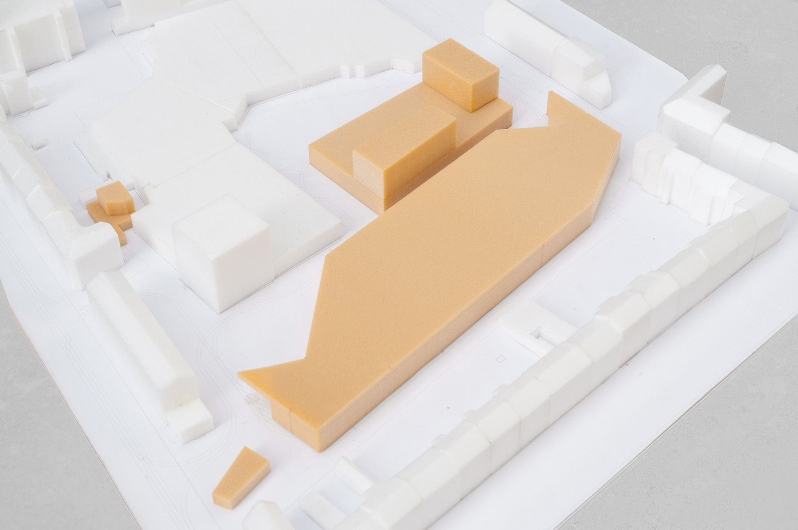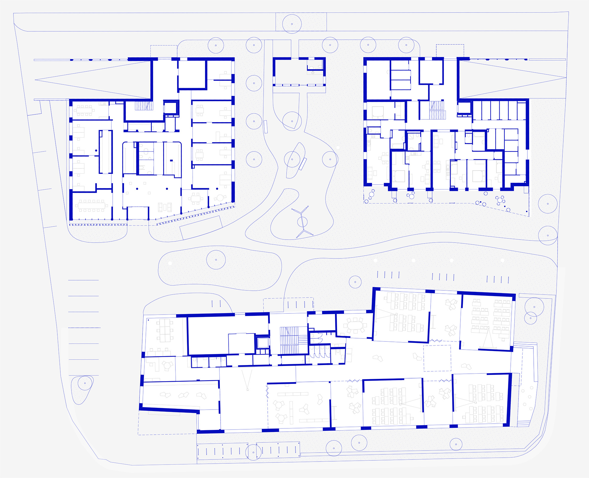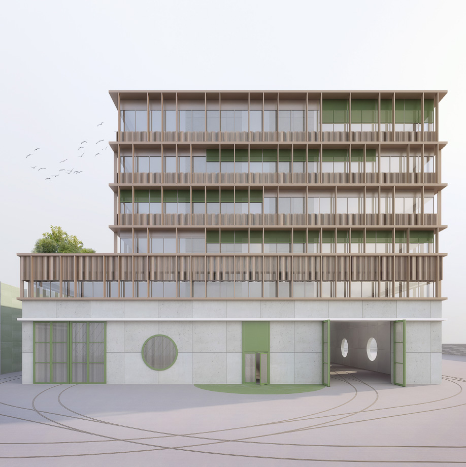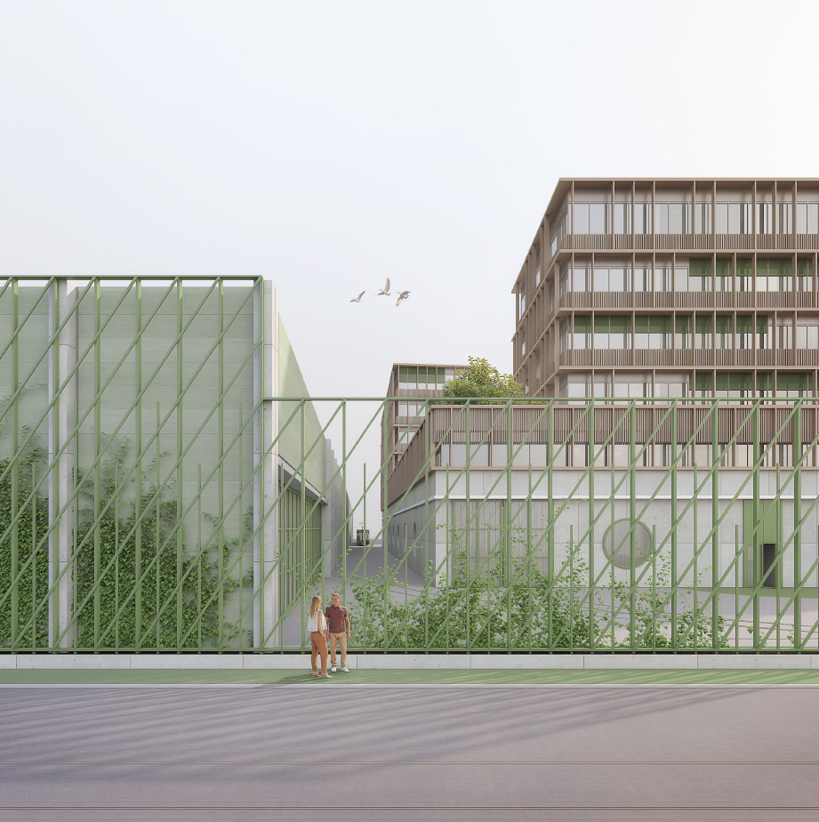 Die geplante Bebauung besteht aus drei Solitärköpern mit unterschiedlich ausformulierten Sockelzonen, welche die verschiedenen Nutzungen abbilden, die in ihnen untergebracht sind. Dieser Sockelbereich fungiert als Träger eines urbanen Maßstabes am Grundstück. Die vertikale Lamellenstruktur dient als Sichtschutz für die Büros und als räumliche Schwelle zwischen dem Innen- und dem Außenbereich.