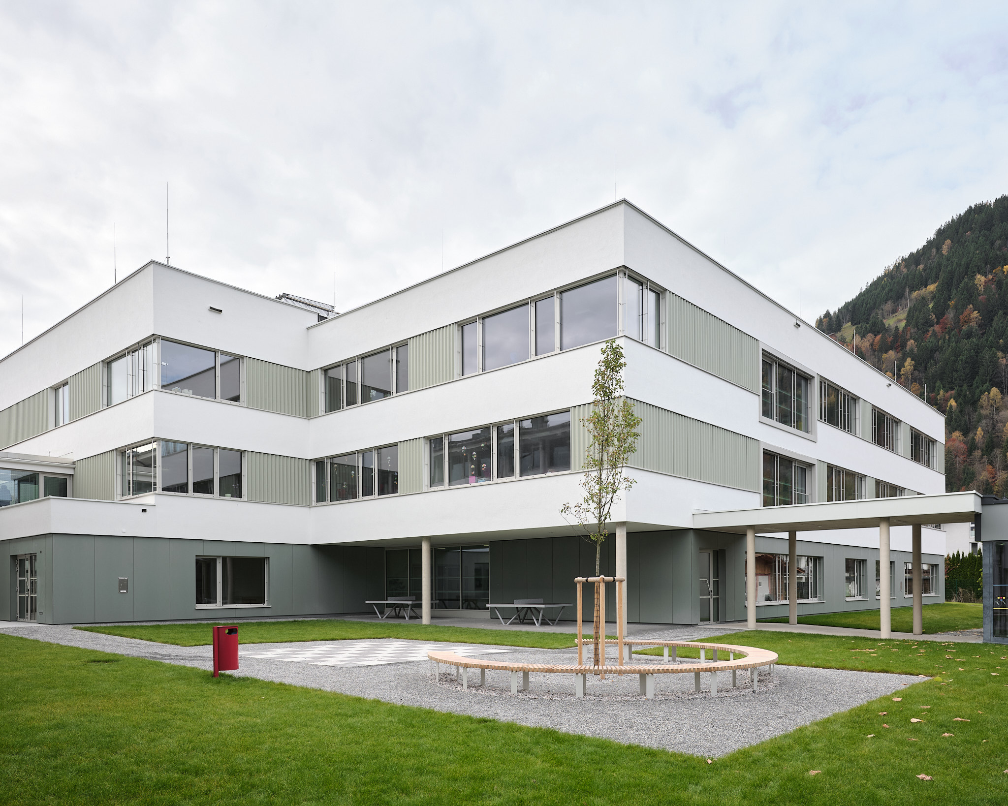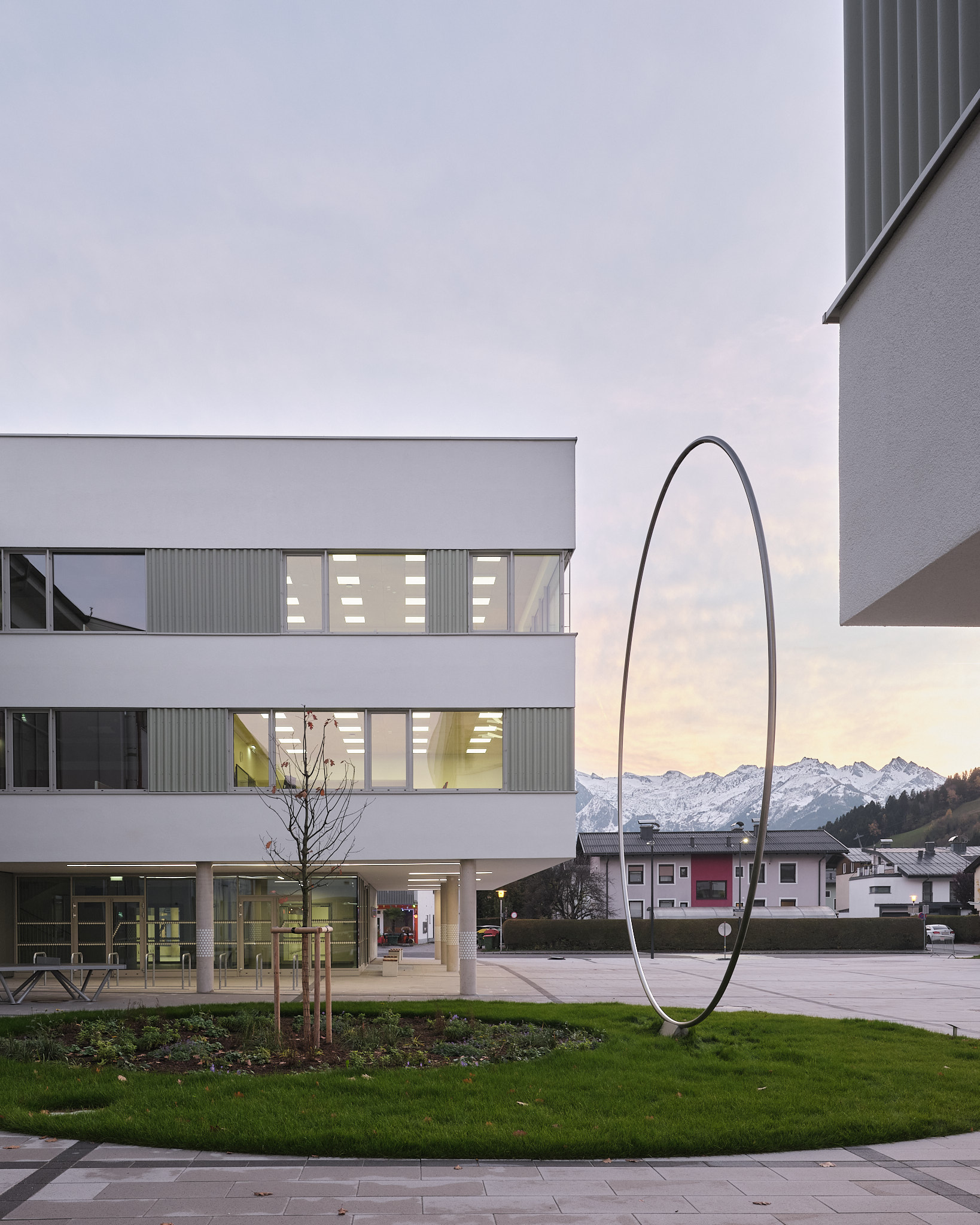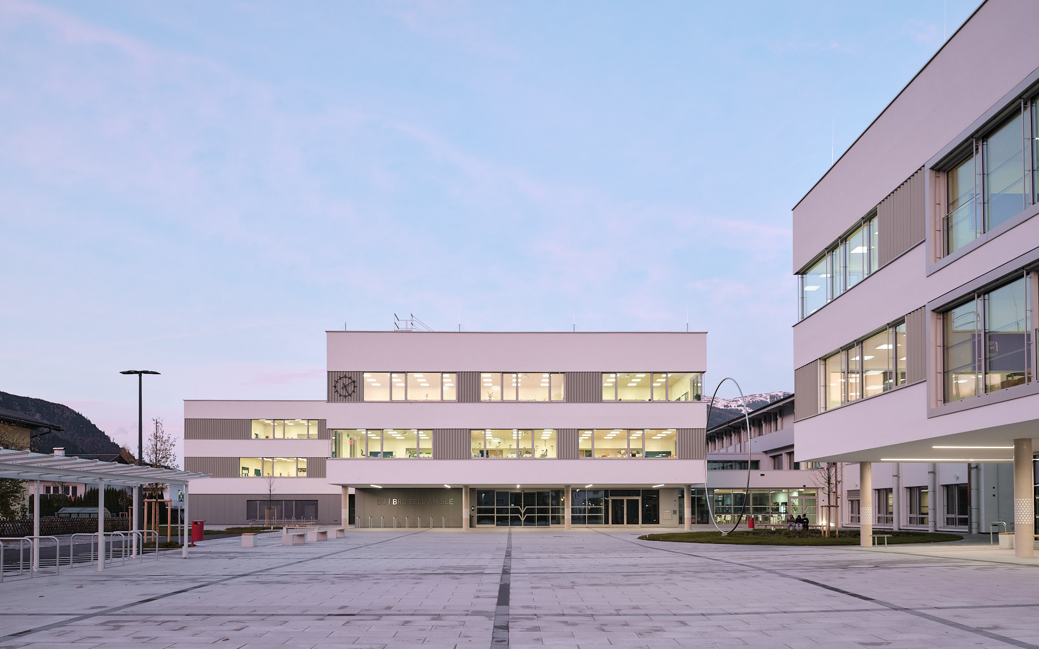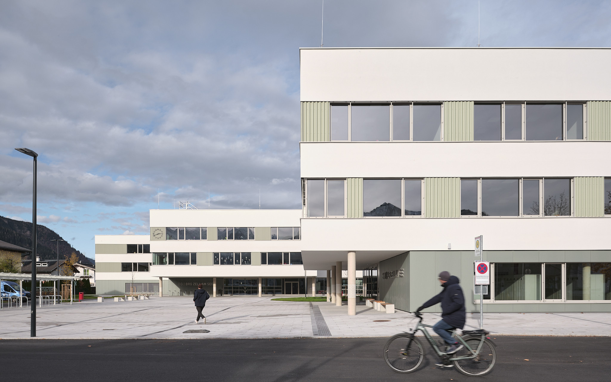 Schule bildet Platz - Die Neubauten des Bundesschulzentrum Zell am See reagieren auf die kleinteilige Struktur der umliegenden Bebauung und fügen sich durch zwei kompakte Baukörper maßstäblich in die Umgebung ein. Die HAK und das BRG schließen im Süden und Westen an den bestehenden Osttrakt an und erhalten separate Zugänge, die gleichwertig über einen großzügigen Schulvorplatz erschlossen werden.