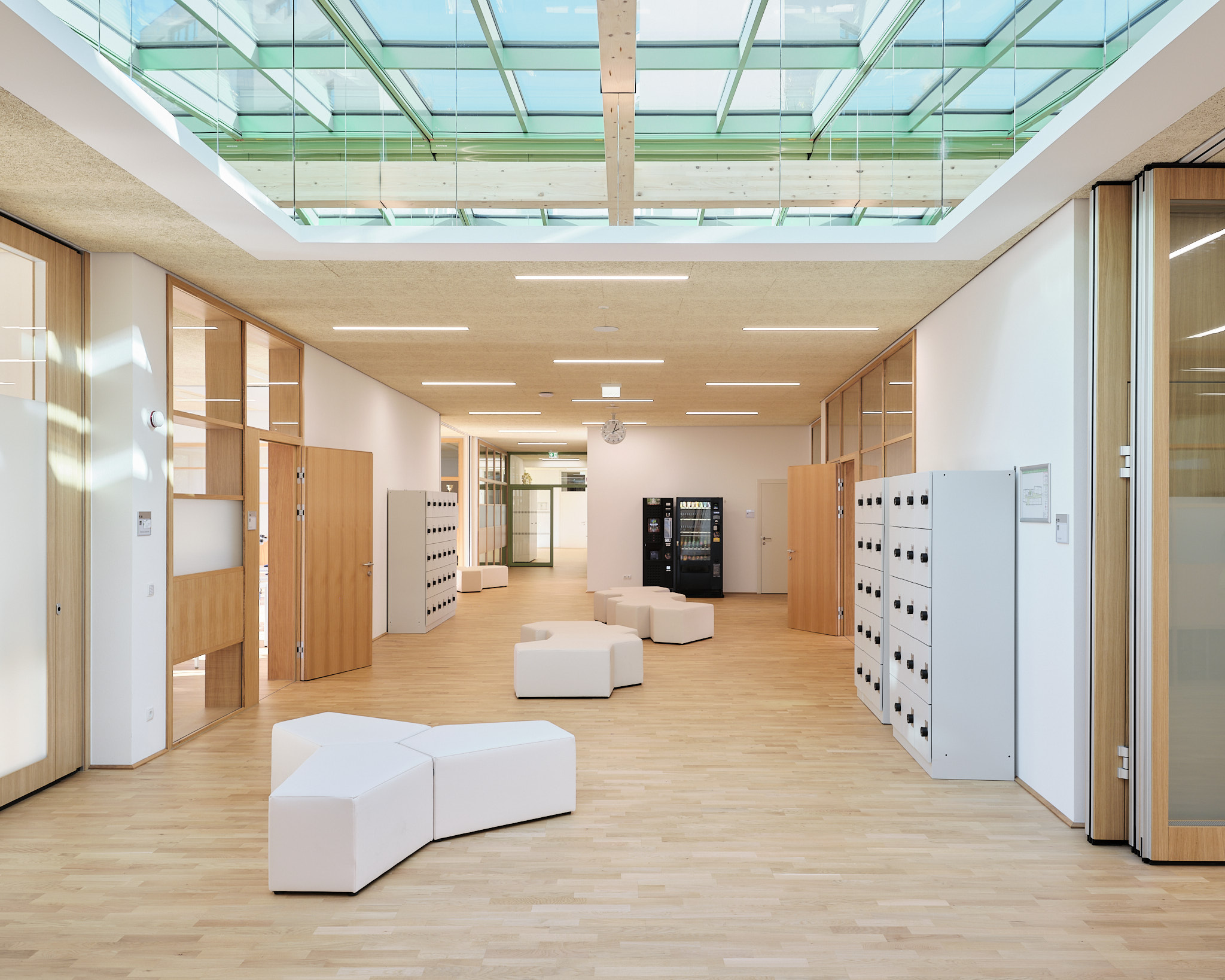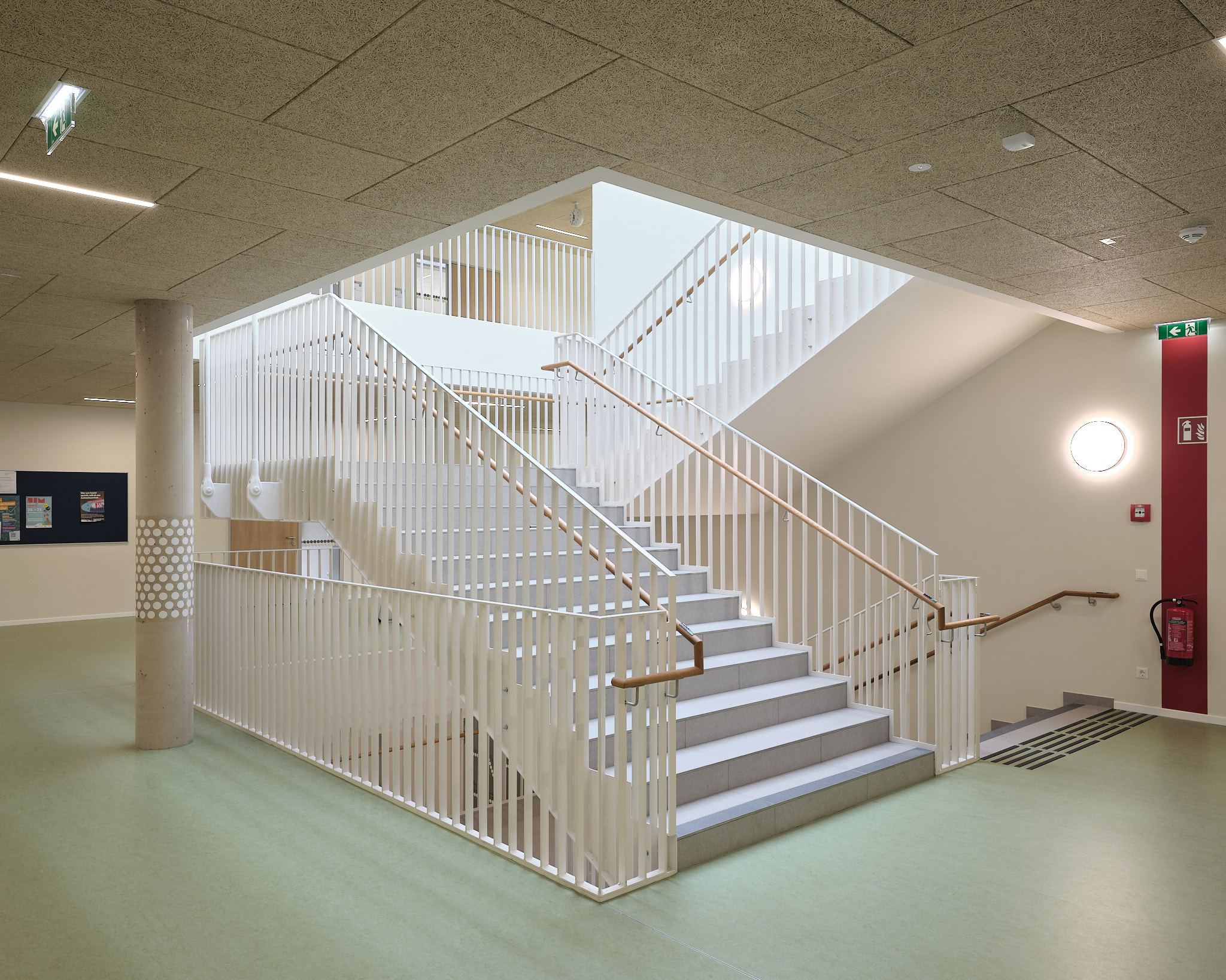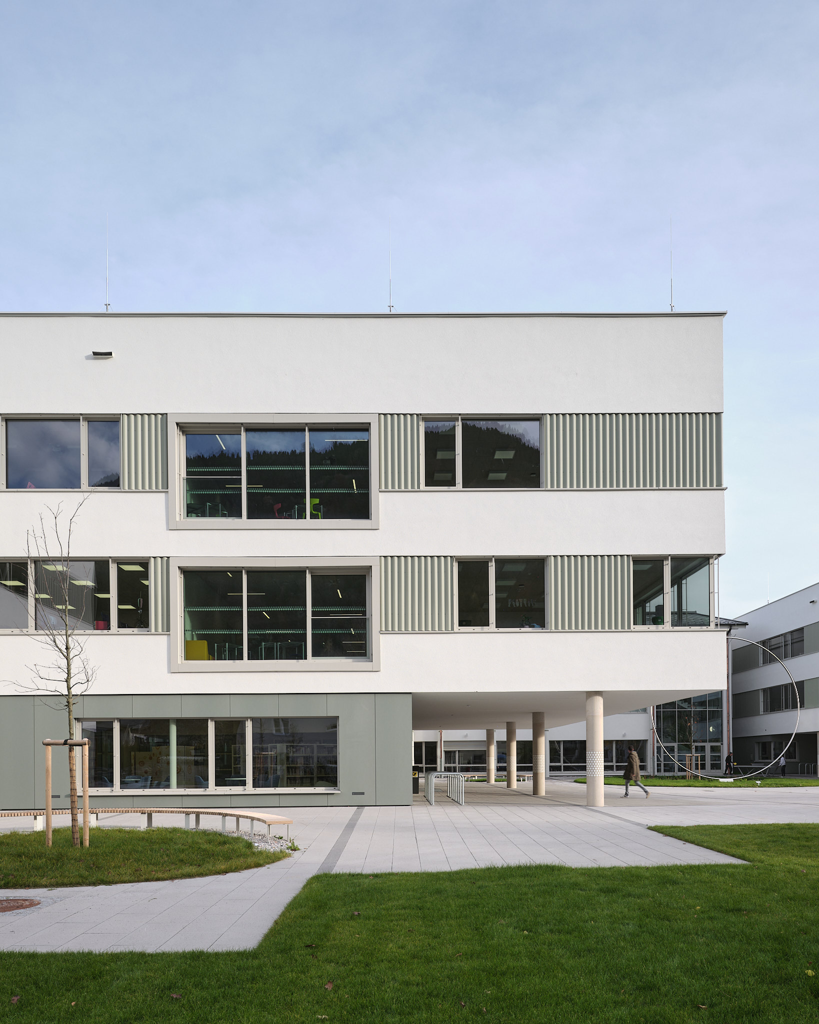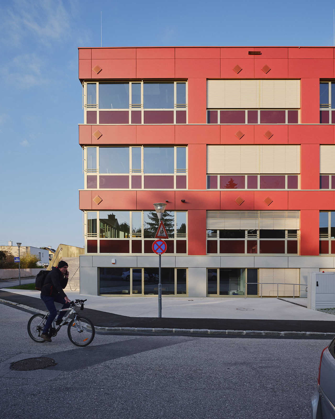 Als neues Herzstück der Schule kann die breite und luftige Magistrale bezeichnet werden, die sich in Verlängerung der Eingangsrampe durch den Bestand und den Zubau über alle Geschoße erstreckt. Als funktionales Bindeglied verknüpft sie Alt und Neu und ermöglicht eine klare Orientierung für die jungen Wiener Neustädter:innen. Für den Zubau wurden Zitate aus der Bestandsfassade, wie die Proportion der Öffnungen, die Materialität und die Farbgebung entlehnt und neu interpretiert im Zubau fortgeführt. So präsentiert sich der Neubau als nach allen Seiten hin offener Baukörper, dessen hinterlüftete Fassadenplatten in Sichtbetonoptik das gebrannte Rot der Klinkerziegel vom Bestand aufnehmen.
