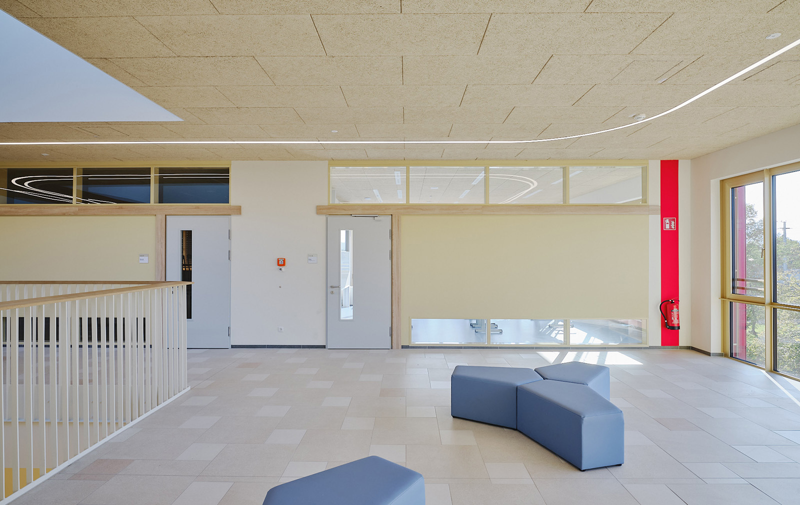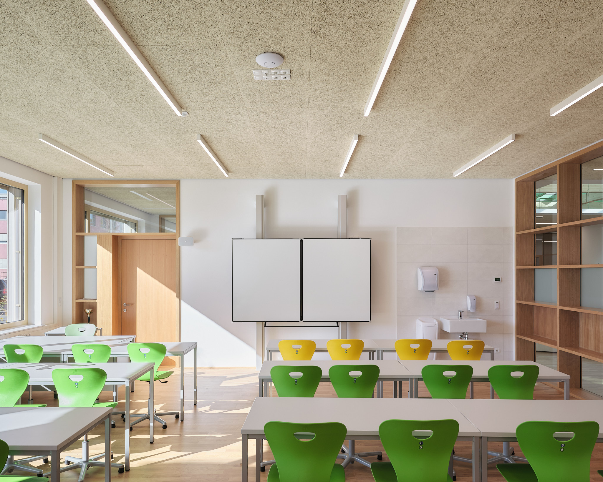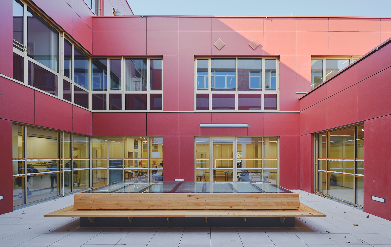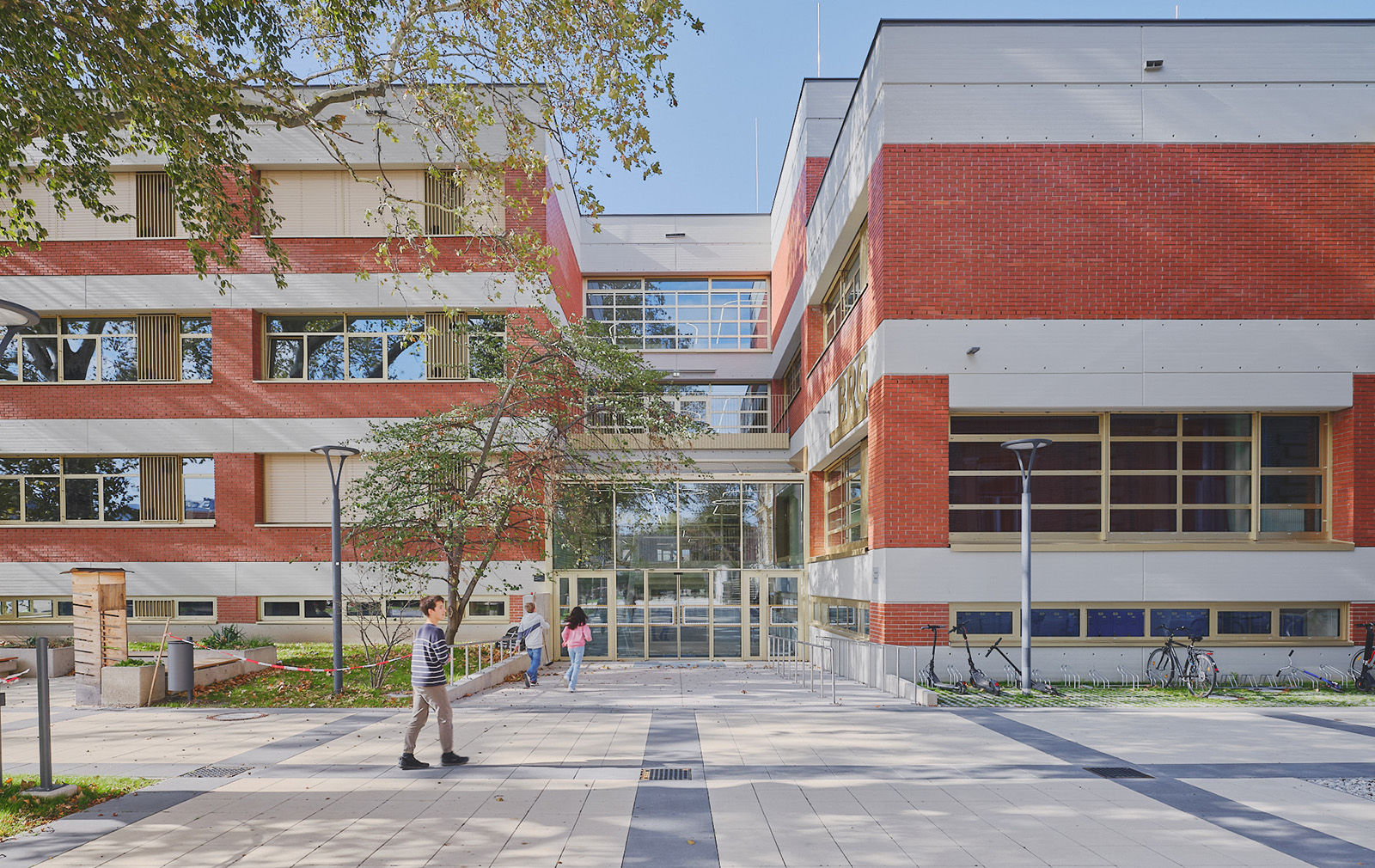 Als neues Herzstück der Schule kann die breite und luftige Magistrale bezeichnet werden, die sich in Verlängerung der Eingangsrampe durch den Bestand und den Zubau über alle Geschoße erstreckt. Als funktionales Bindeglied verknüpft sie Alt und Neu und ermöglicht eine klare Orientierung für die jungen Wiener Neustädter:innen. Für den Zubau wurden Zitate aus der Bestandsfassade, wie die Proportion der Öffnungen, die Materialität und die Farbgebung entlehnt und neu interpretiert im Zubau fortgeführt. So präsentiert sich der Neubau als nach allen Seiten hin offener Baukörper, dessen hinterlüftete Fassadenplatten in Sichtbetonoptik das gebrannte Rot der Klinkerziegel vom Bestand aufnehmen.
