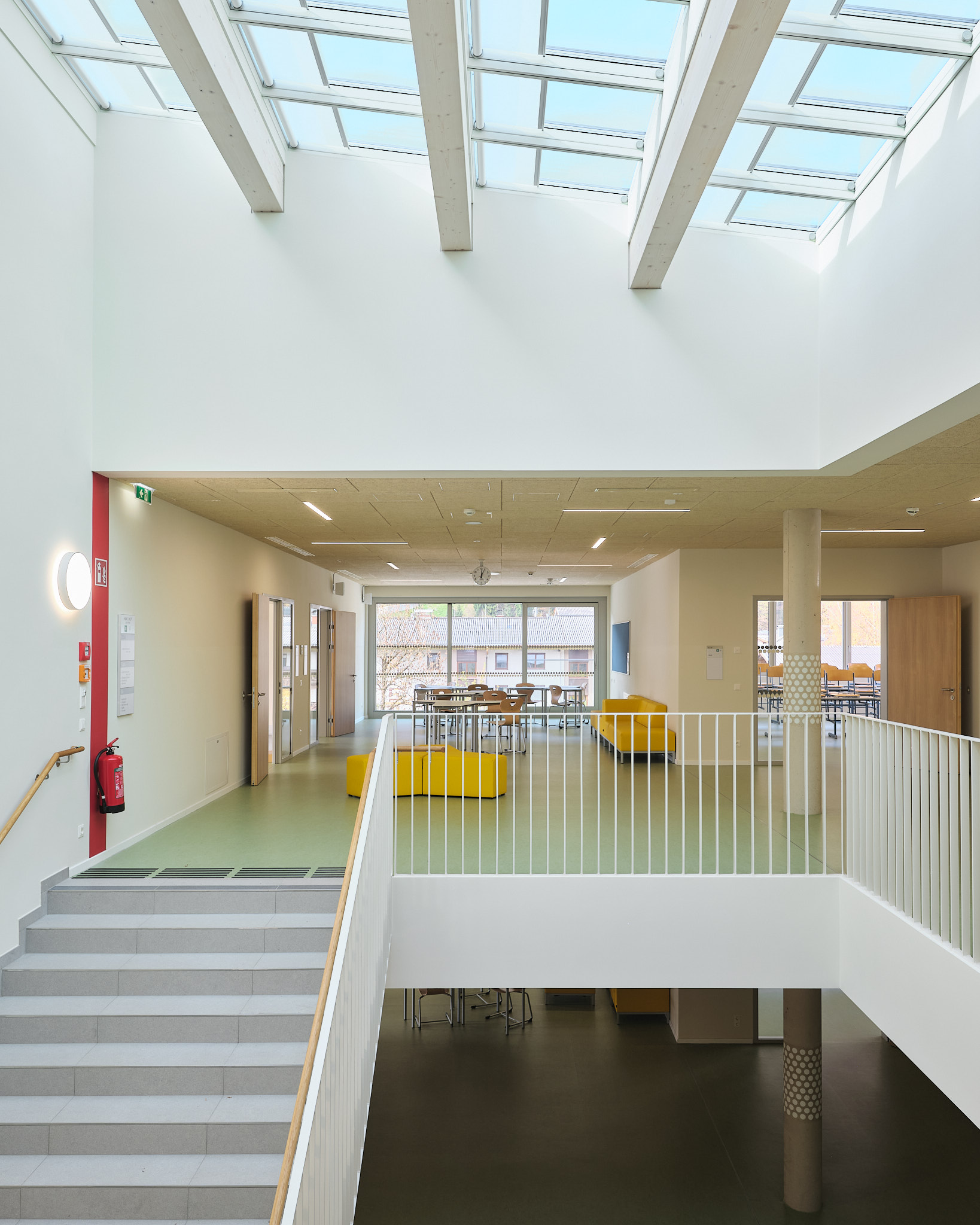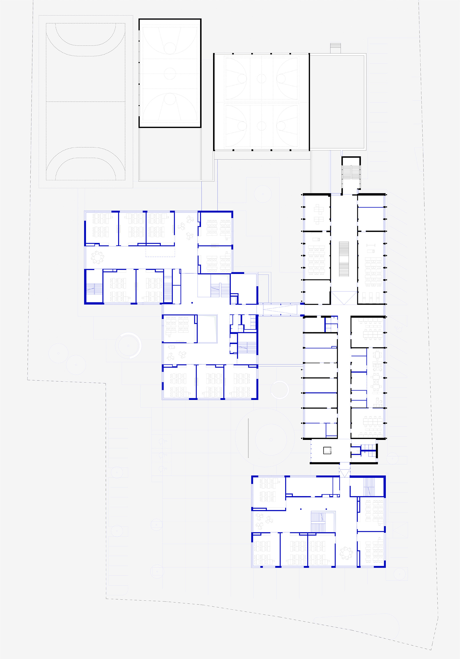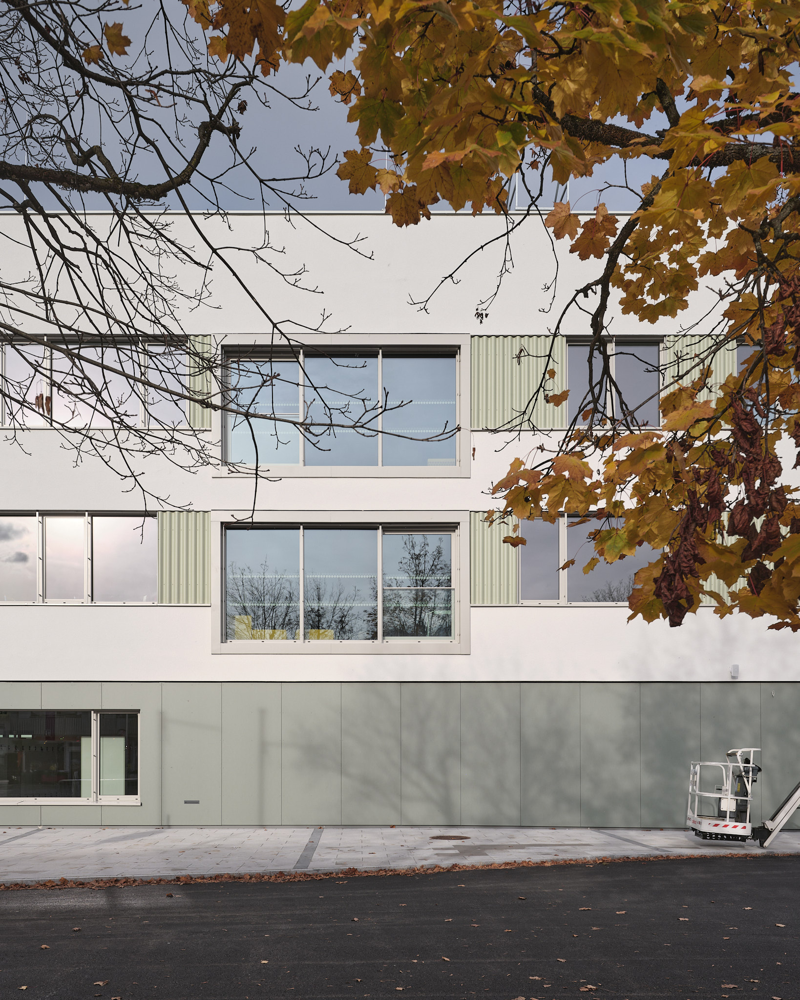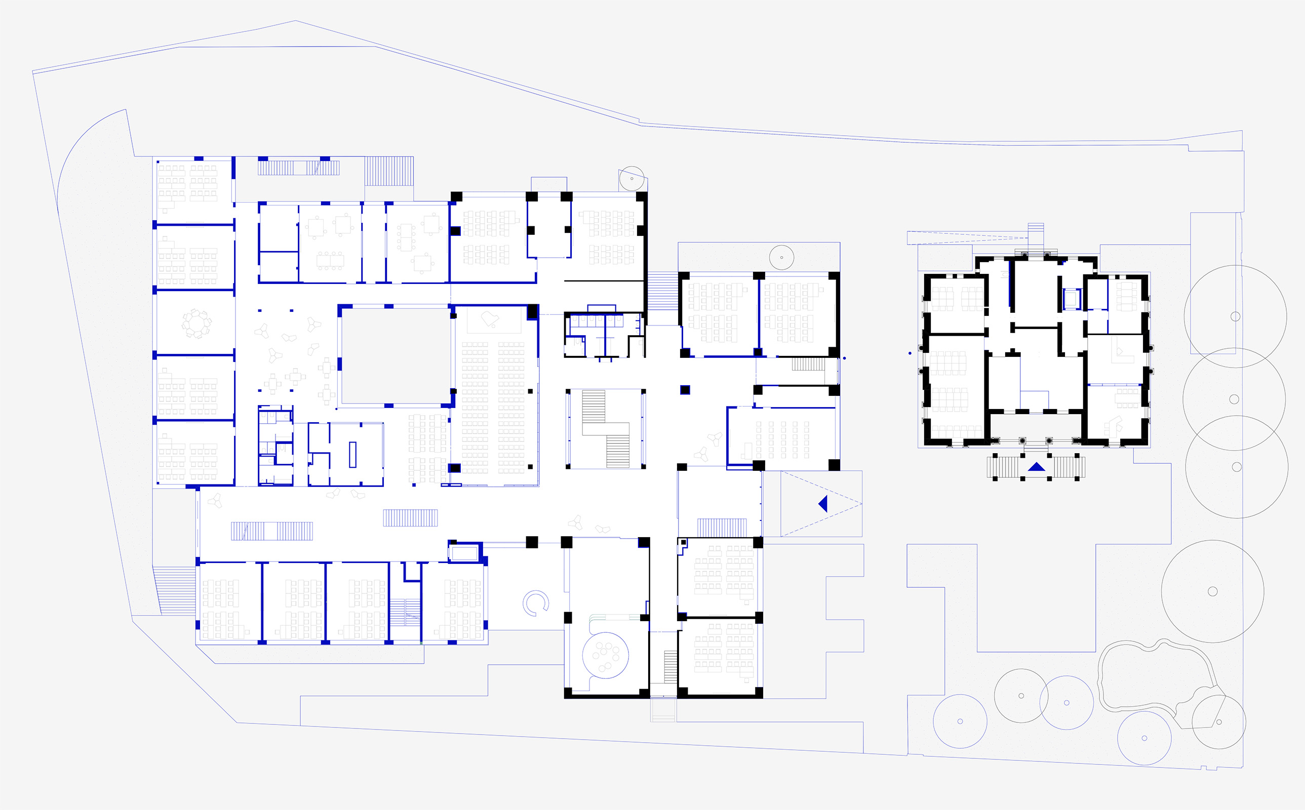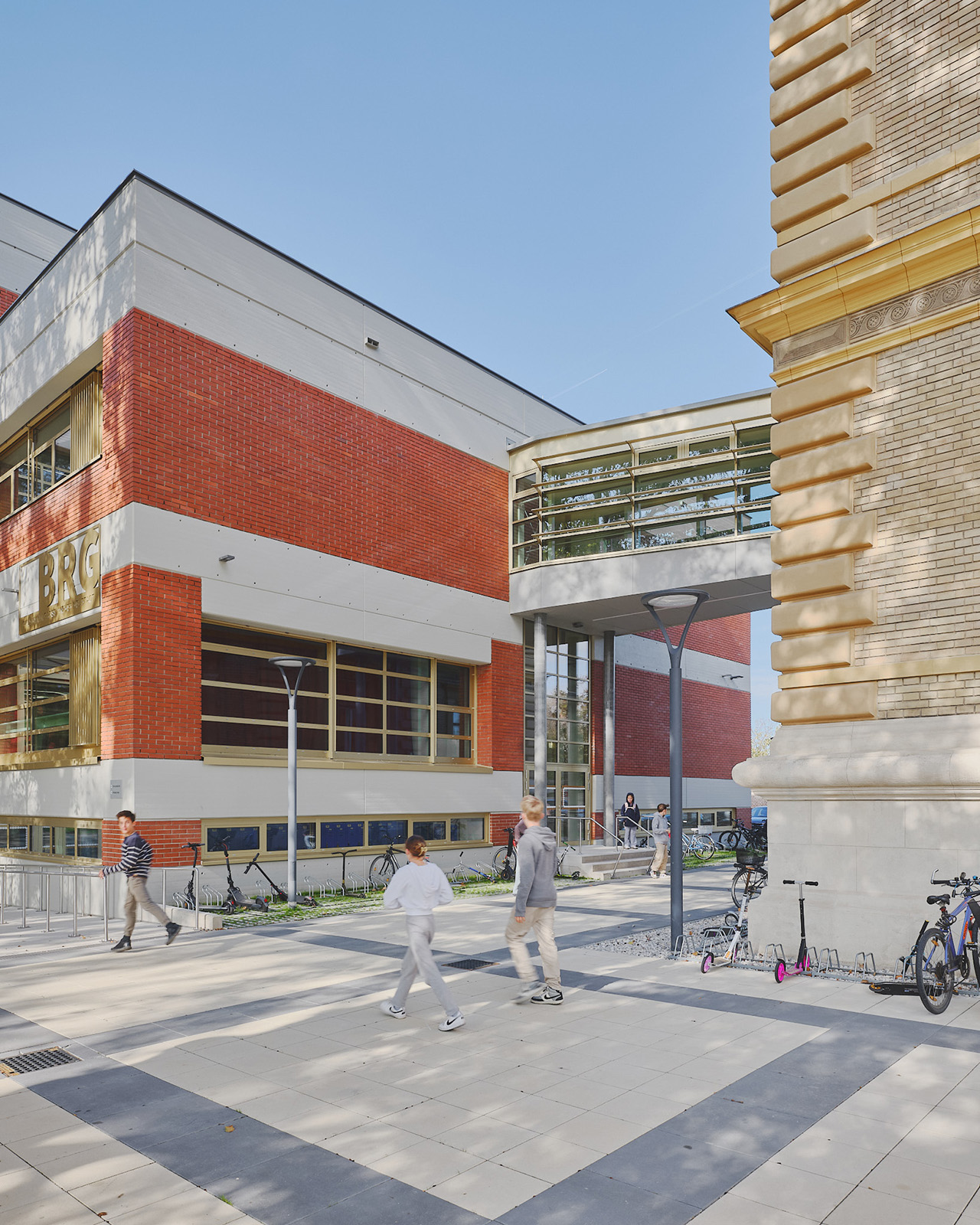 Um den Schulhof in seiner ursprünglichen prägnanten Platzsituation mit der Burkhardvilla zu erhalten, erfolgte der Zubau ausschließlich im westlichen Bereich des Grundstückes. Das Souterrain wurde Richtung Westen fortgeführt und fungiert als Sockel für die L-förmige Erweiterung, die sich in einer geschoßweisen Höhenstaffelung an den Bestand und an die Grundgrenzen anfügt. Der einzige geringfügige Eingriff auf der Ostseite des Bestandsgebäudes betrifft die Eingangssituation: Eine breite Rampenanlage führt nun barrierefrei auf das Niveau des Souterrains zum Haupteingang für die Schüler:innen und weiter zu den Zentralgarderoben.