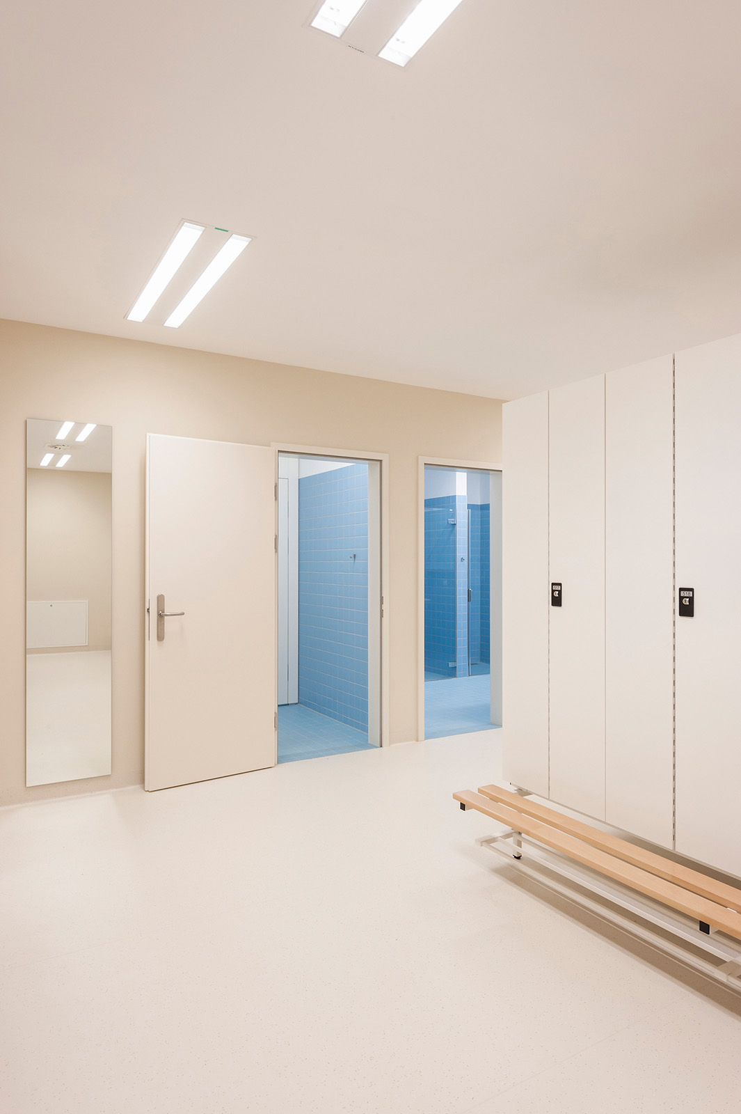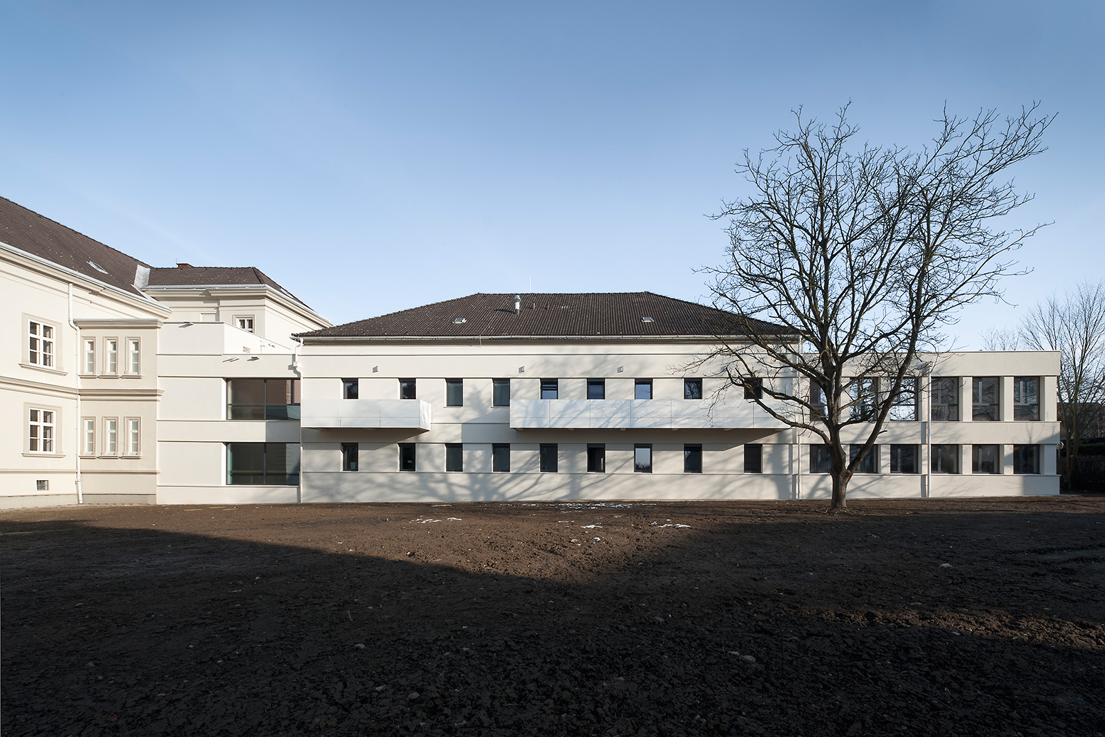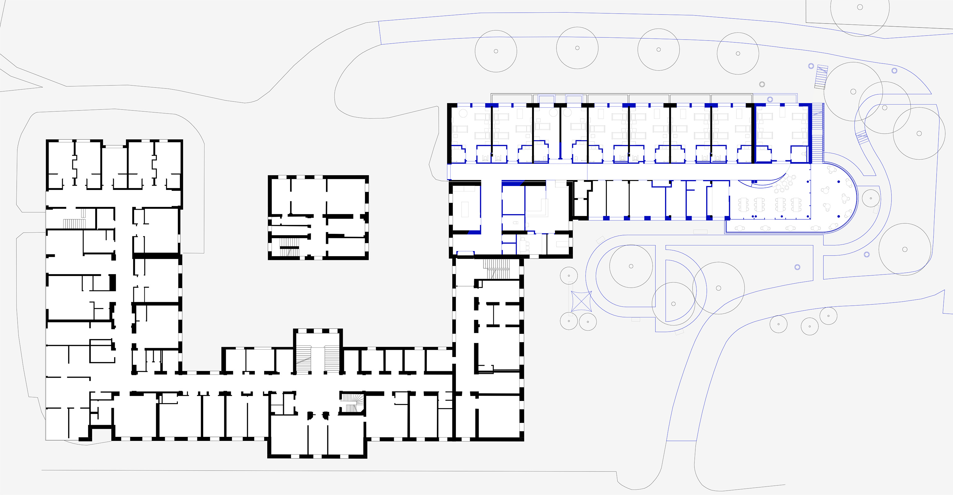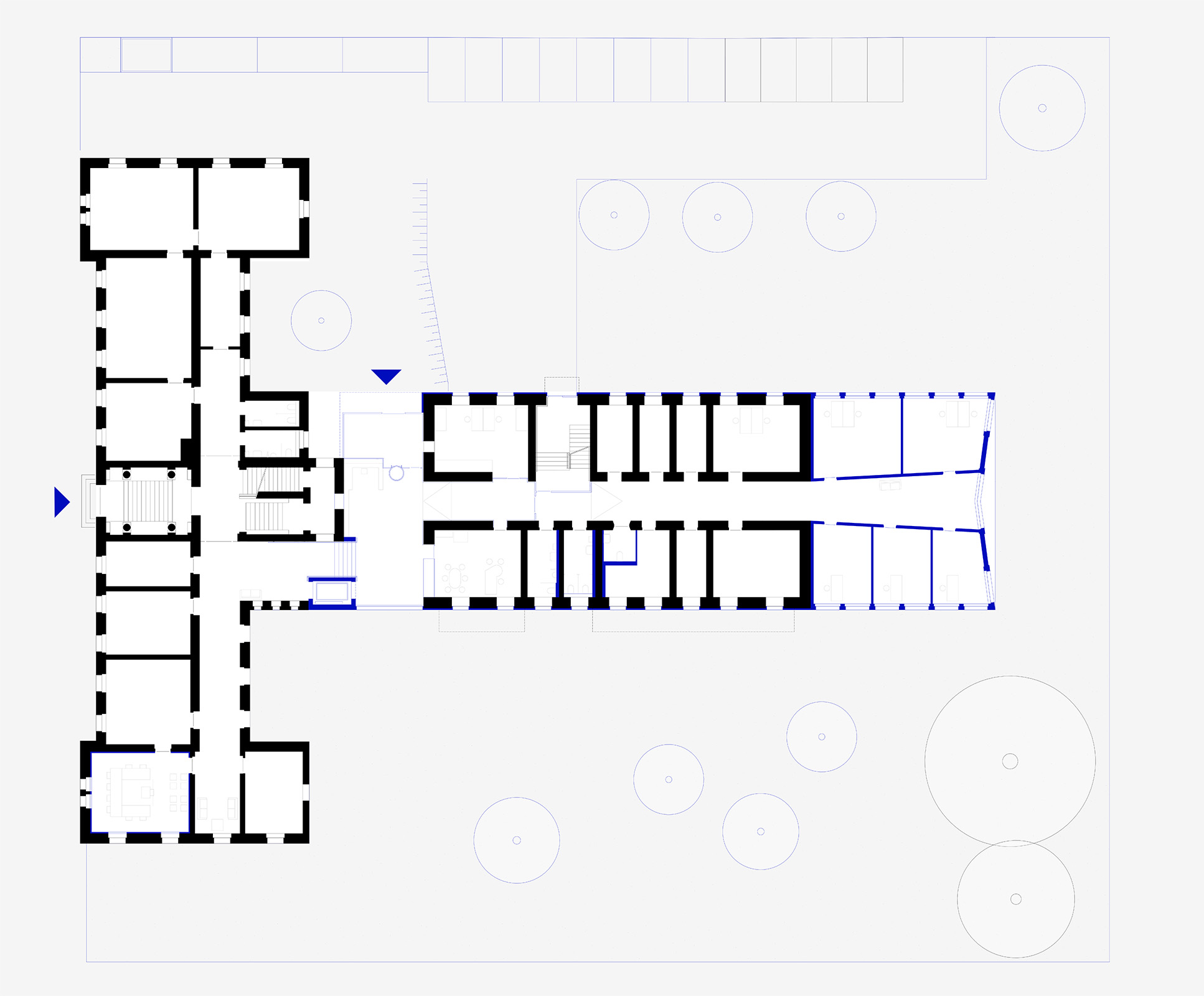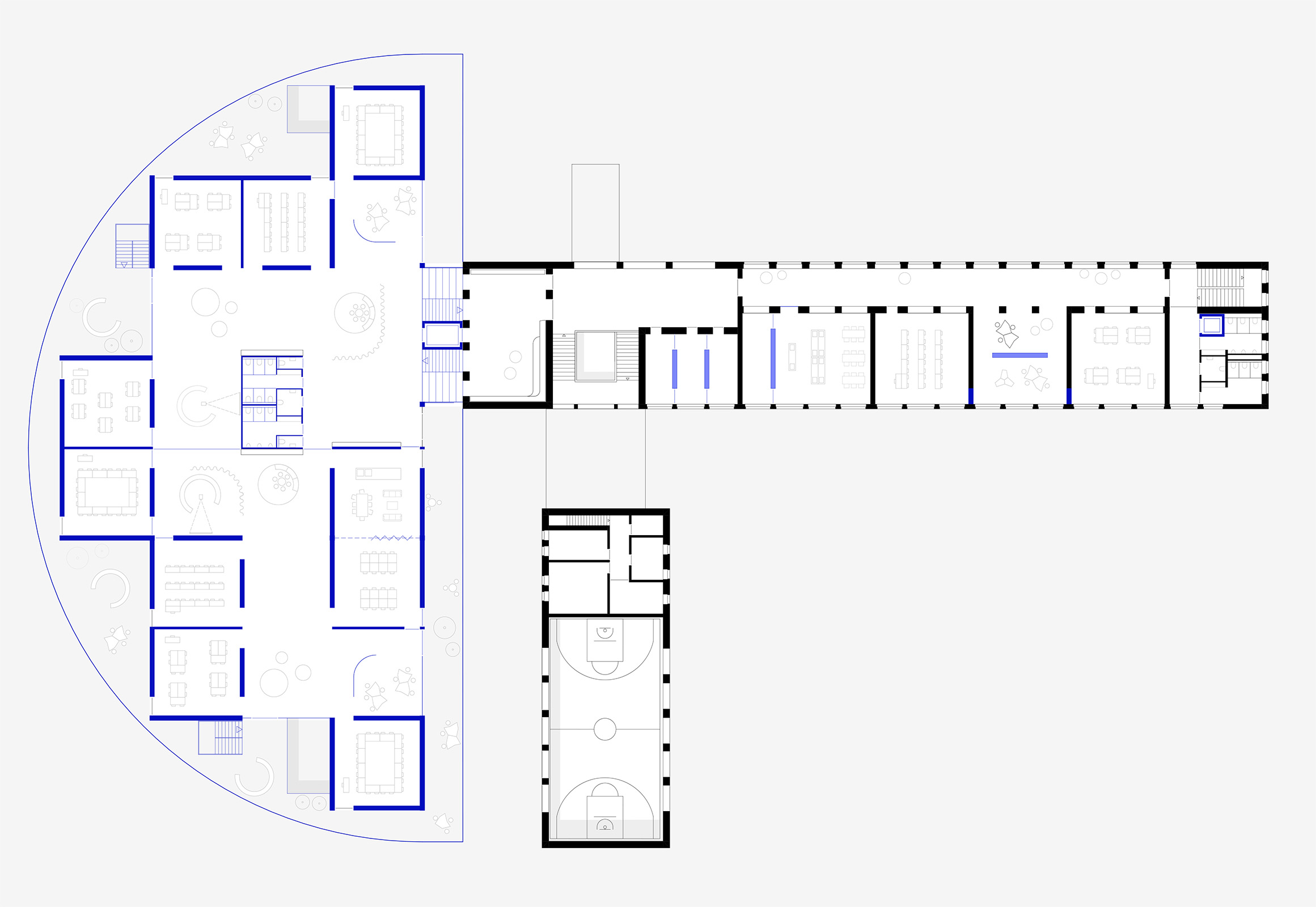 Um den Schulhof in seiner ursprünglichen prägnanten Platzsituation mit der Burkhardvilla zu erhalten, erfolgte der Zubau ausschließlich im westlichen Bereich des Grundstückes. Das Souterrain wurde Richtung Westen fortgeführt und fungiert als Sockel für die L-förmige Erweiterung, die sich in einer geschoßweisen Höhenstaffelung an den Bestand und an die Grundgrenzen anfügt. Der einzige geringfügige Eingriff auf der Ostseite des Bestandsgebäudes betrifft die Eingangssituation: Eine breite Rampenanlage führt nun barrierefrei auf das Niveau des Souterrains zum Haupteingang für die Schüler:innen und weiter zu den Zentralgarderoben.