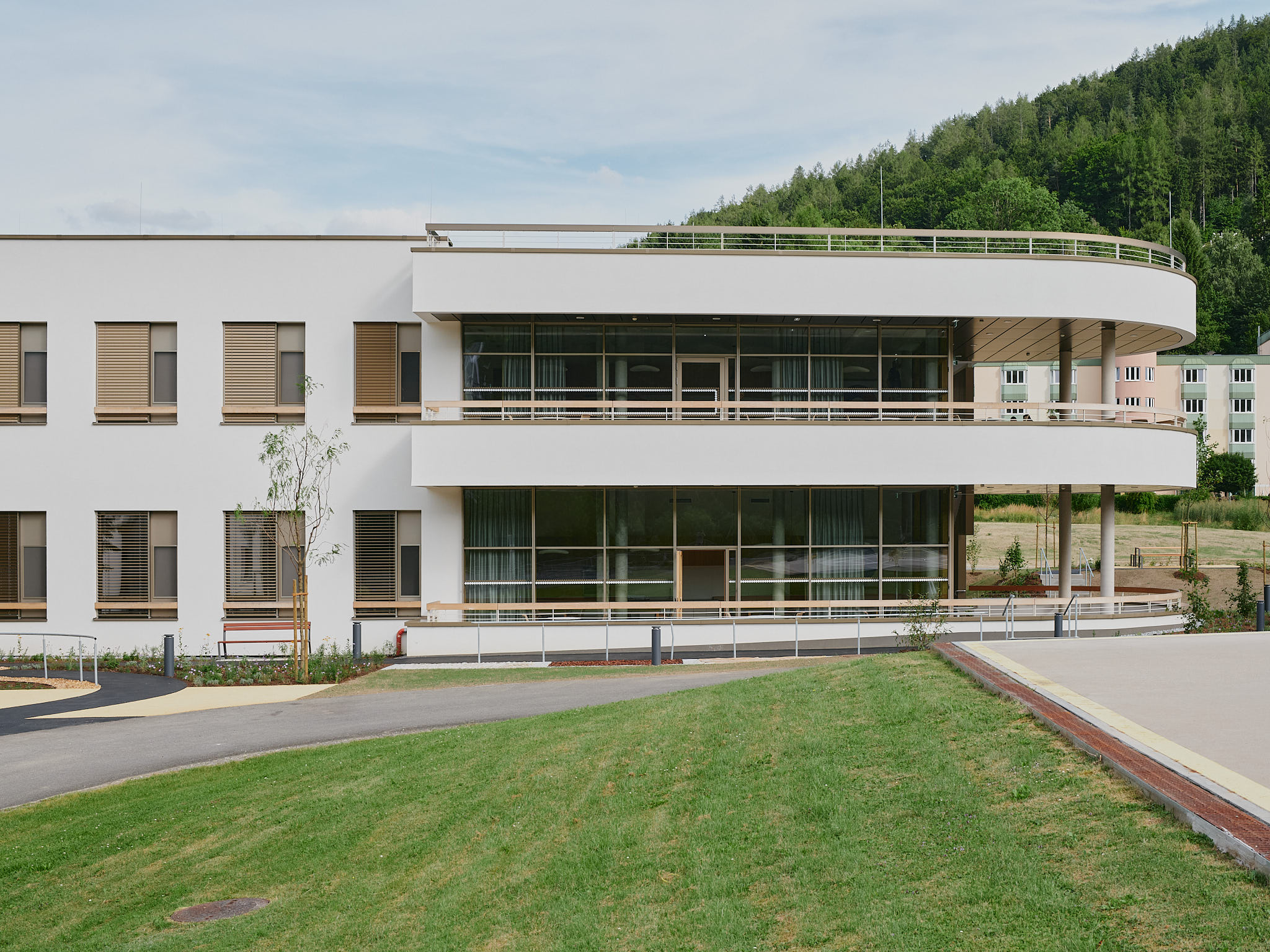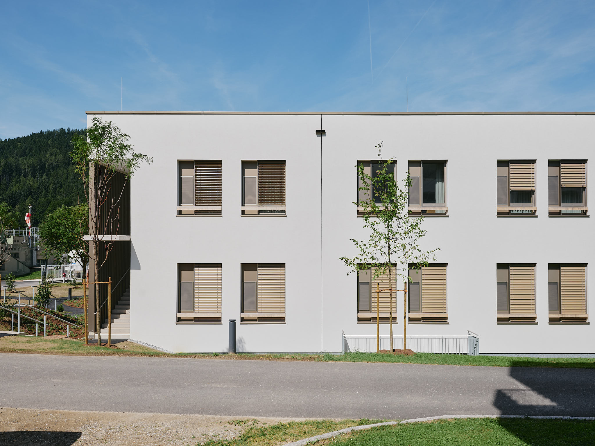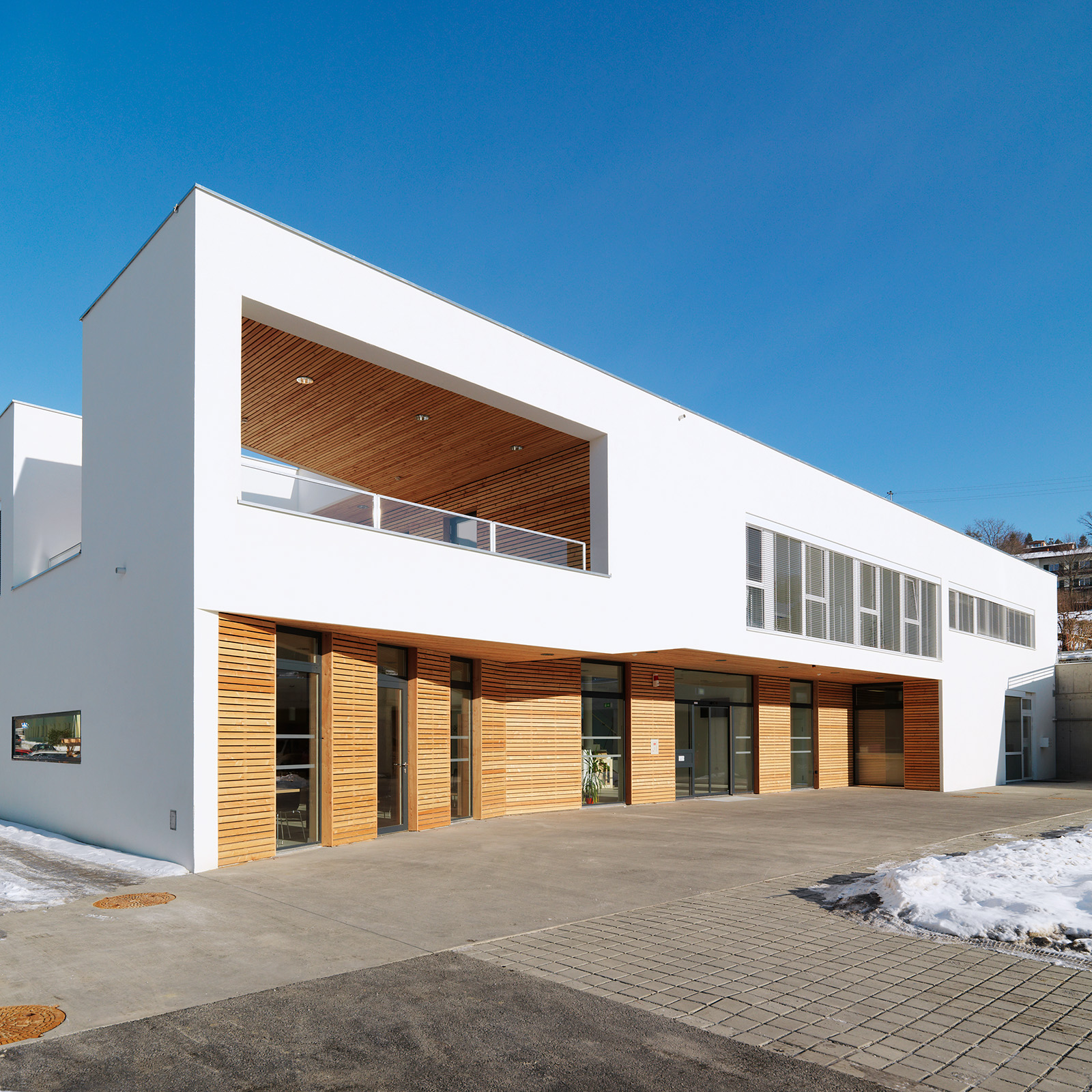 Die neue Tageswerkstätte stellt sich als klarer kubischer Baukörper dar und weckt nicht zuletzt durch die Verwendung von Bandfenstern und weißem Putz Erinnerungen an die elegante Gestaltung der Wohn-, Gesundheits- und Freizeitbauten der klassischen Moderne. Akzentuiert werden die Fassaden durch Einschnitte, welche durch ihre Holzverkleidung gewissermaßen einen weichen Kern des Volumens andeuten.
