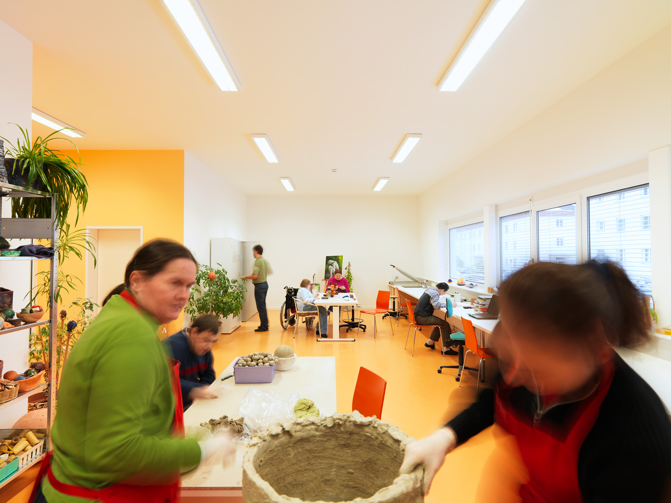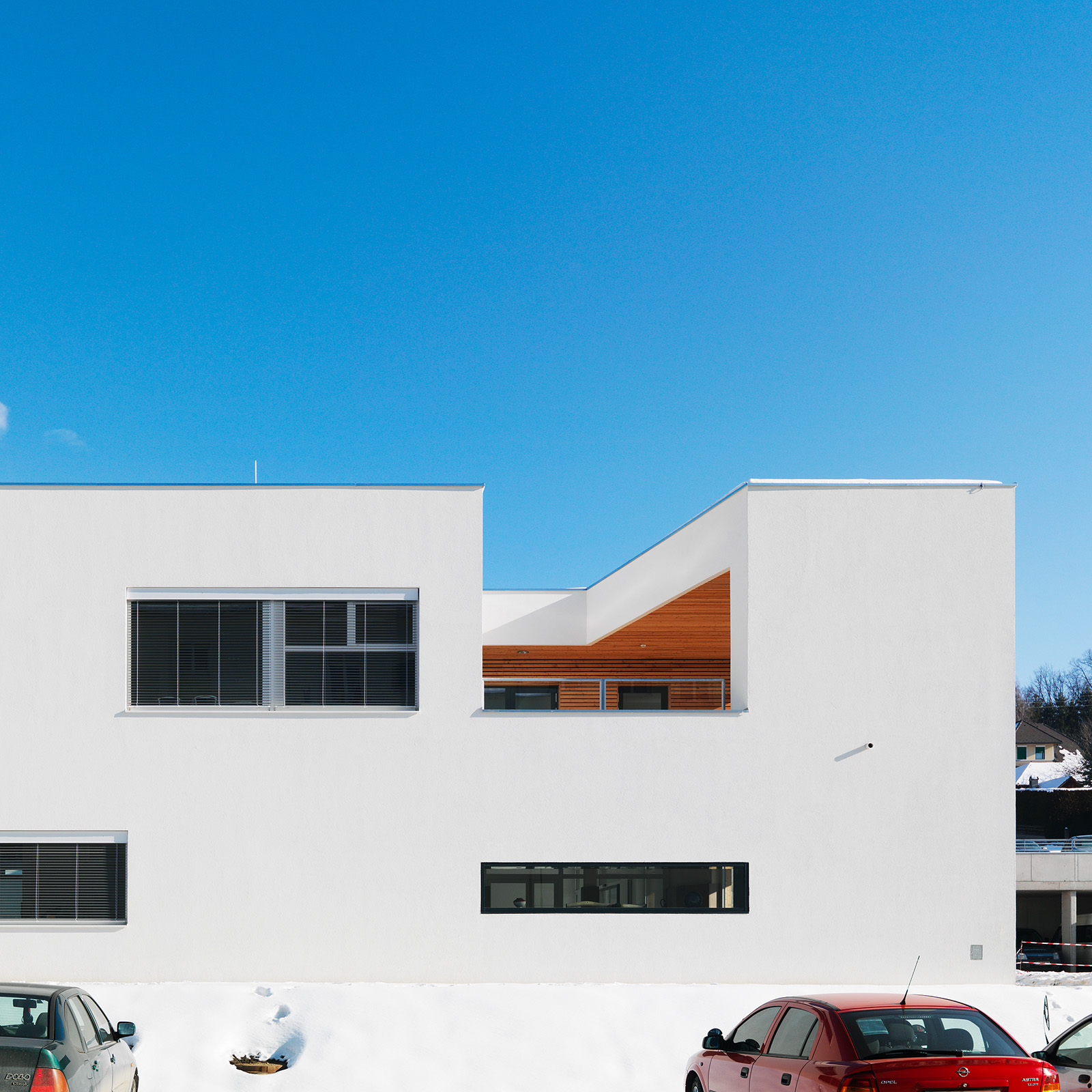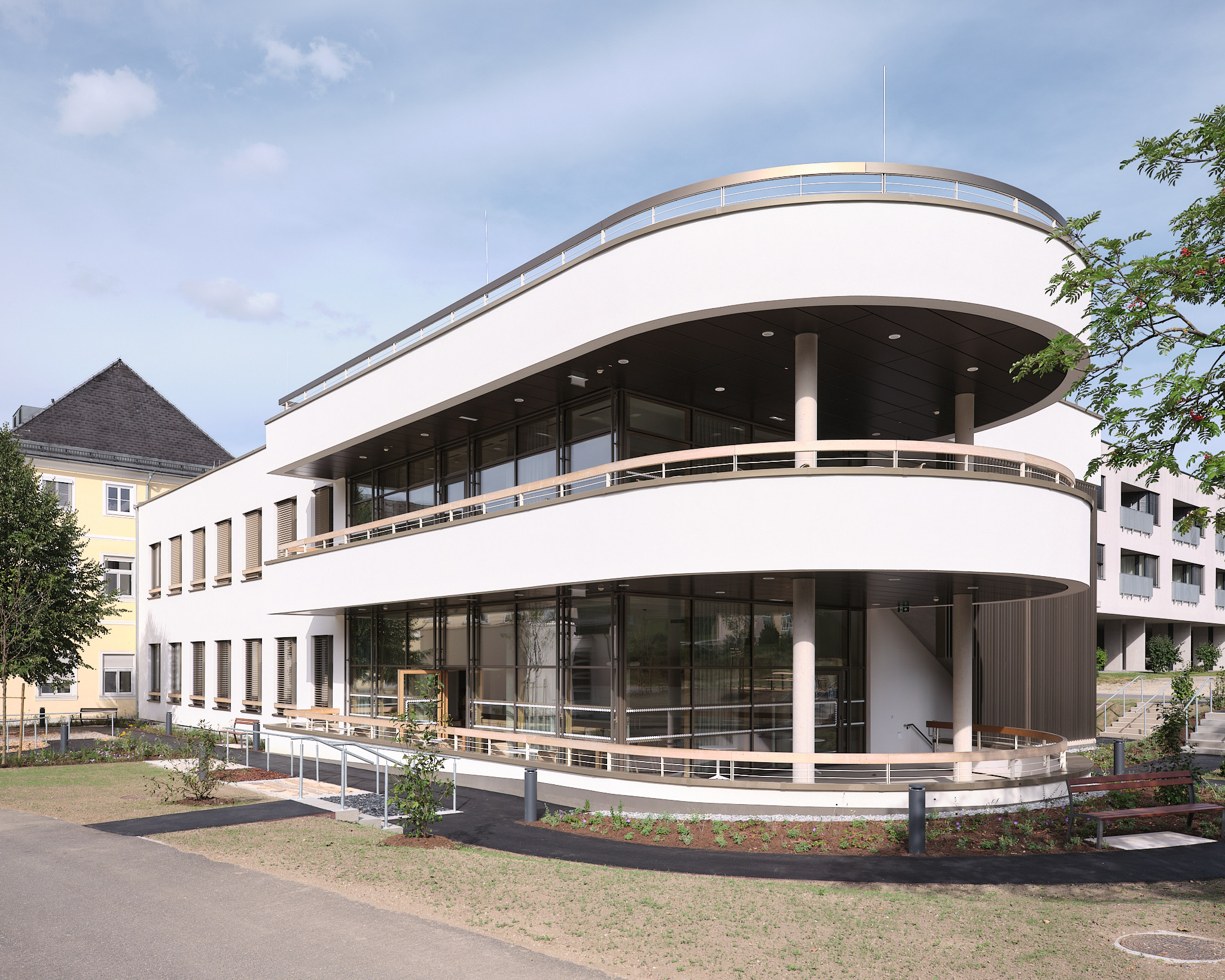 Die neue Tageswerkstätte stellt sich als klarer kubischer Baukörper dar und weckt nicht zuletzt durch die Verwendung von Bandfenstern und weißem Putz Erinnerungen an die elegante Gestaltung der Wohn-, Gesundheits- und Freizeitbauten der klassischen Moderne. Akzentuiert werden die Fassaden durch Einschnitte, welche durch ihre Holzverkleidung gewissermaßen einen weichen Kern des Volumens andeuten.