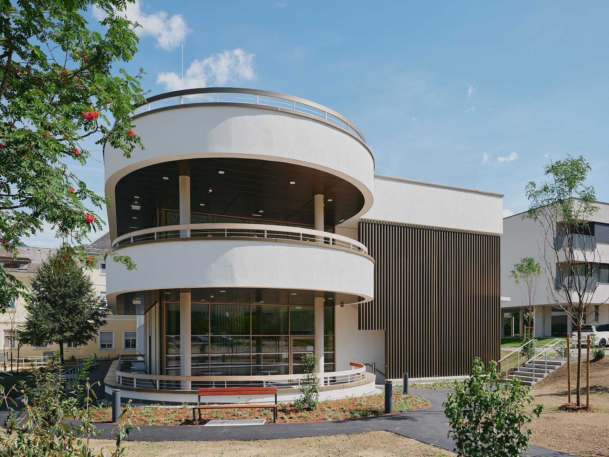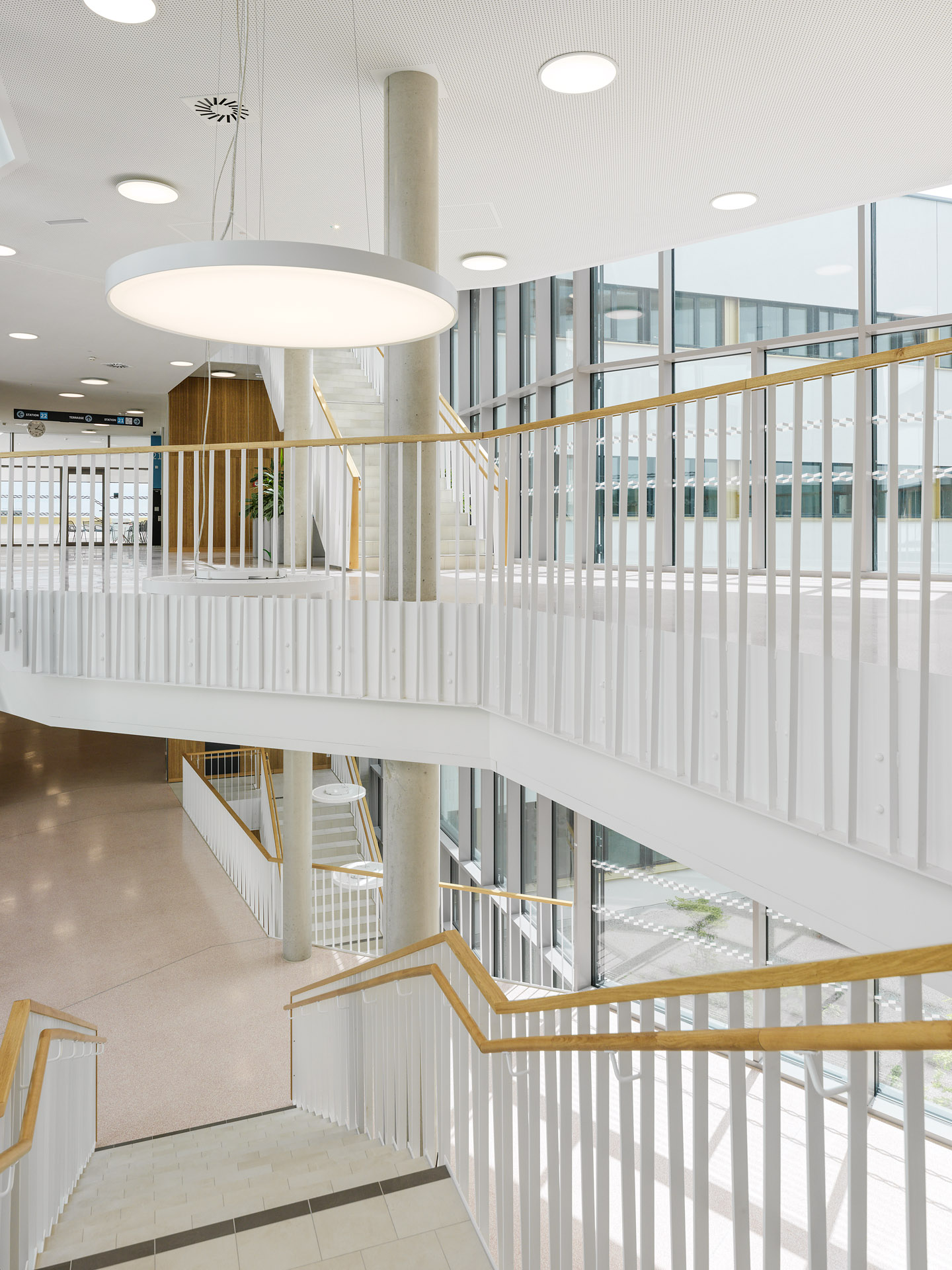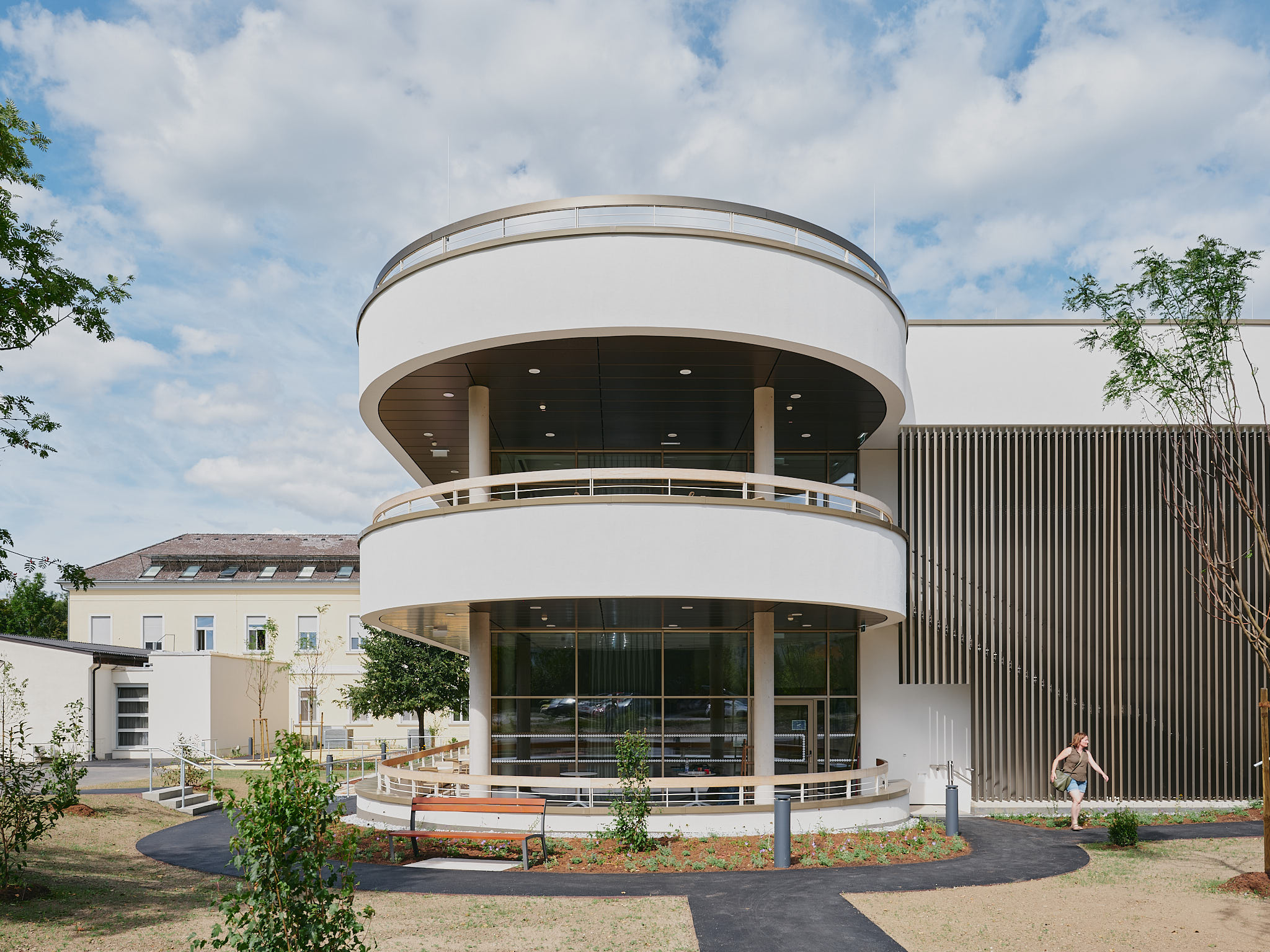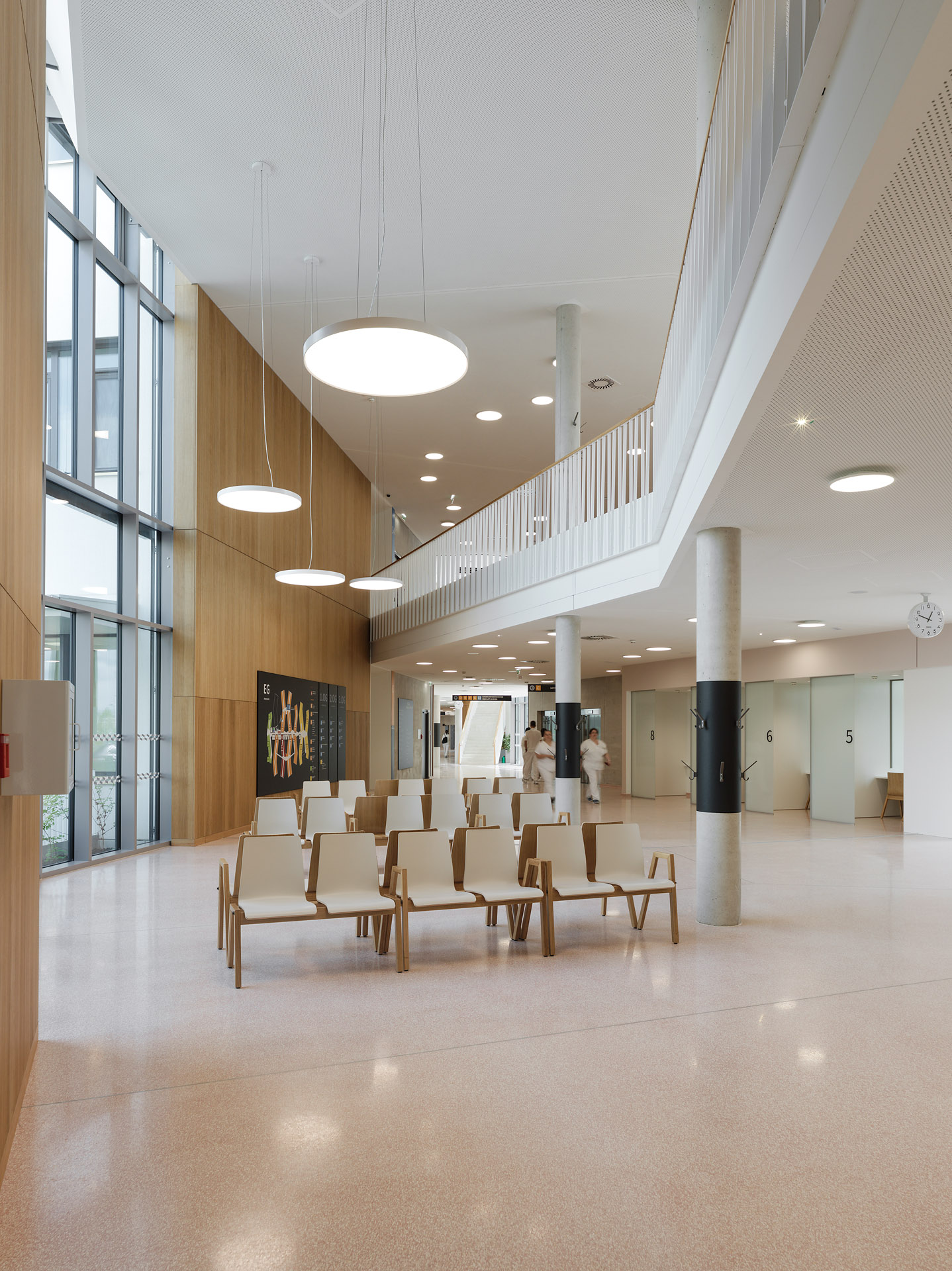 Die neu errichtete Klinik Oberwart bietet mit ihren schlanken, zueinander verschränkten Baukörpern einen lichtdurchfluteten und abwechslungsreichen Rahmen für die vielfältigen Behandlungs- und Pflegeaufgaben eines modernen Krankenhauses. Hauptmagistrale, Nebenmagistralen und Gänge bilden kleinteilige, helle Verteiler-, Warte- und Kommunikationsräume, die auch an dunklen und nassen Tagen zu Bewegung und sozialem Austausch einladen. Mehrgeschoßige Licht-, Luft- und Blickverbindungen fassen mit sanft ansteigenden Treppenanlagen das Gebäude über mehrere Geschoße hinweg zu einer großen Einheit zusammen.