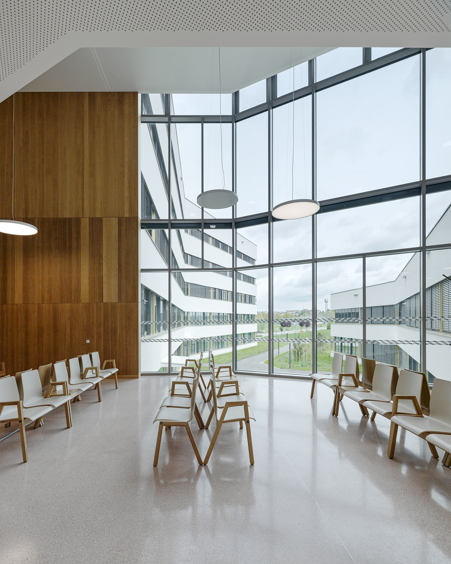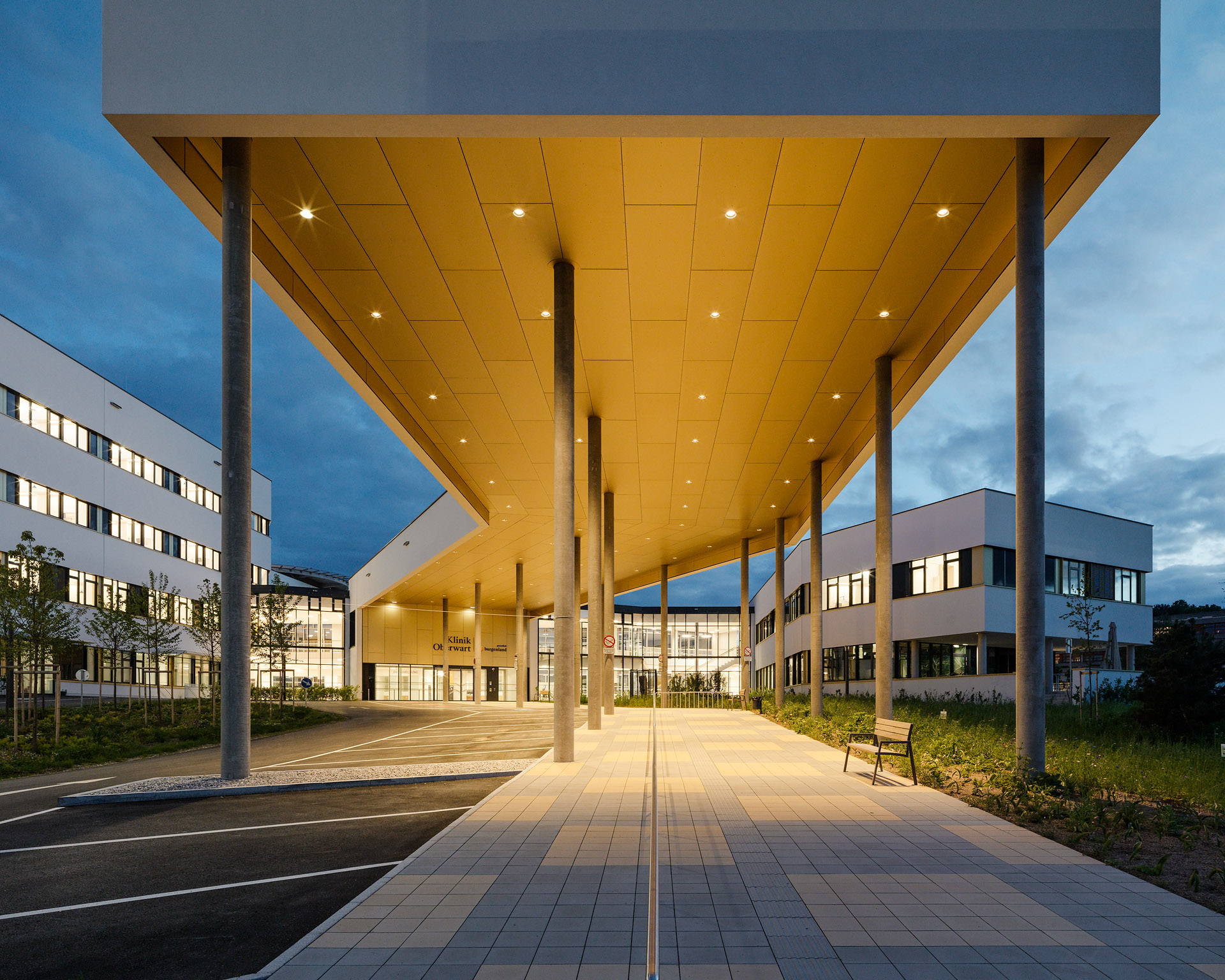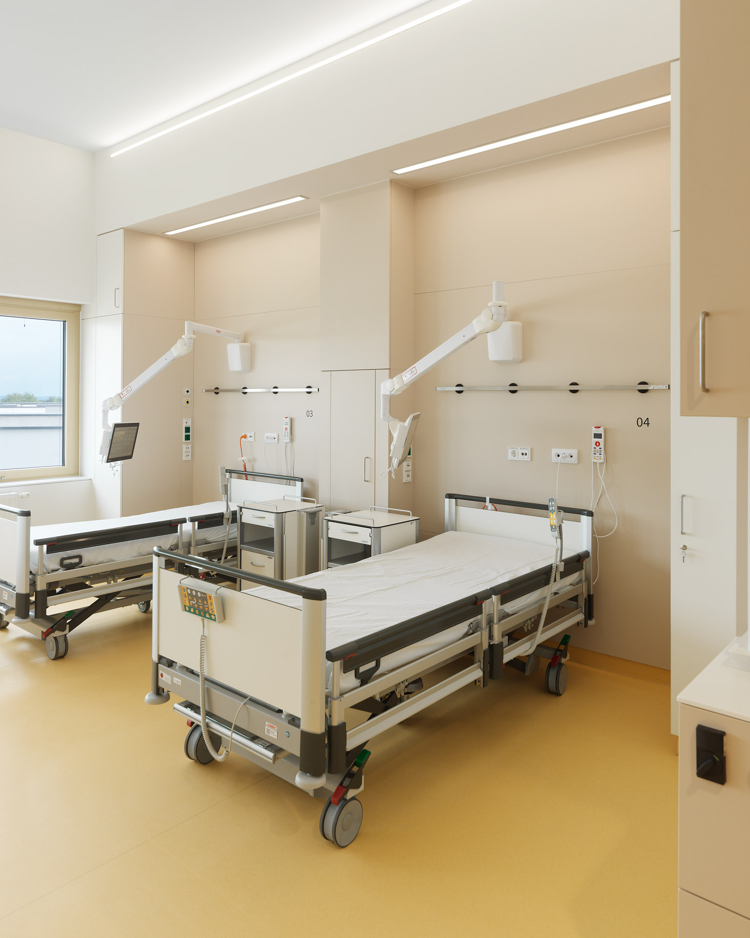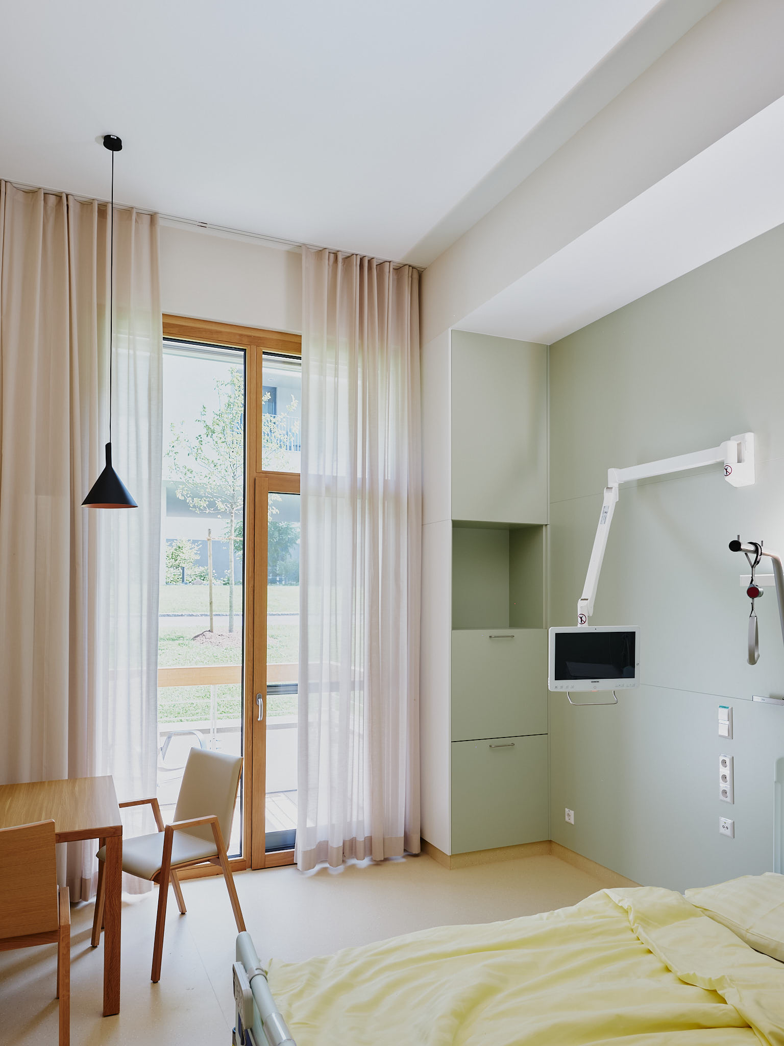 Die neu errichtete Klinik Oberwart bietet mit ihren schlanken, zueinander verschränkten Baukörpern einen lichtdurchfluteten und abwechslungsreichen Rahmen für die vielfältigen Behandlungs- und Pflegeaufgaben eines modernen Krankenhauses. Hauptmagistrale, Nebenmagistralen und Gänge bilden kleinteilige, helle Verteiler-, Warte- und Kommunikationsräume, die auch an dunklen und nassen Tagen zu Bewegung und sozialem Austausch einladen. Mehrgeschoßige Licht-, Luft- und Blickverbindungen fassen mit sanft ansteigenden Treppenanlagen das Gebäude über mehrere Geschoße hinweg zu einer großen Einheit zusammen.