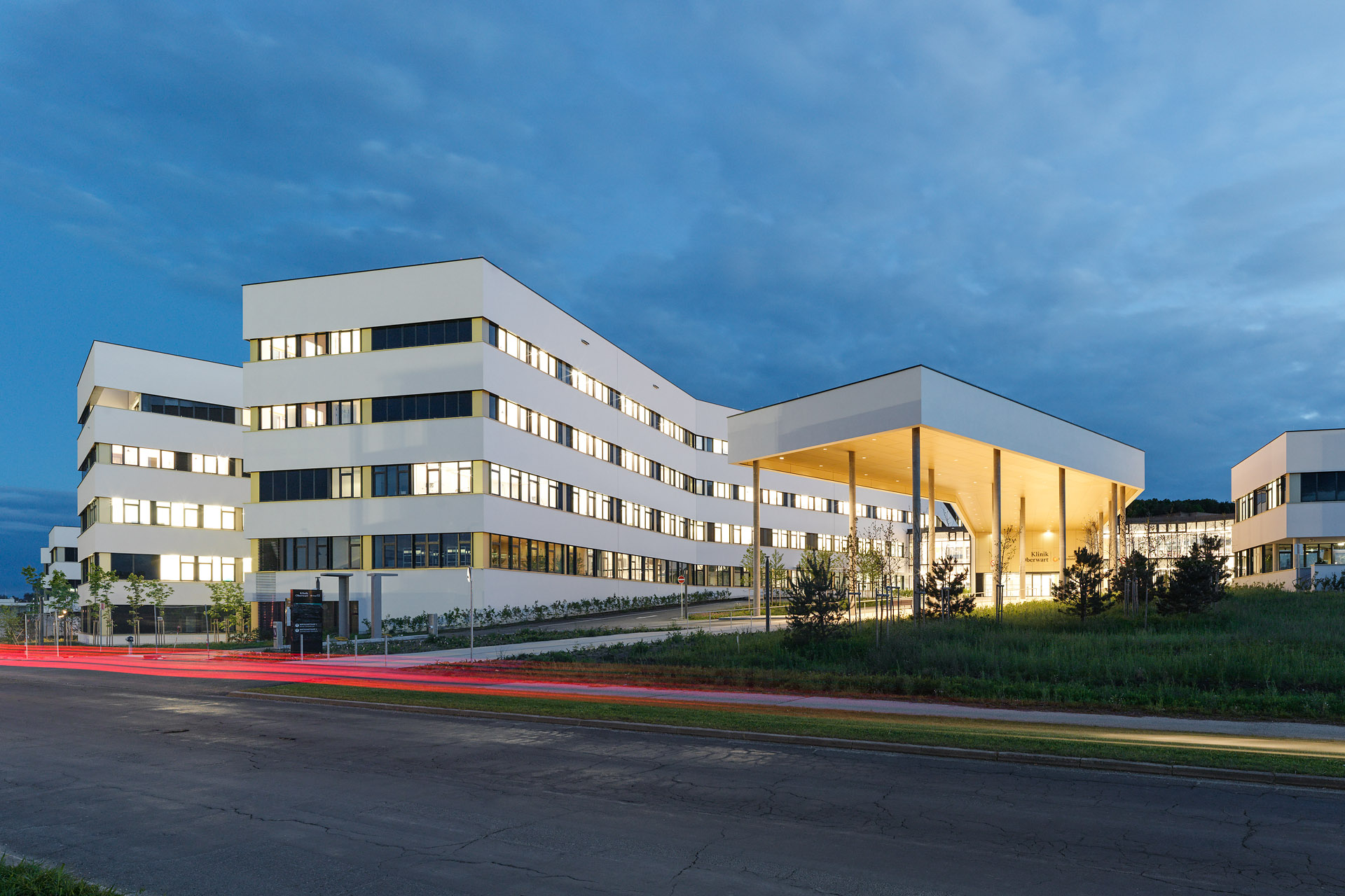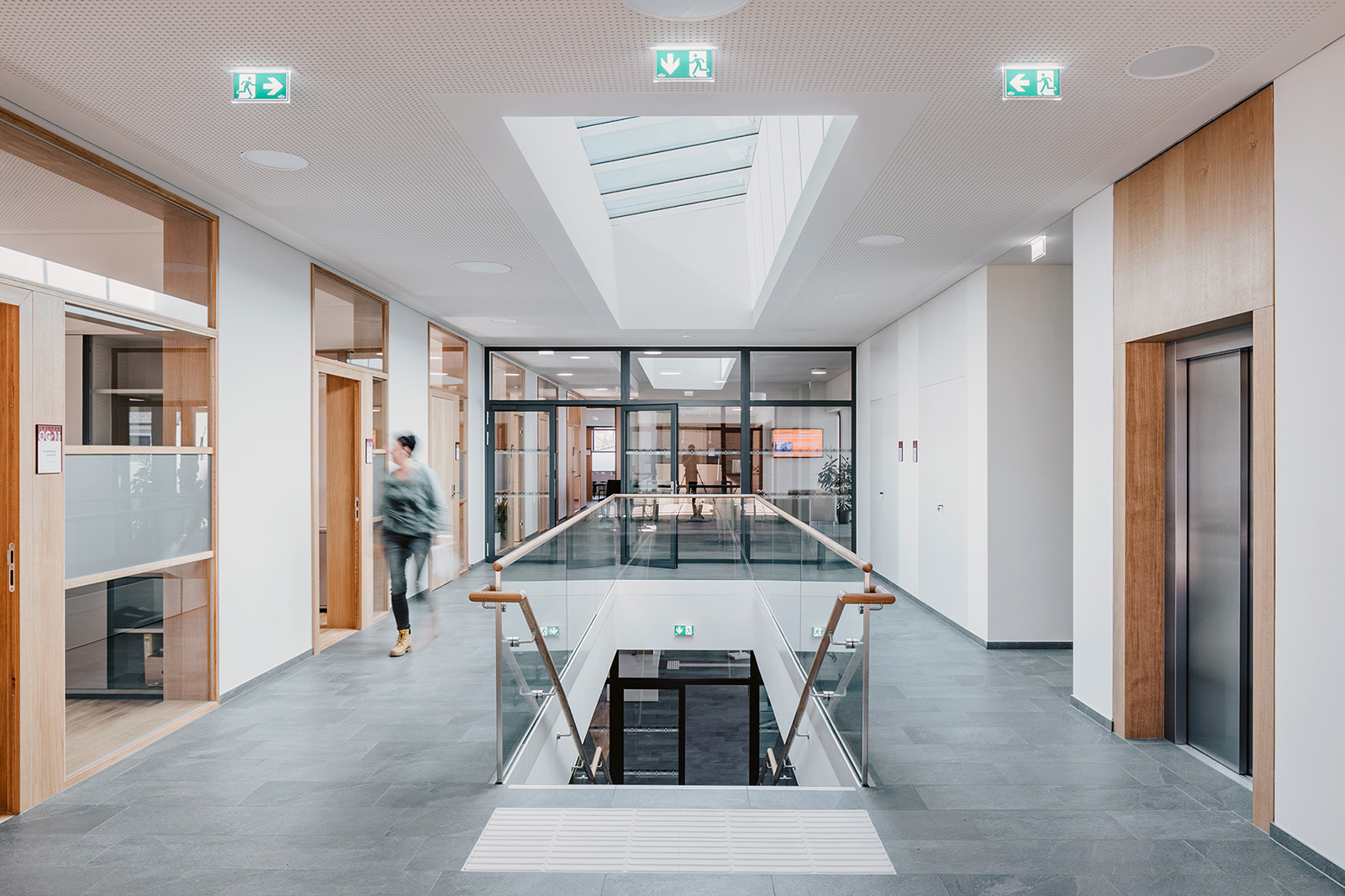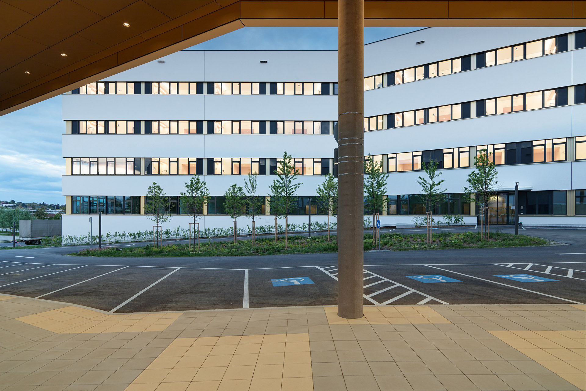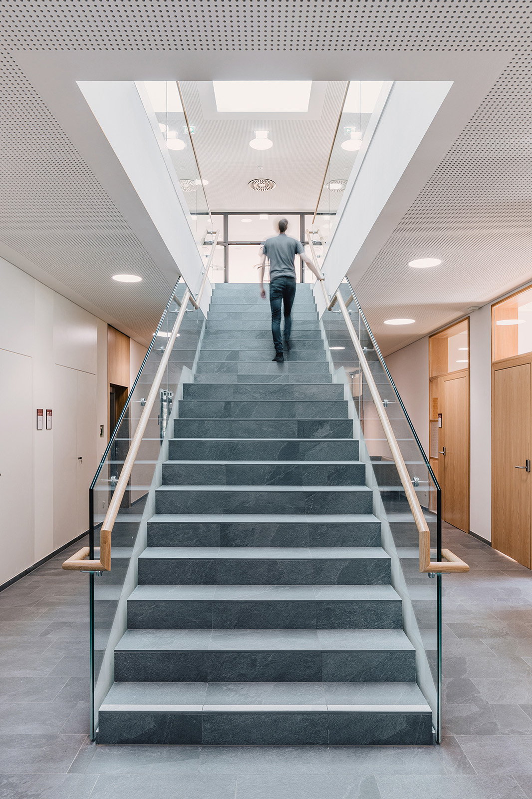 Die neu errichtete Klinik Oberwart bietet mit ihren schlanken, zueinander verschränkten Baukörpern einen lichtdurchfluteten und abwechslungsreichen Rahmen für die vielfältigen Behandlungs- und Pflegeaufgaben eines modernen Krankenhauses. Hauptmagistrale, Nebenmagistralen und Gänge bilden kleinteilige, helle Verteiler-, Warte- und Kommunikationsräume, die auch an dunklen und nassen Tagen zu Bewegung und sozialem Austausch einladen. Mehrgeschoßige Licht-, Luft- und Blickverbindungen fassen mit sanft ansteigenden Treppenanlagen das Gebäude über mehrere Geschoße hinweg zu einer großen Einheit zusammen.