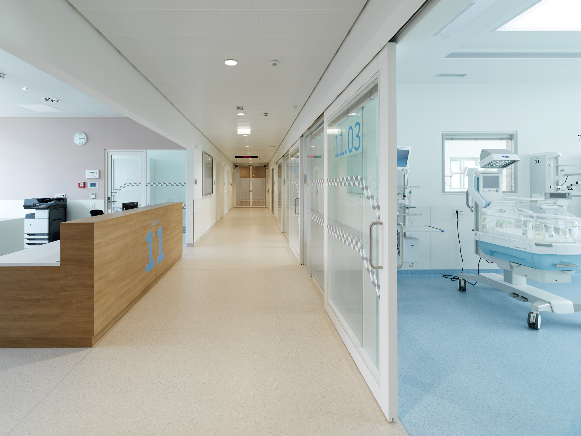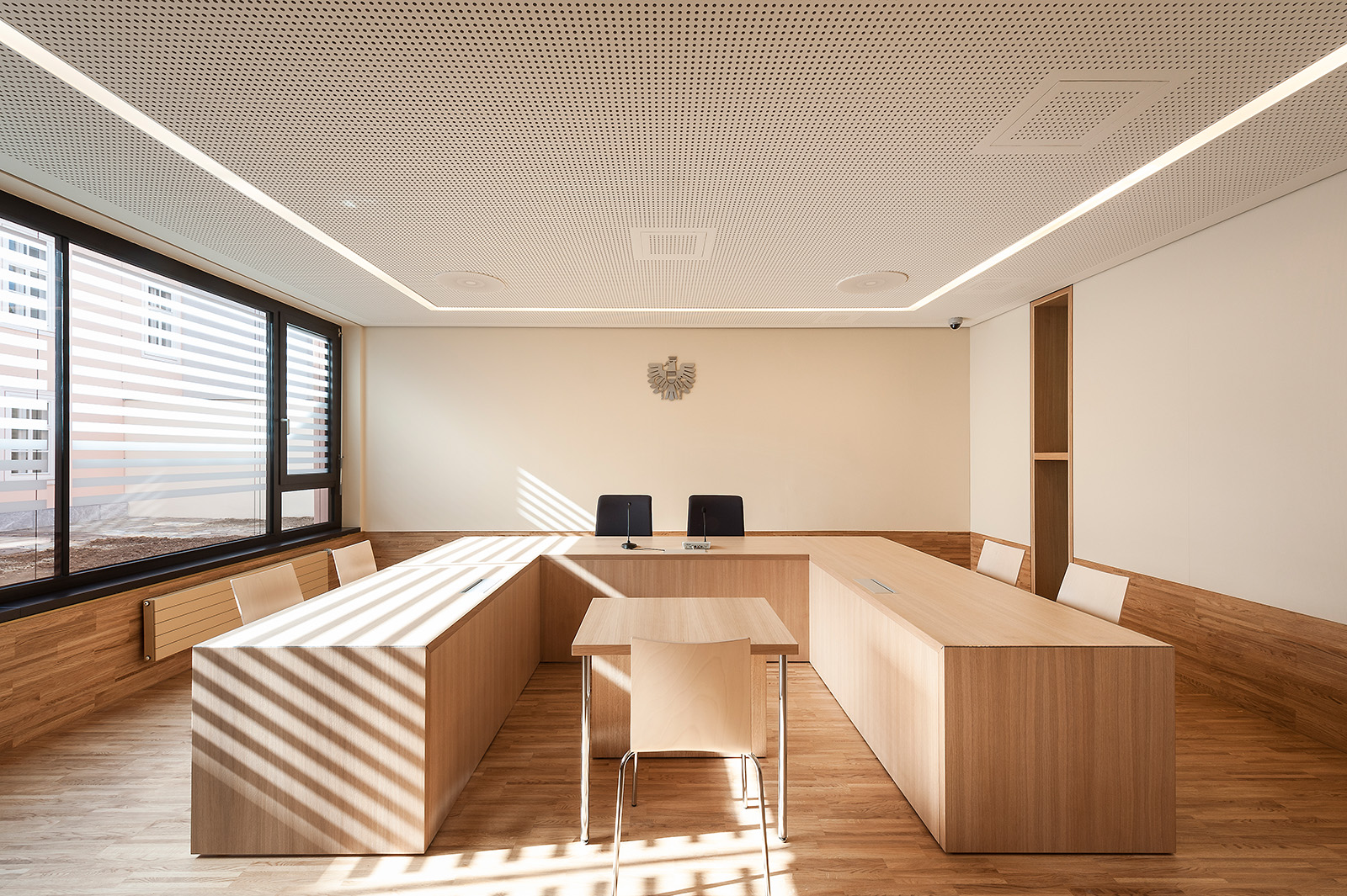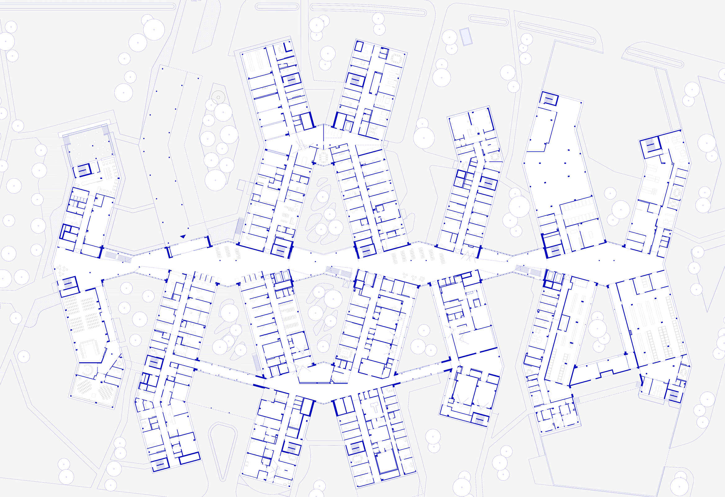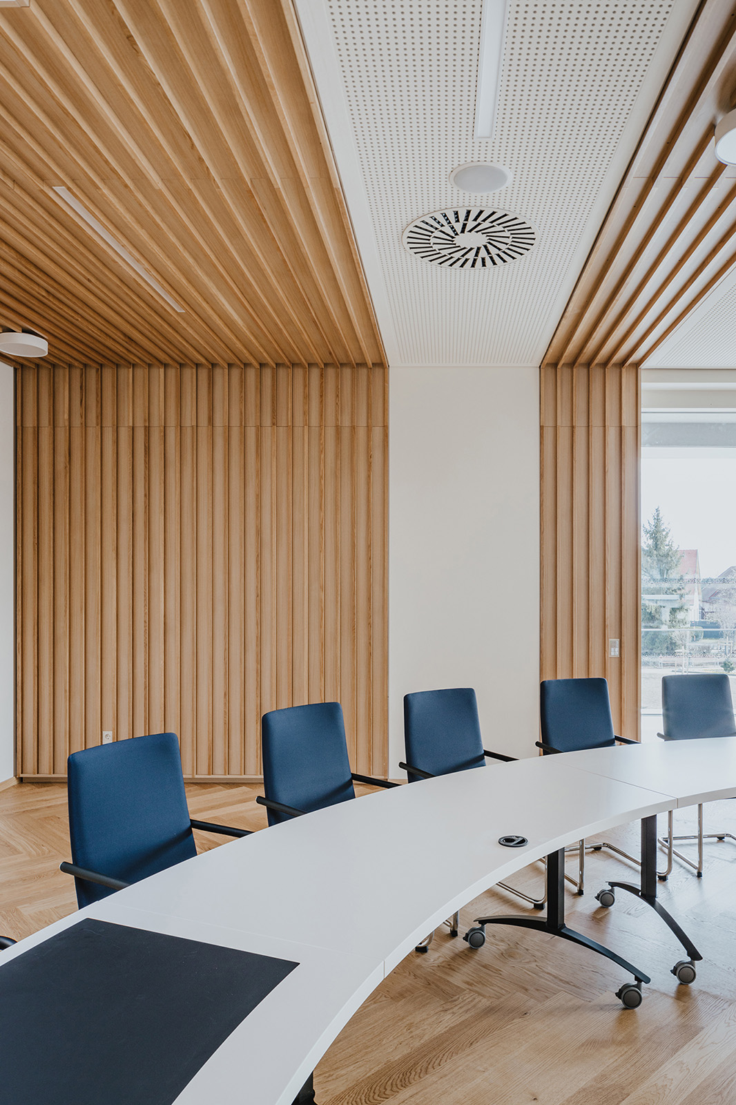 Die neu errichtete Klinik Oberwart bietet mit ihren schlanken, zueinander verschränkten Baukörpern einen lichtdurchfluteten und abwechslungsreichen Rahmen für die vielfältigen Behandlungs- und Pflegeaufgaben eines modernen Krankenhauses. Hauptmagistrale, Nebenmagistralen und Gänge bilden kleinteilige, helle Verteiler-, Warte- und Kommunikationsräume, die auch an dunklen und nassen Tagen zu Bewegung und sozialem Austausch einladen. Mehrgeschoßige Licht-, Luft- und Blickverbindungen fassen mit sanft ansteigenden Treppenanlagen das Gebäude über mehrere Geschoße hinweg zu einer großen Einheit zusammen.