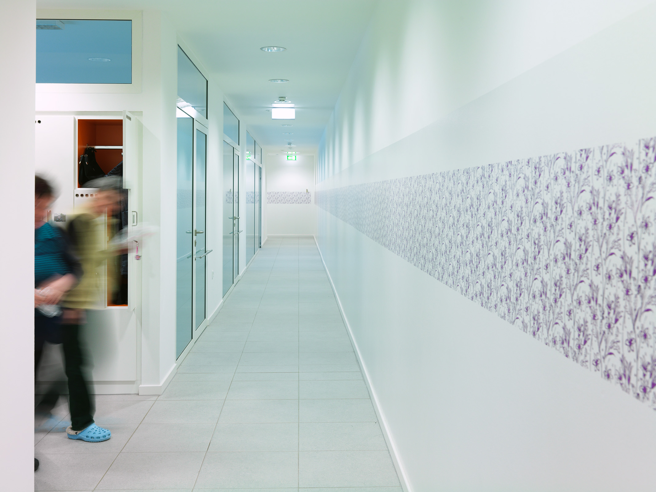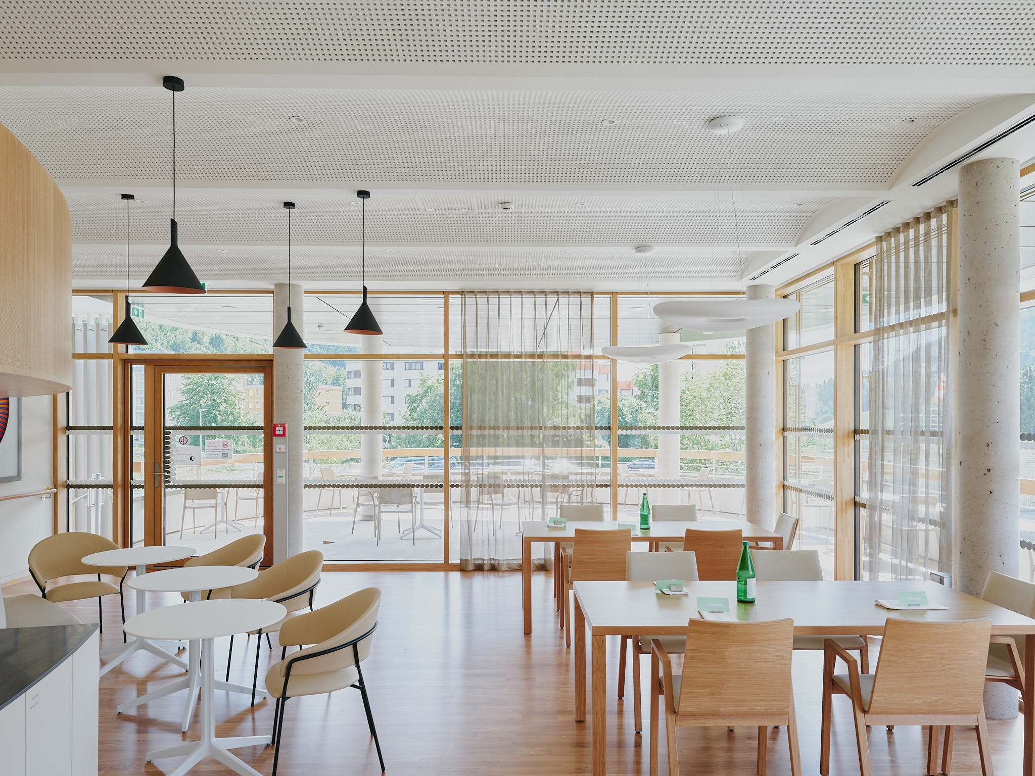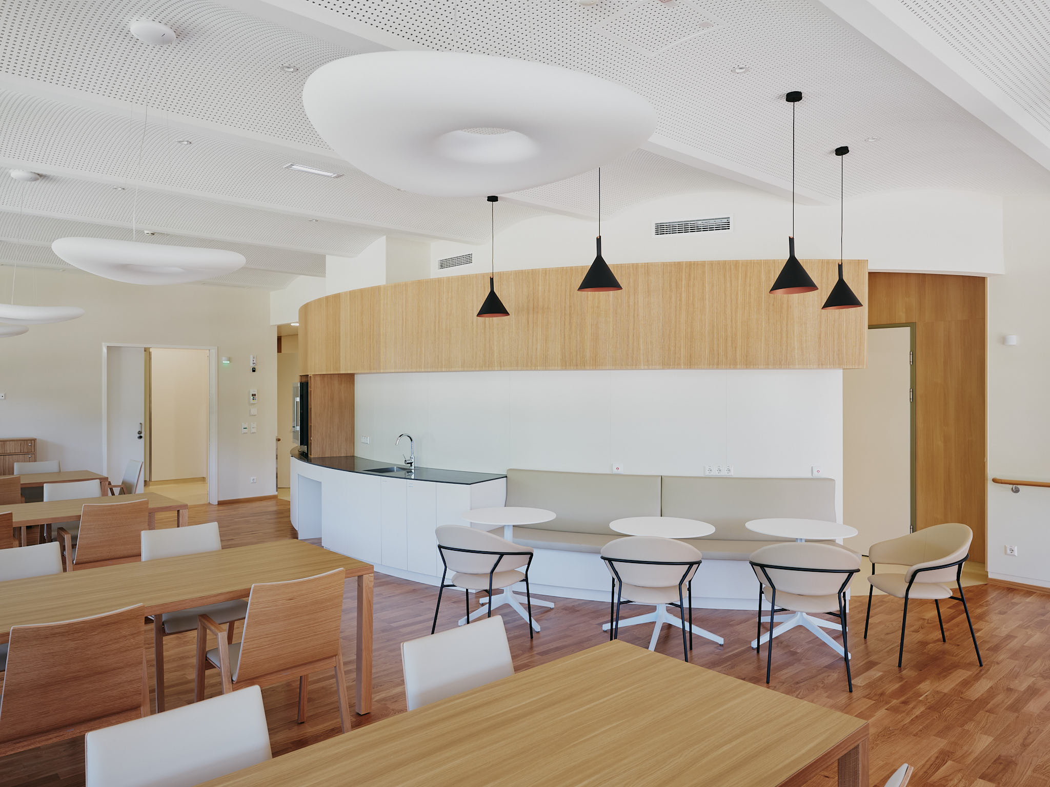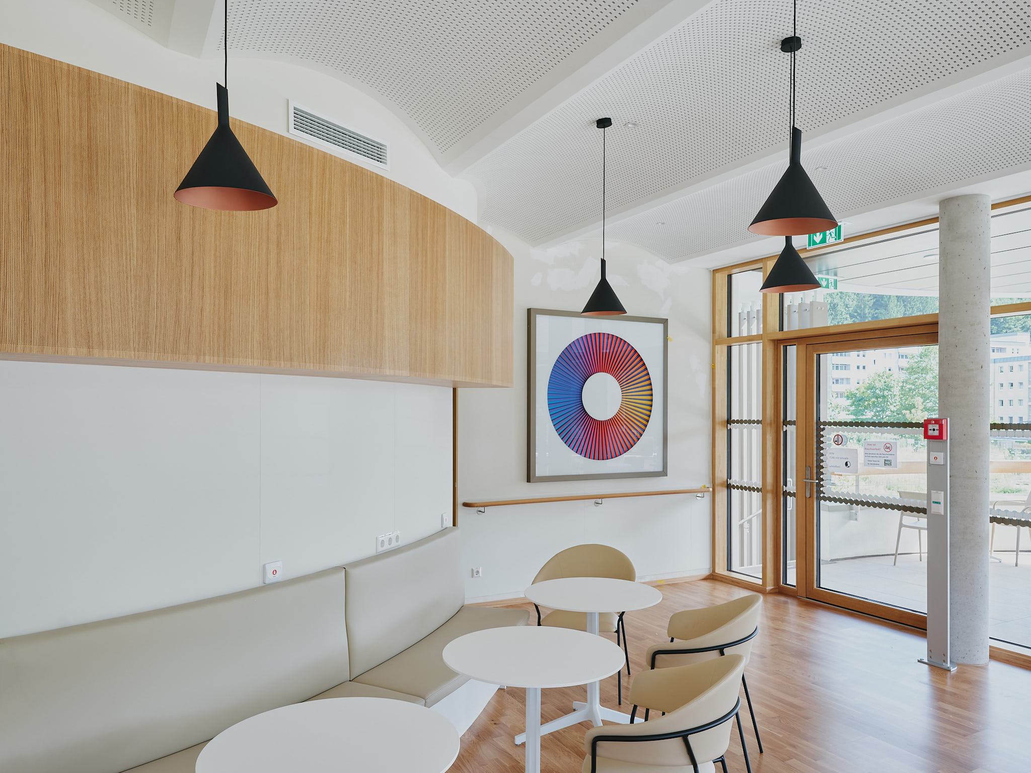 Die Neuorganisation vom Speisesaal mit Lounge und dem Stützpunkt bietet die Chance die Station neu zu strukturieren. Großzügige Räume mit angenehm wohnlicher Farbgebung markieren den Anfang und das Ende der internen Erschließungsachse, sie stellen Übersichtlichkeit und leichte Orientierung sicher, was für Geriatriepatienten besonders wichtig ist. Gute Akustik, ausreichende Kontraste und weitgehend natürliche Materialen, die auch die privaten Wohnräume der Patienten prägen, kommen zu Einsatz.