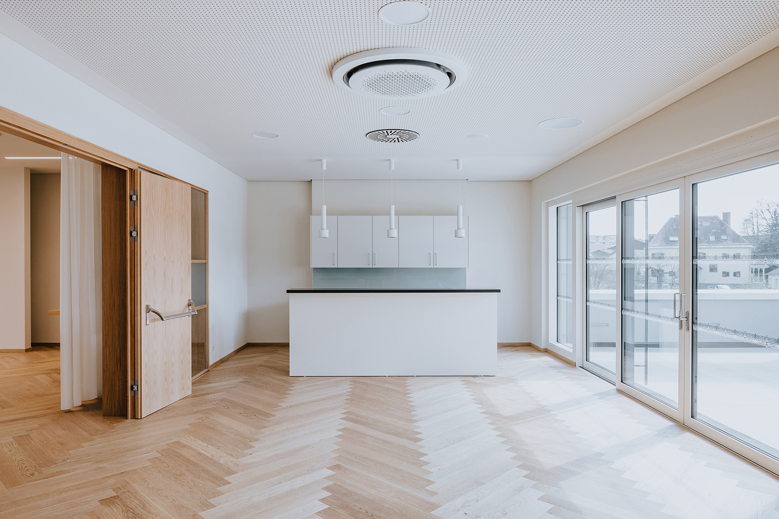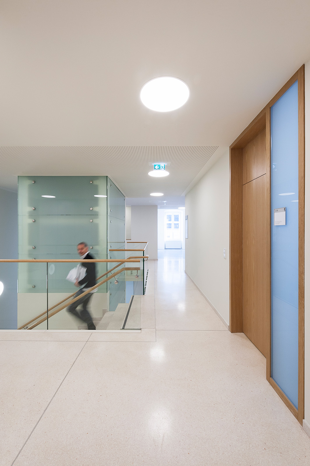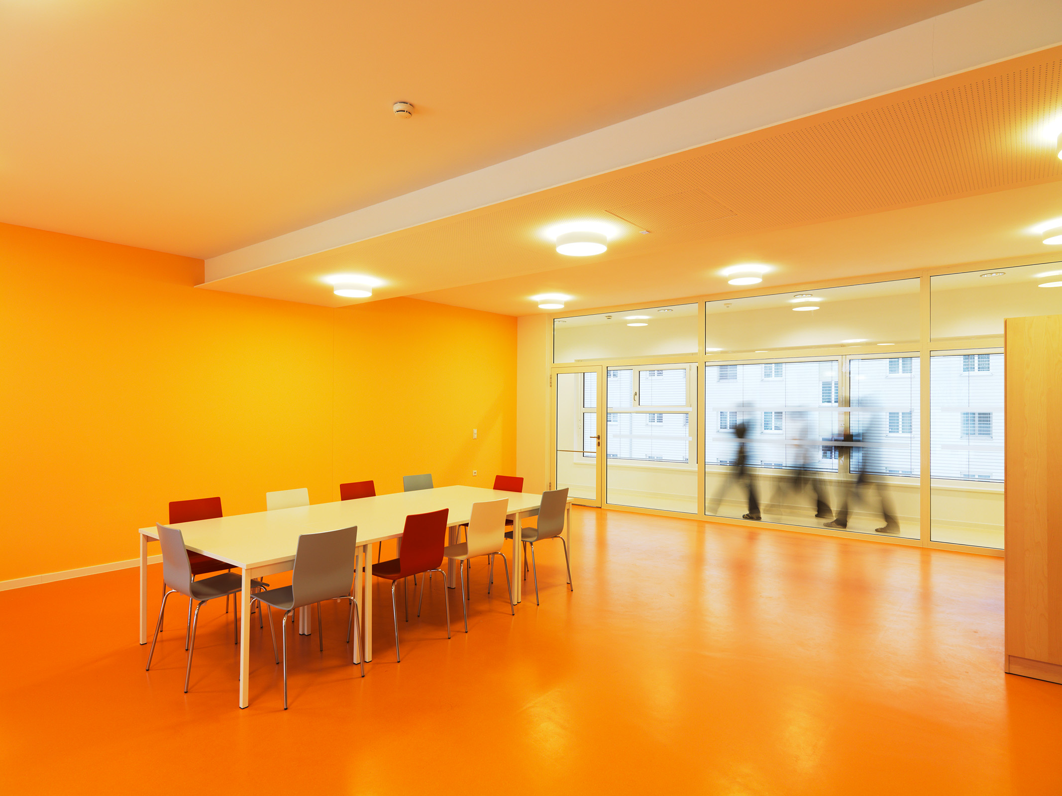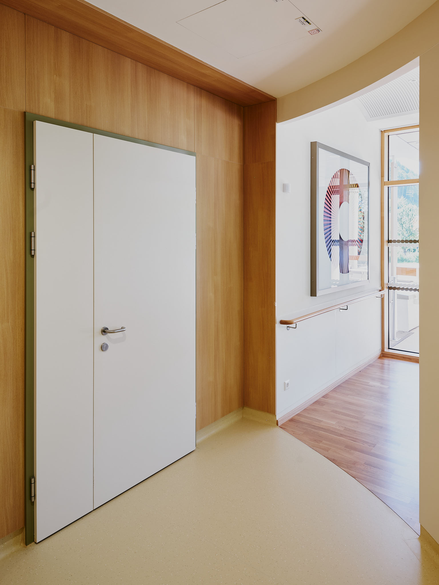 Die Neuorganisation vom Speisesaal mit Lounge und dem Stützpunkt bietet die Chance die Station neu zu strukturieren. Großzügige Räume mit angenehm wohnlicher Farbgebung markieren den Anfang und das Ende der internen Erschließungsachse, sie stellen Übersichtlichkeit und leichte Orientierung sicher, was für Geriatriepatienten besonders wichtig ist. Gute Akustik, ausreichende Kontraste und weitgehend natürliche Materialen, die auch die privaten Wohnräume der Patienten prägen, kommen zu Einsatz.