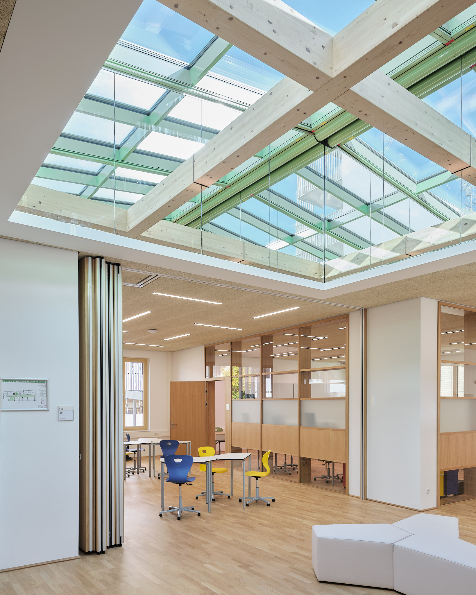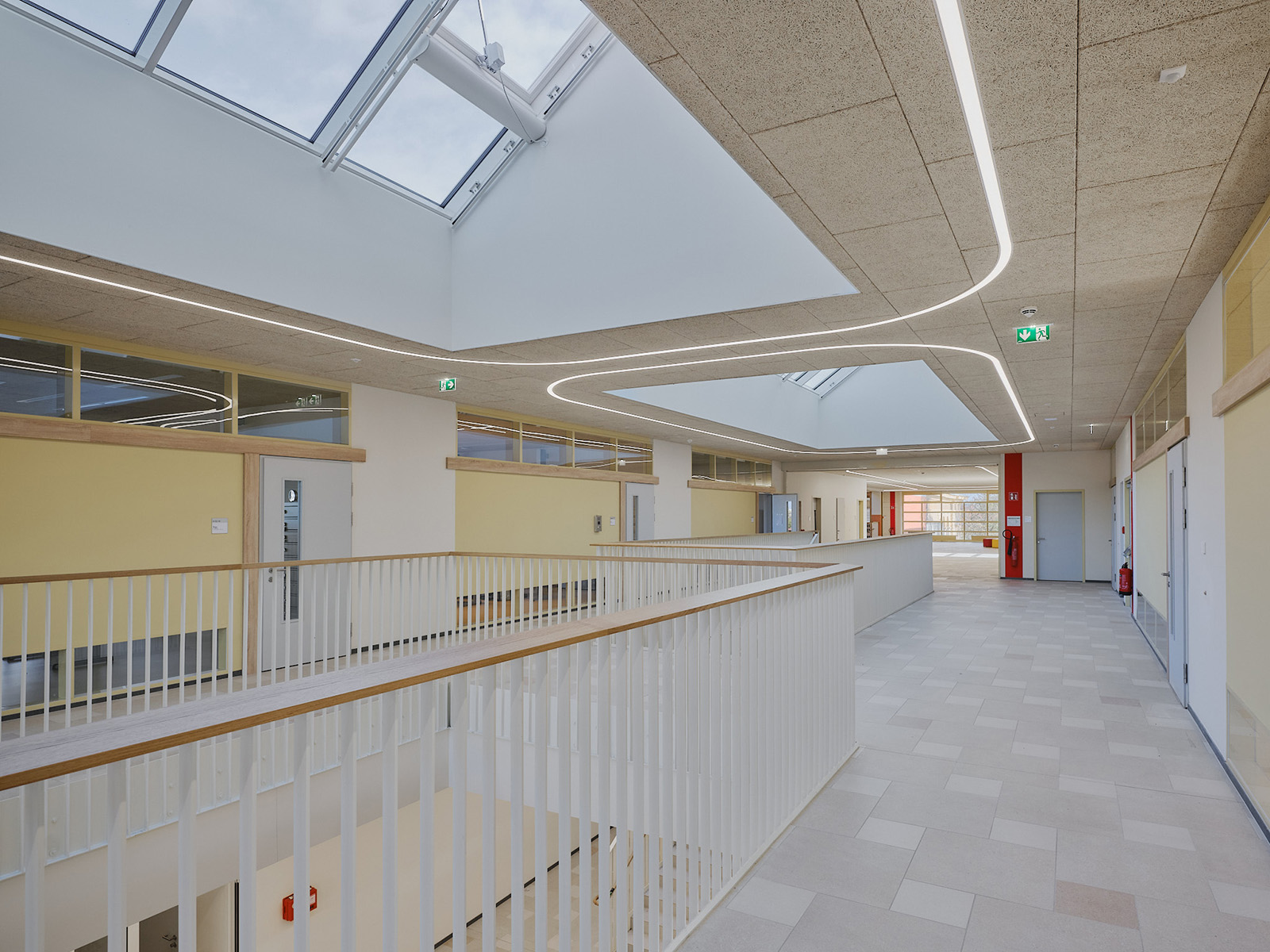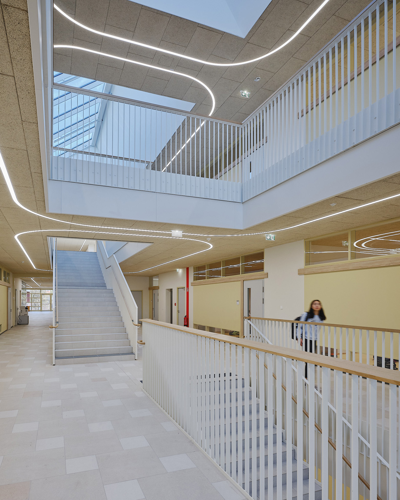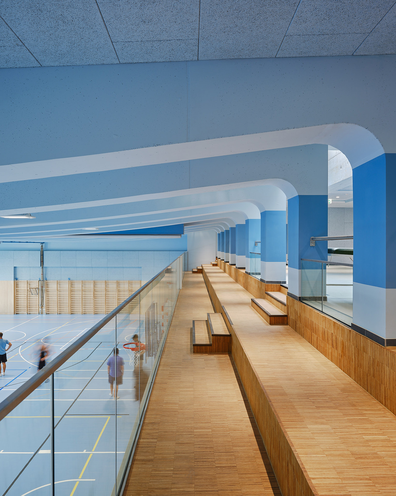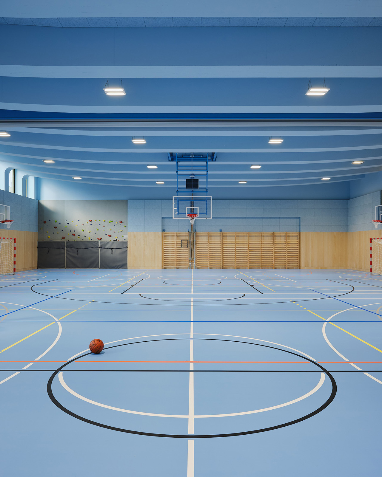 Einerseits wird so der neue, barrierefreie Haupteingang akzentuiert, ohne in Konkurrenz zum denkmalgeschützten Bestand zu treten. Andererseits spielt die markante Form ihre verbindende Komponente aus. Kontinuierlich spannt sich der prägende Schulfreiraum in einem Bogen vom Schulvorplatz an der Eduard Keil Gasse in den Schulgarten mit seinen Pausen-, Spiel- und Sportflächen.