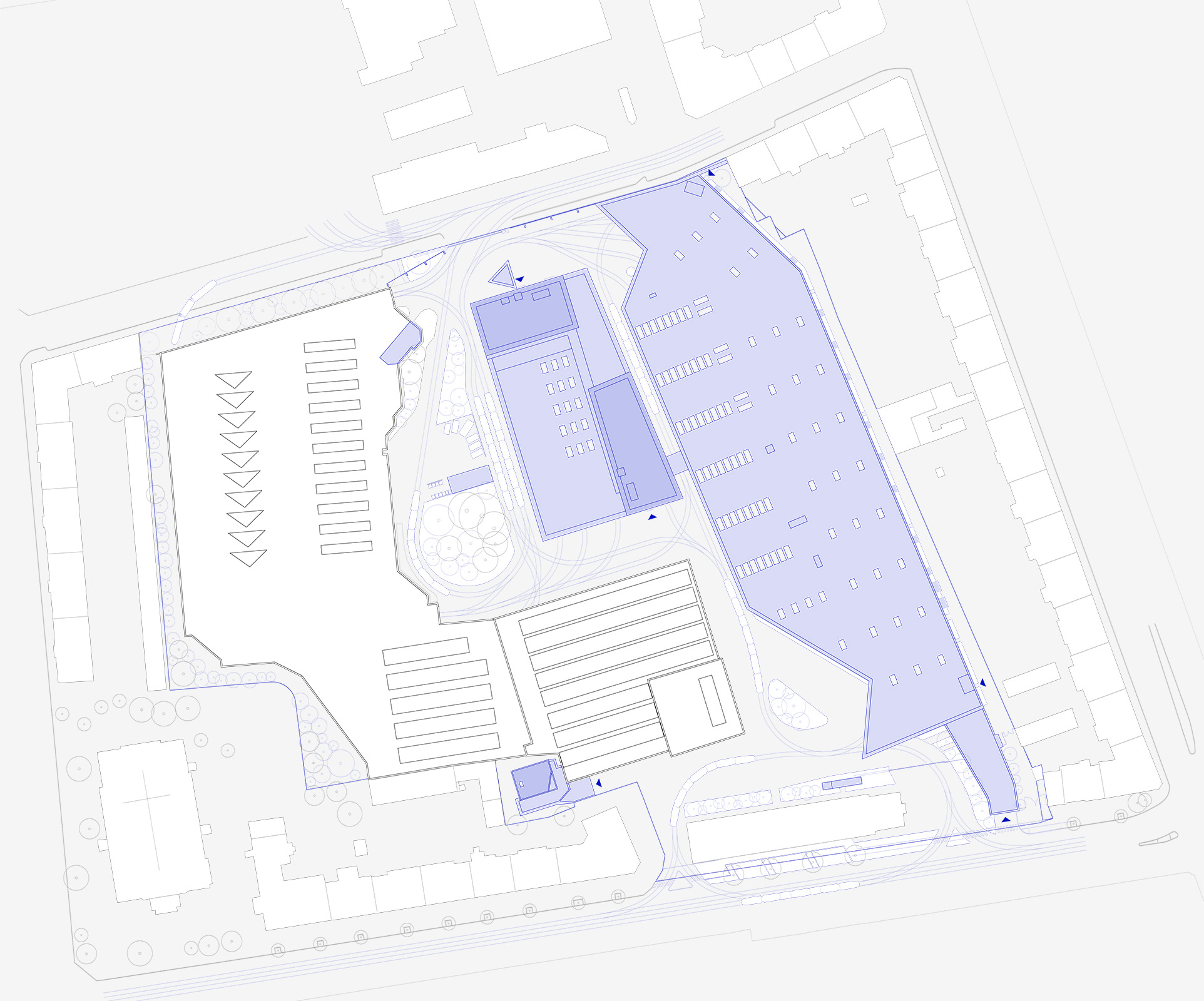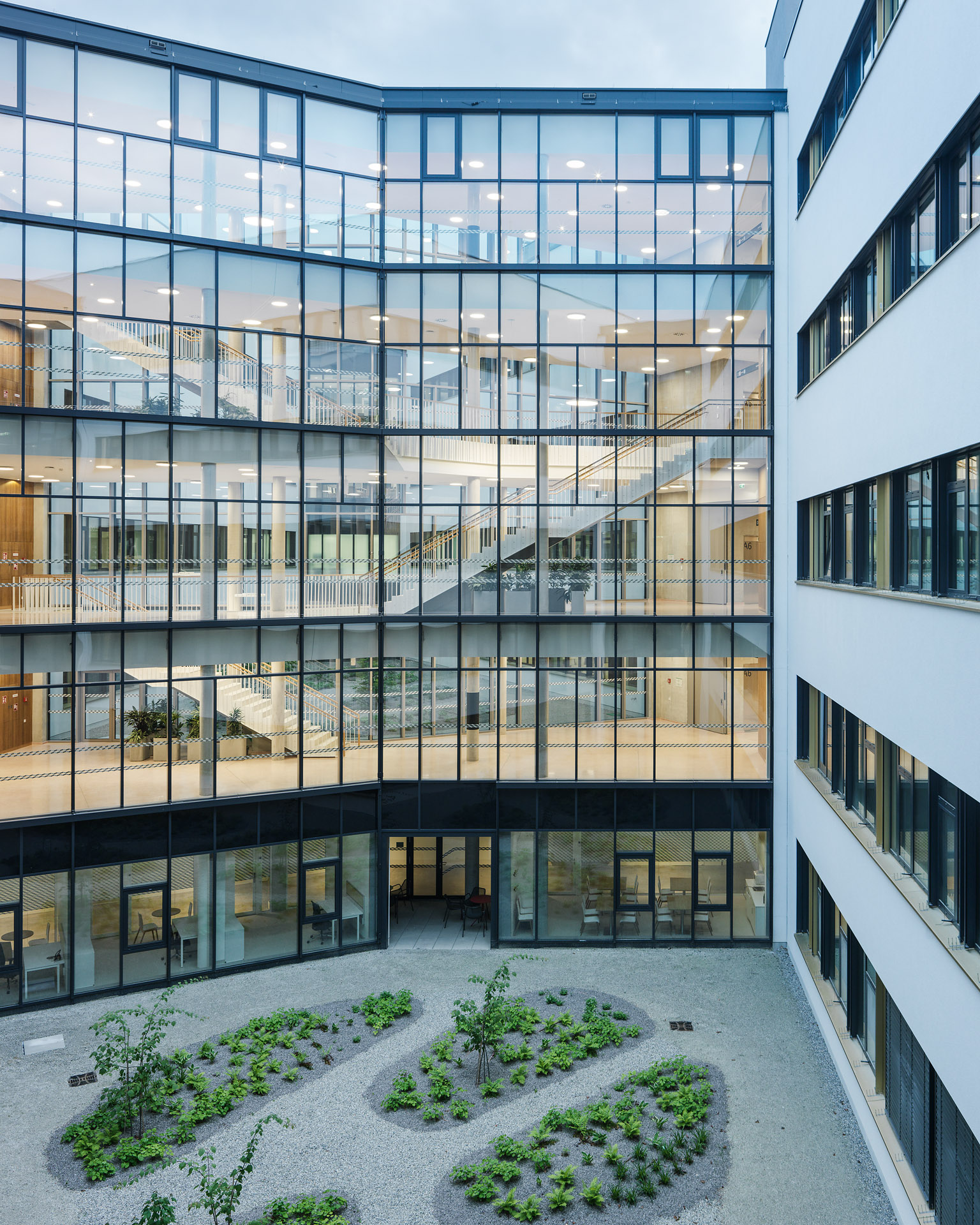 Als Ersatz für die wegfallenden Freiflächen sind Grünflächen auf den Flachdächern der neuen Gebäude geplant. Eine Grüne Wand schließt das Gelände nach außen hin ab und bildet den Übergang zum umgebenden Stadtraum.