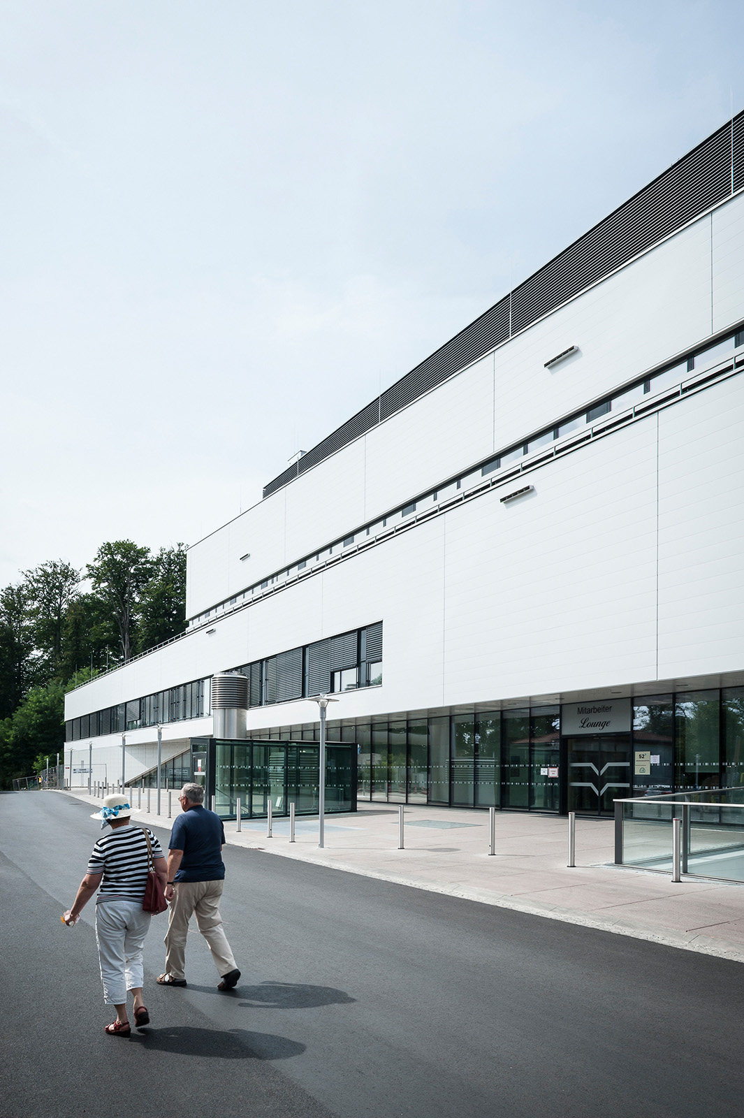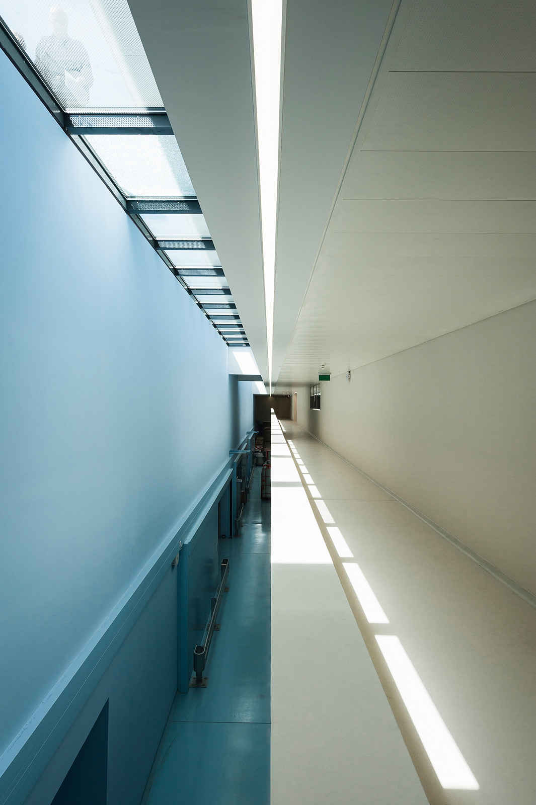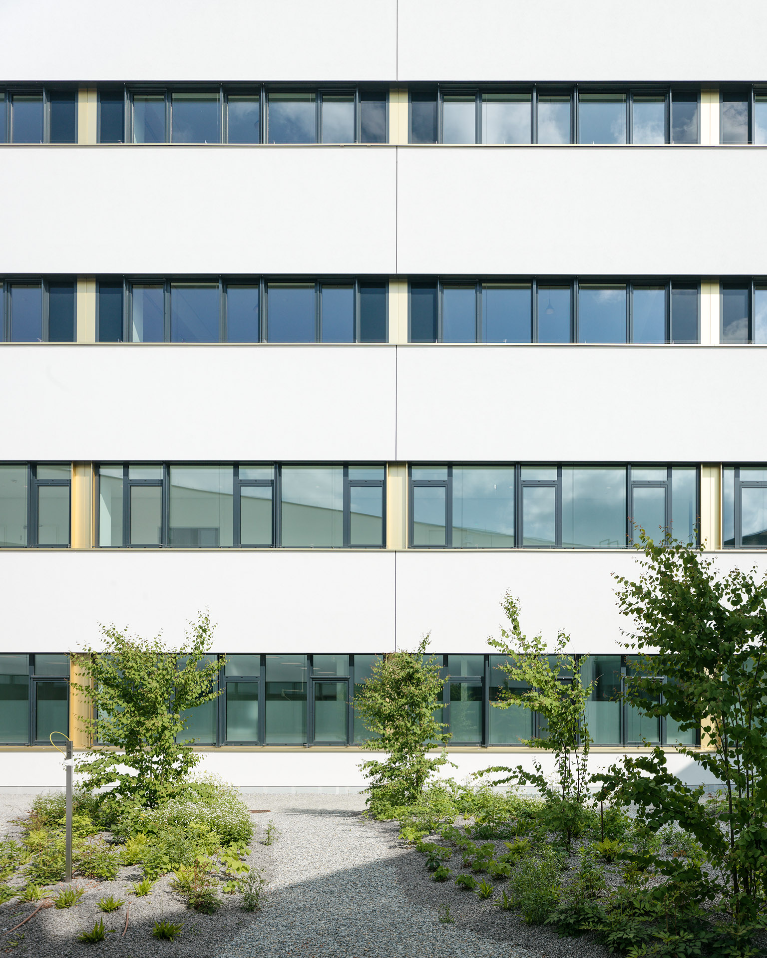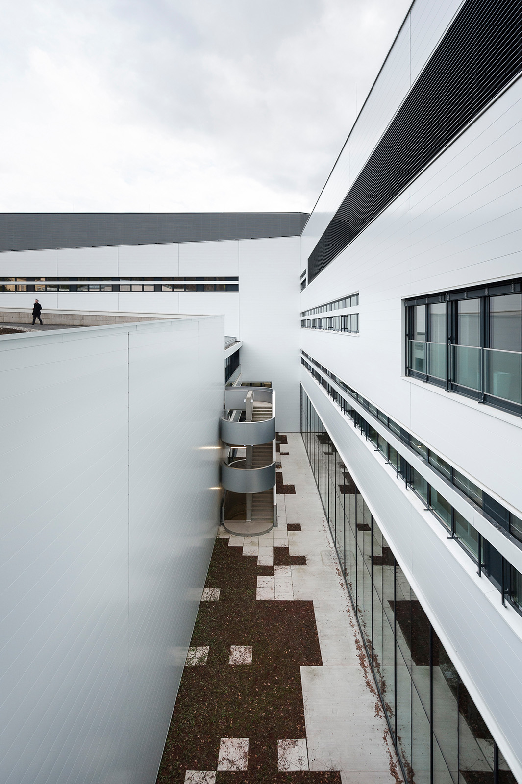 Um bei diesem Bild zu bleiben, entspräche die Zufahrt zum unterirdisch gelegenen Anlieferhof etwa einer Laderampe unter dem Bug. Abermals wird dieser – zwar sehr persönliche – Eindruck durch das Material der Fassade bestärkt, die durchwegs mit verzinkten und weiß lackierten Blechpaneelen verkleidet ist.
