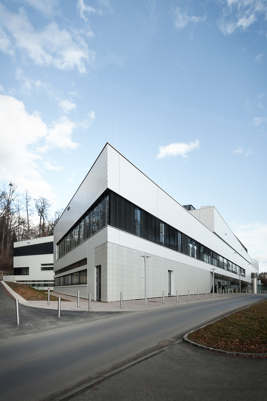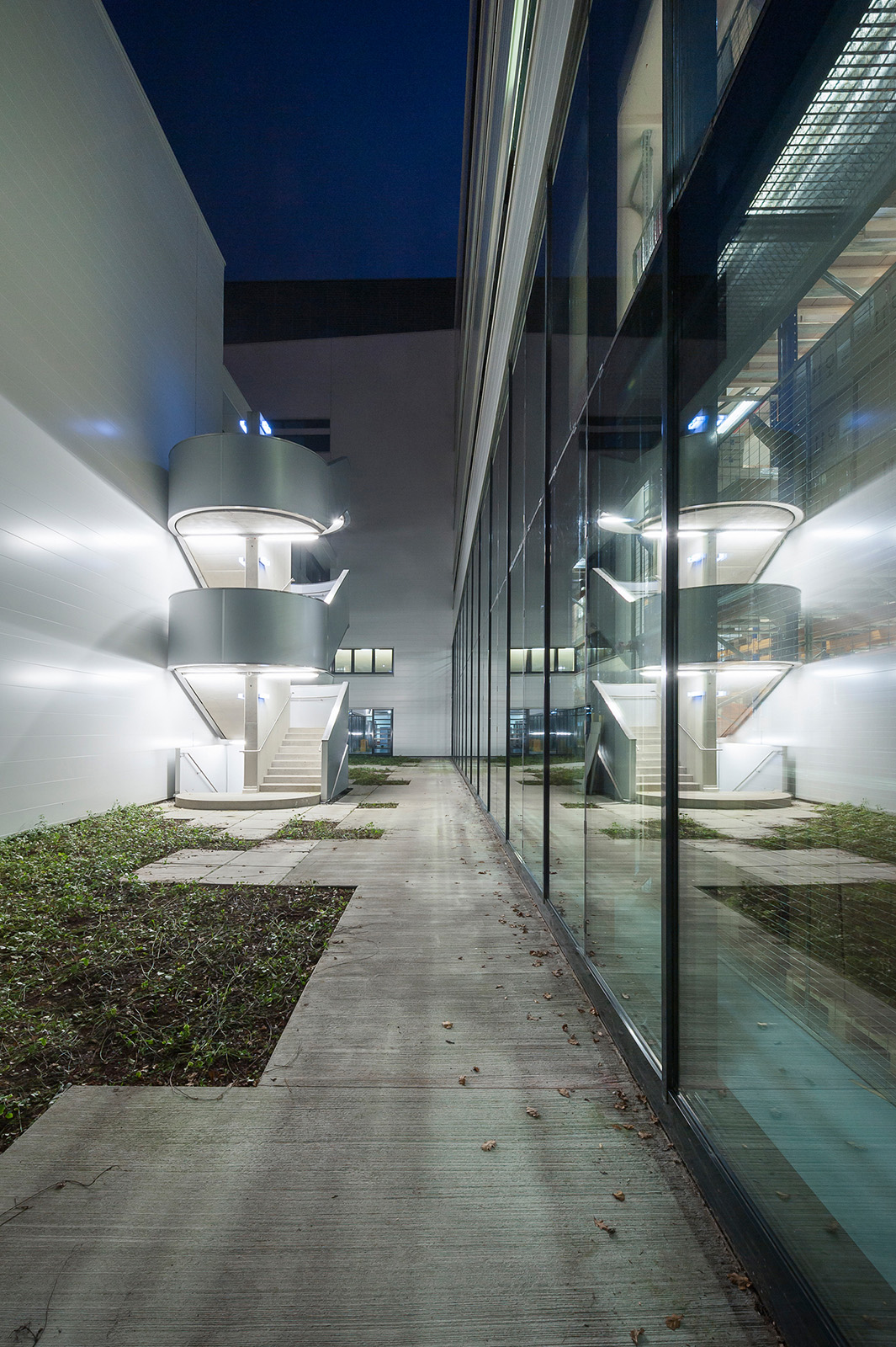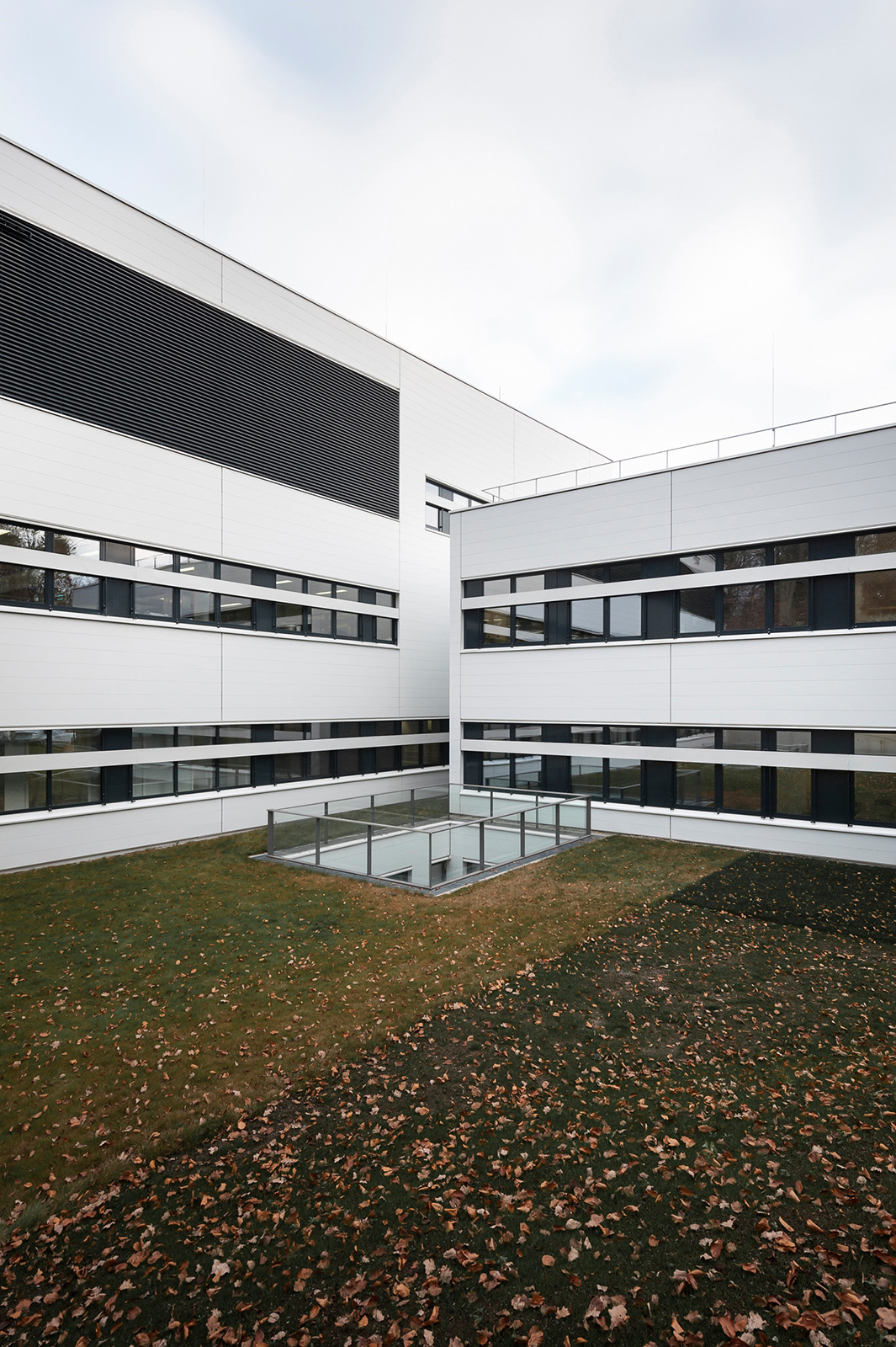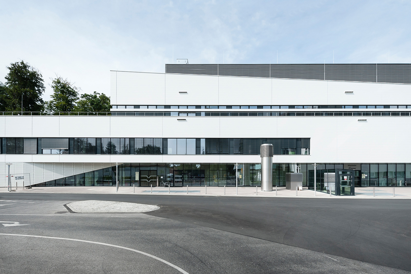 Um bei diesem Bild zu bleiben, entspräche die Zufahrt zum unterirdisch gelegenen Anlieferhof etwa einer Laderampe unter dem Bug. Abermals wird dieser – zwar sehr persönliche – Eindruck durch das Material der Fassade bestärkt, die durchwegs mit verzinkten und weiß lackierten Blechpaneelen verkleidet ist.
