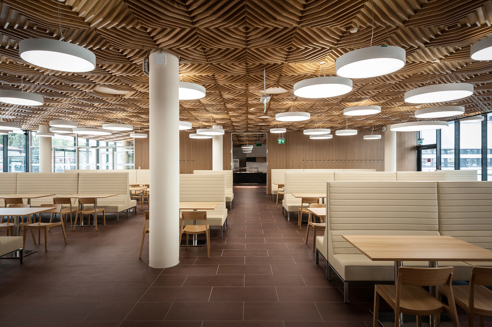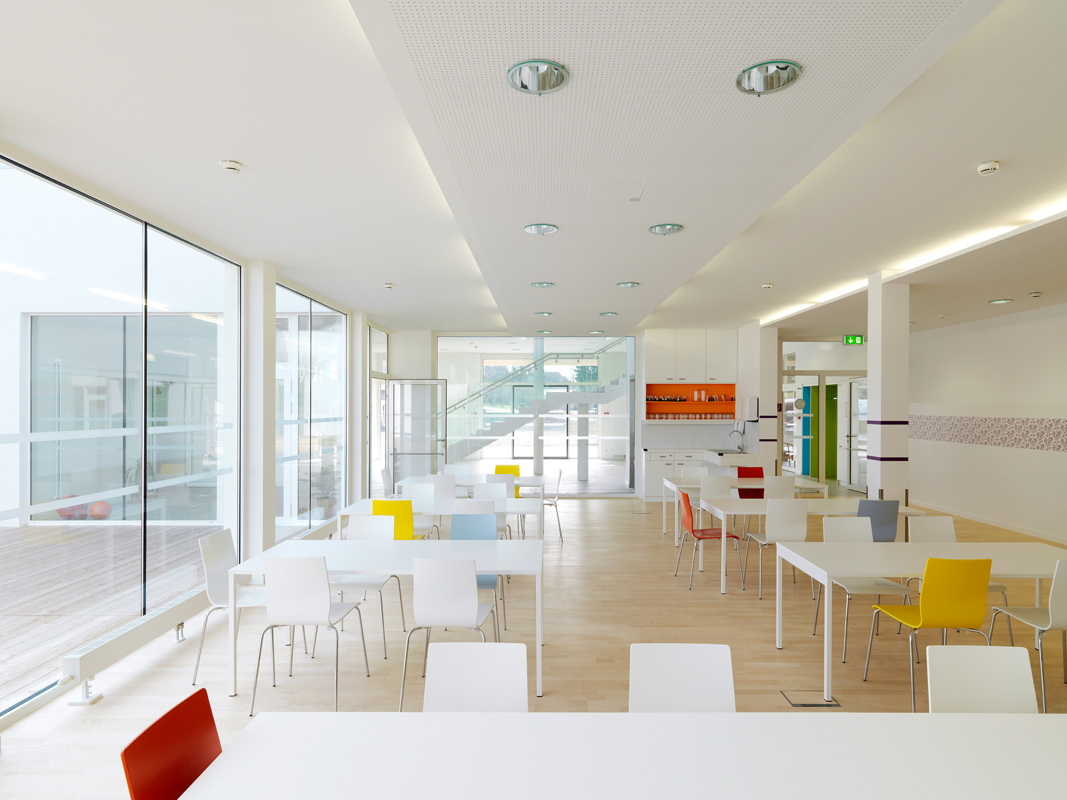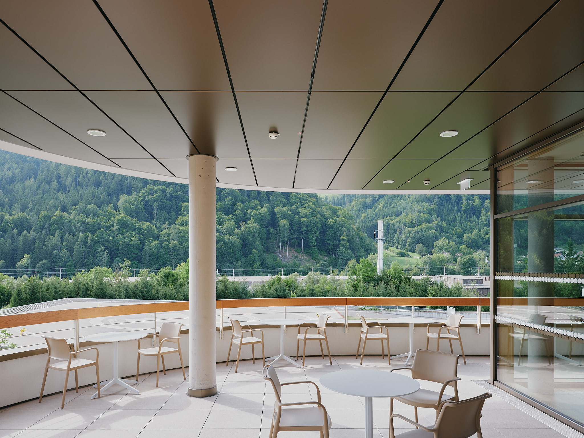 Ein geschwungener Raumteiler, trennt den Speisesaal vom Gang und übernimmt vielfältige Funktionen: Stauraum, Akustikelement, Ablagebord und Rückgrat des Loungebereichs. Die Sitzplätze sind dabei so angeordnet, dass man von diesem Element geschützt durch großzügige Verglasungen auf die Terrasse und weiter in die Umgebung blickt. Terrasse beziehungsweise Vordach bieten Sonnenschutz und verhindern, dass der Ausblick ständig durch Sonnenschutz unterbunden wird. Stimmungsvolle dimmbare Beleuchtung und Vorhänge unterstützen die wohnliche Atmosphäre.