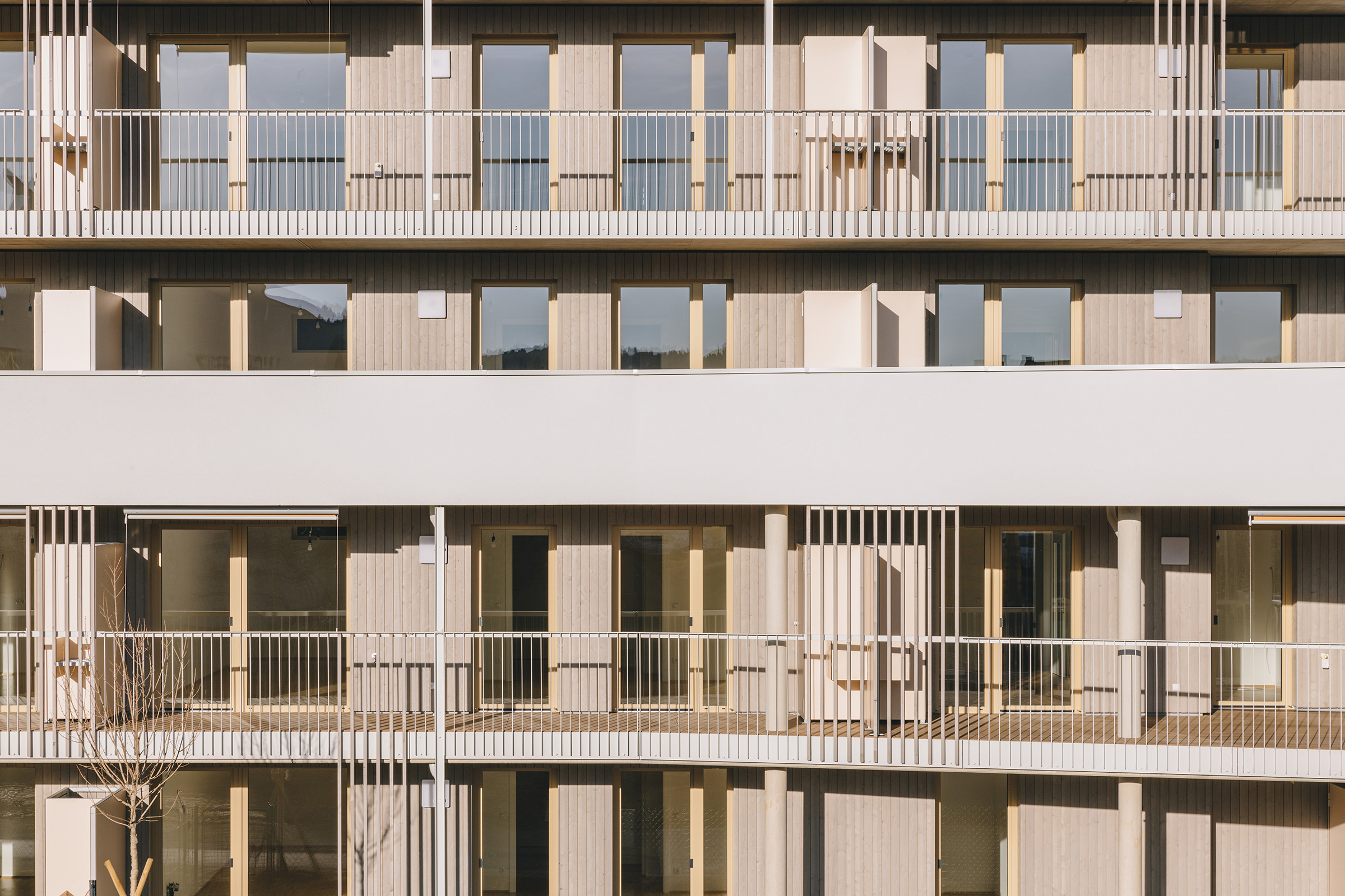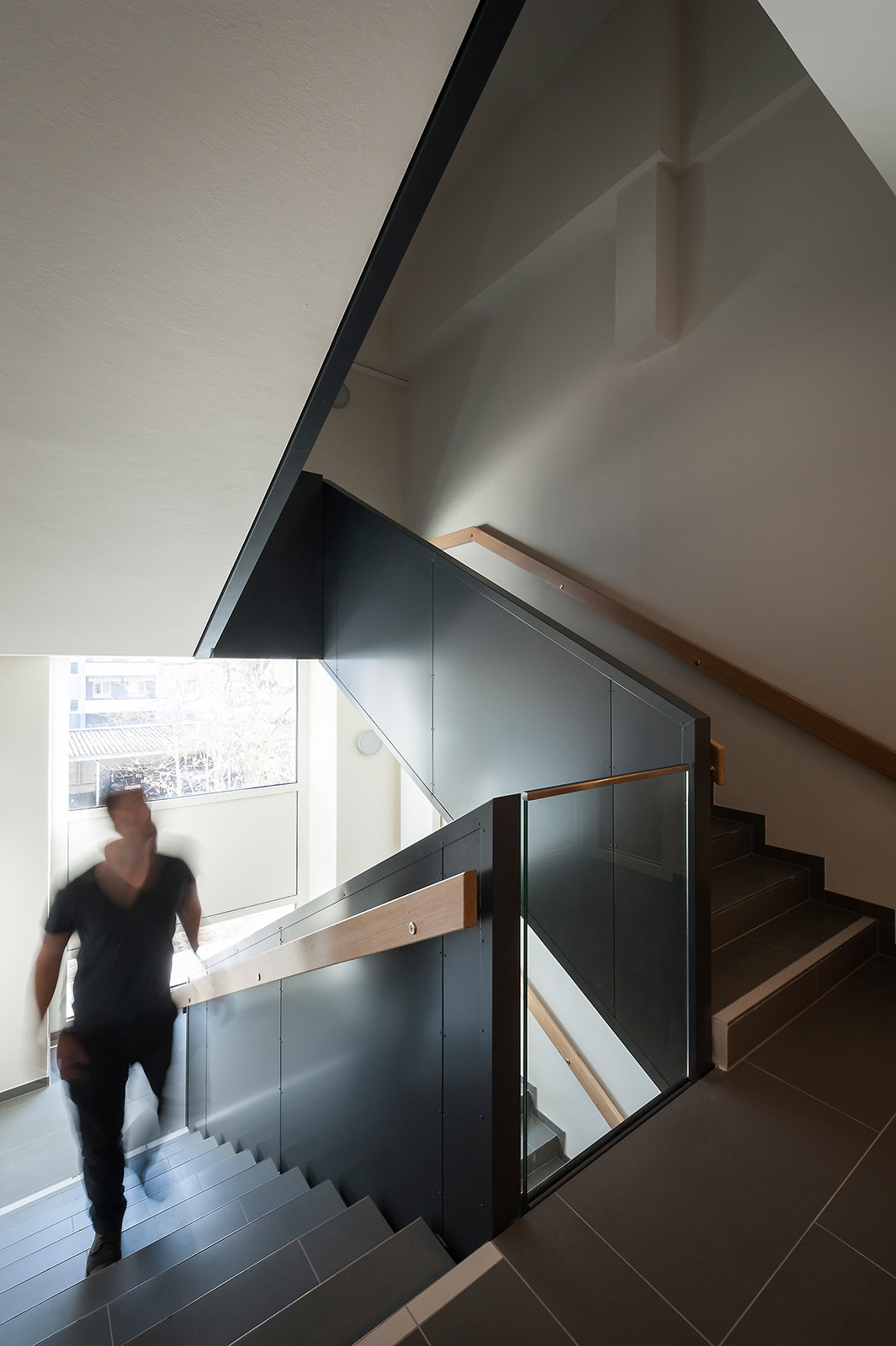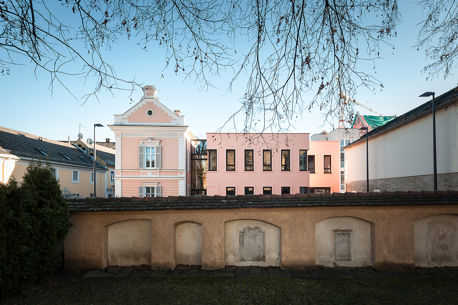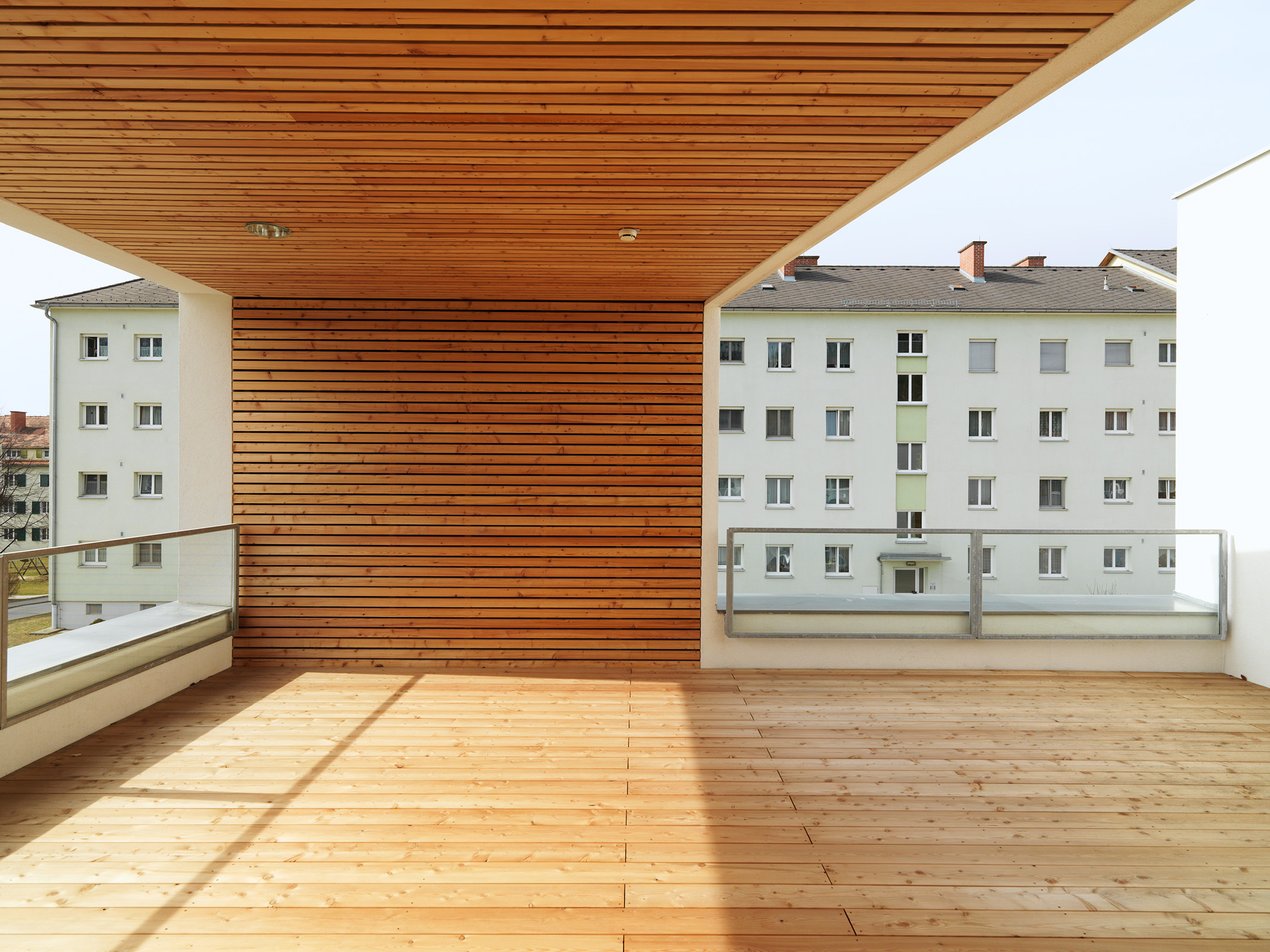 Unterstützt wird dies zudem durch die Revitalisierung eines alten, hölzernen Pawlatschengangs an der Innenhofseite. Durch das bewusste Absetzen dieses Gangs von der Außenfassade entsteht eine angenehme Leichtigkeit und Durchlässigkeit des Gebäudes über die Geschoße hinweg.