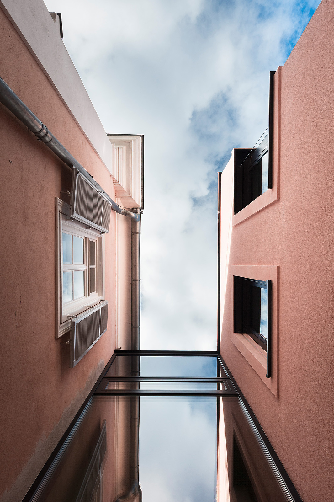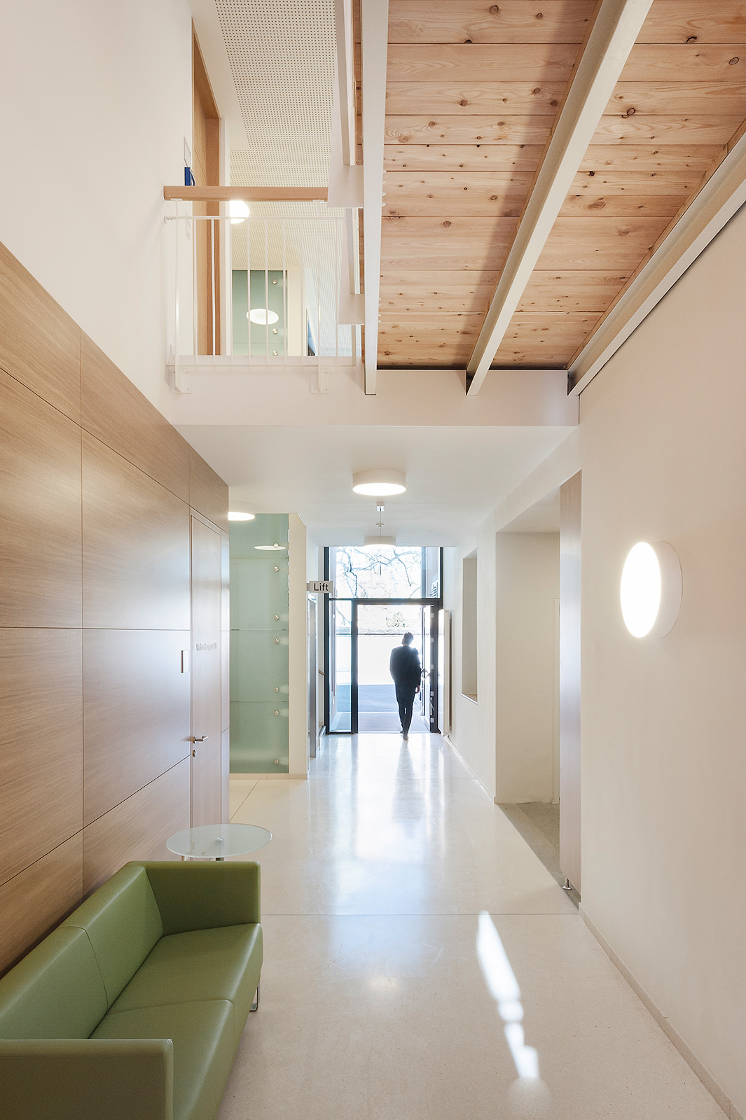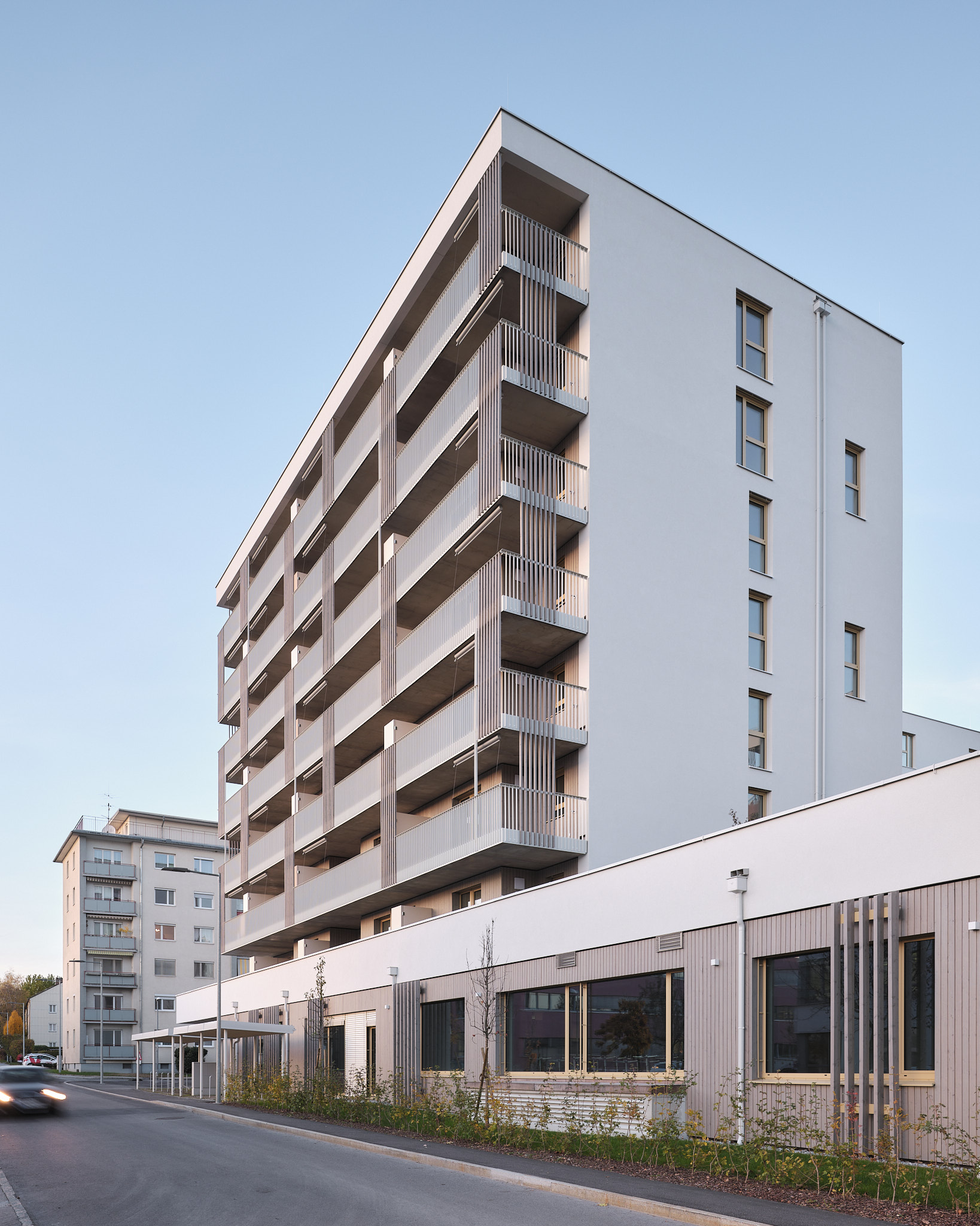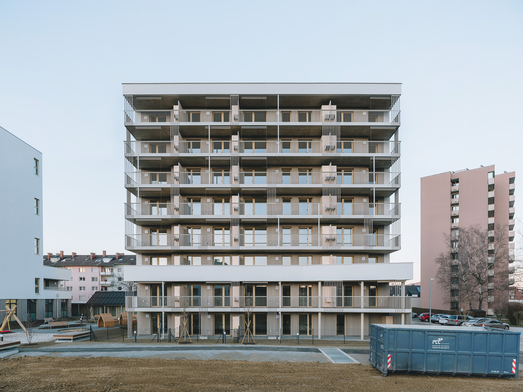 Unterstützt wird dies zudem durch die Revitalisierung eines alten, hölzernen Pawlatschengangs an der Innenhofseite. Durch das bewusste Absetzen dieses Gangs von der Außenfassade entsteht eine angenehme Leichtigkeit und Durchlässigkeit des Gebäudes über die Geschoße hinweg.