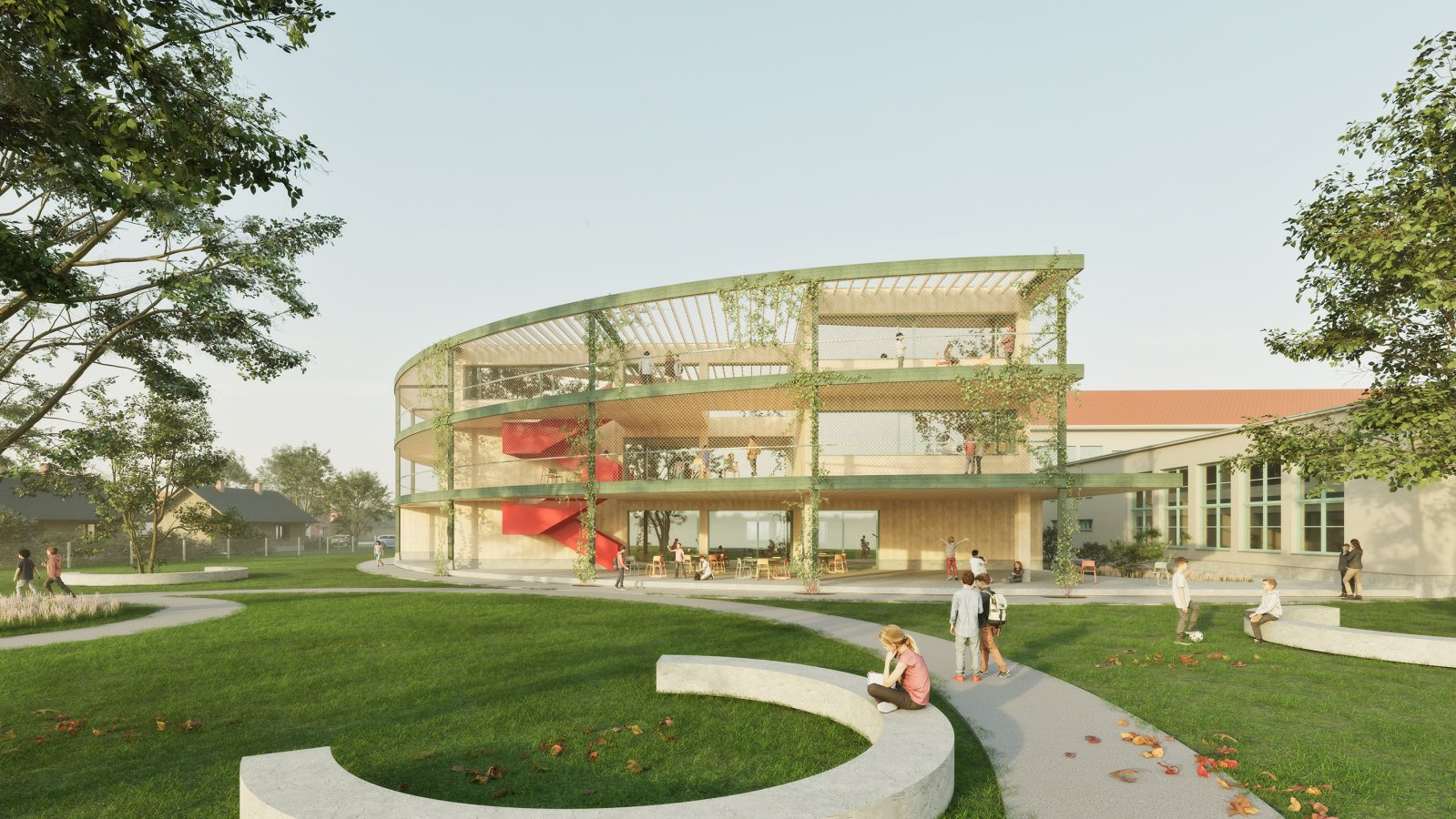 Der bestehende langestreckte, zweigeschossige Haupttrakt wird an seiner Stirnseite im Westen durch ein dreigeschoßiges, halbkreisförmiges Volumen erweitert. Der Halbkreis nimmt im Süden mit seinem Radius die Flucht des Turnsaales auf und ragt im Norden, an der Eduard Keil Gasse, über die bestehende Kante des Haupttraktes, ohne jedoch die Abstandsbestimmungen zu verletzten.