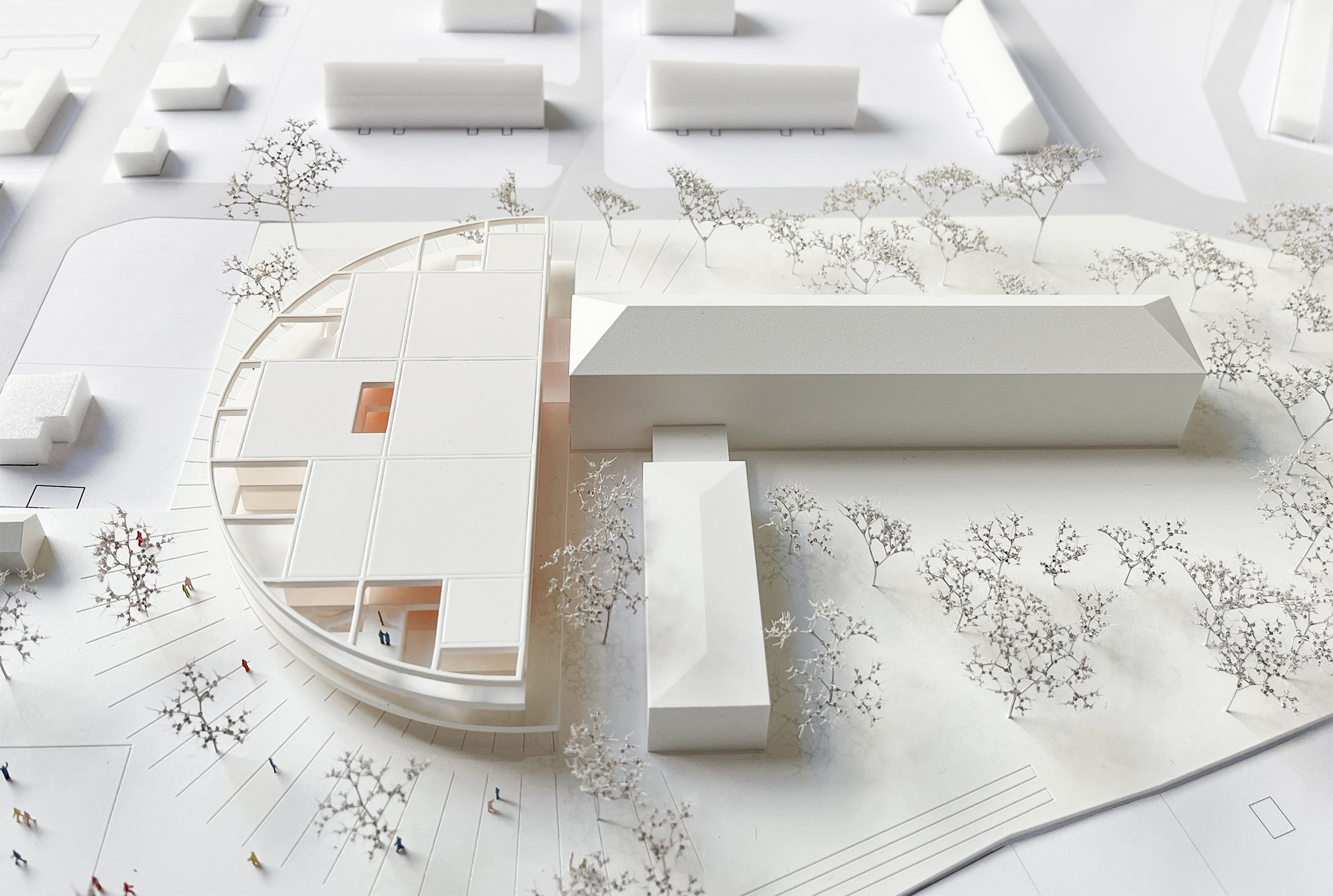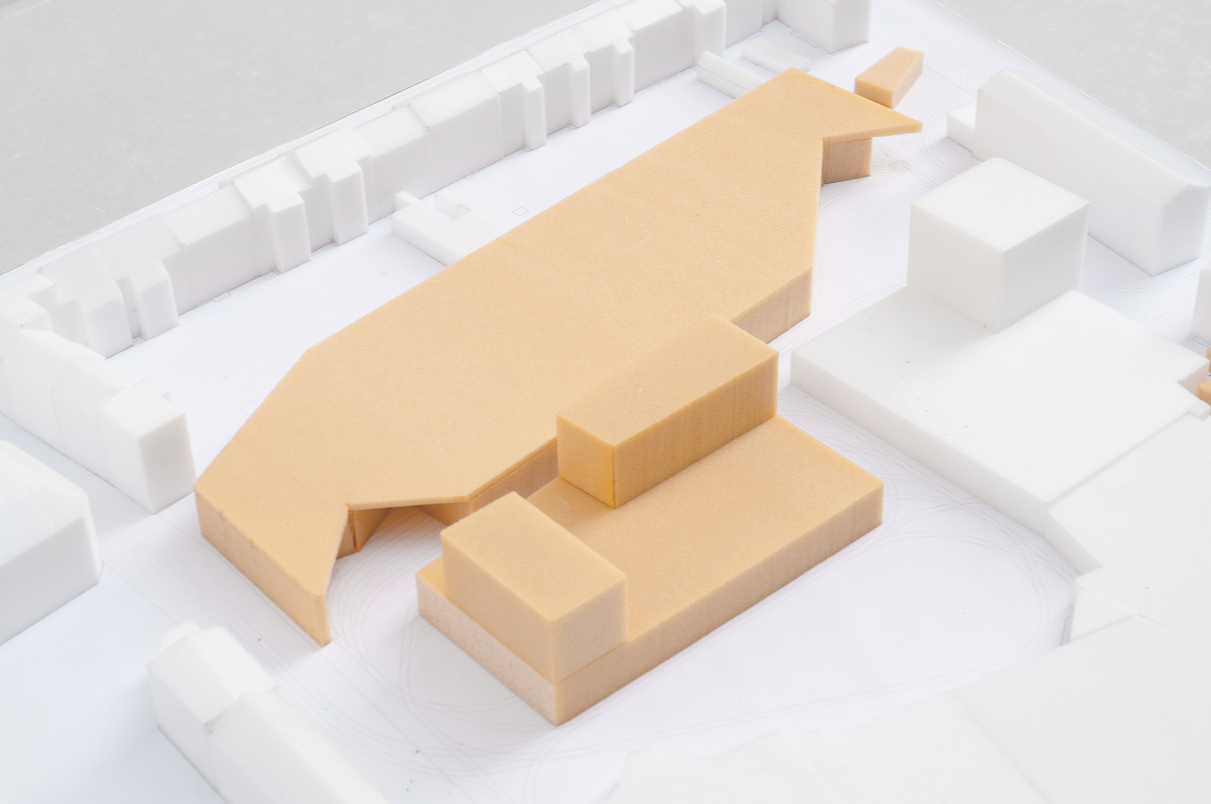 Dies gelingt, indem der neue Baukörper auf der Seite der Wohnblöcke die Straßenflucht zweigeschossig aufnimmt und dadurch eine repräsentative urbane Situation ausbildet. Hangseitig ist das Gebäude eingegraben, um mit den kleineren Nachbarhäusern in Form einer eingeschossigen Fassade in Dialog zu treten.