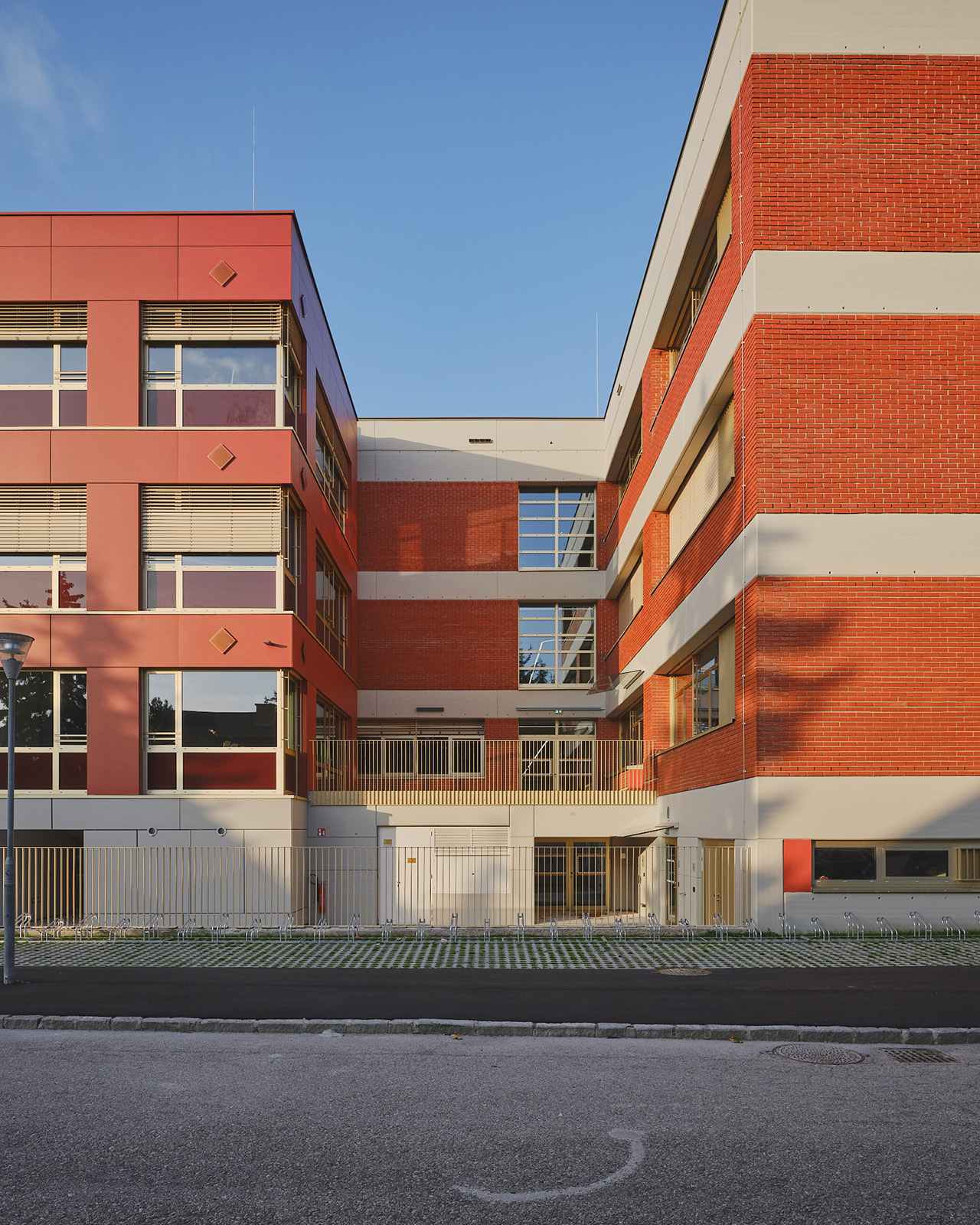 Als neues Herzstück der Schule kann die breite und luftige Magistrale bezeichnet werden, die sich in Verlängerung der Eingangsrampe durch den Bestand und den Zubau über alle Geschoße erstreckt. Als funktionales Bindeglied verknüpft sie Alt und Neu und ermöglicht eine klare Orientierung für die jungen Wiener Neustädter:innen. Für den Zubau wurden Zitate aus der Bestandsfassade, wie die Proportion der Öffnungen, die Materialität und die Farbgebung entlehnt und neu interpretiert im Zubau fortgeführt. So präsentiert sich der Neubau als nach allen Seiten hin offener Baukörper, dessen hinterlüftete Fassadenplatten in Sichtbetonoptik das gebrannte Rot der Klinkerziegel vom Bestand aufnehmen.