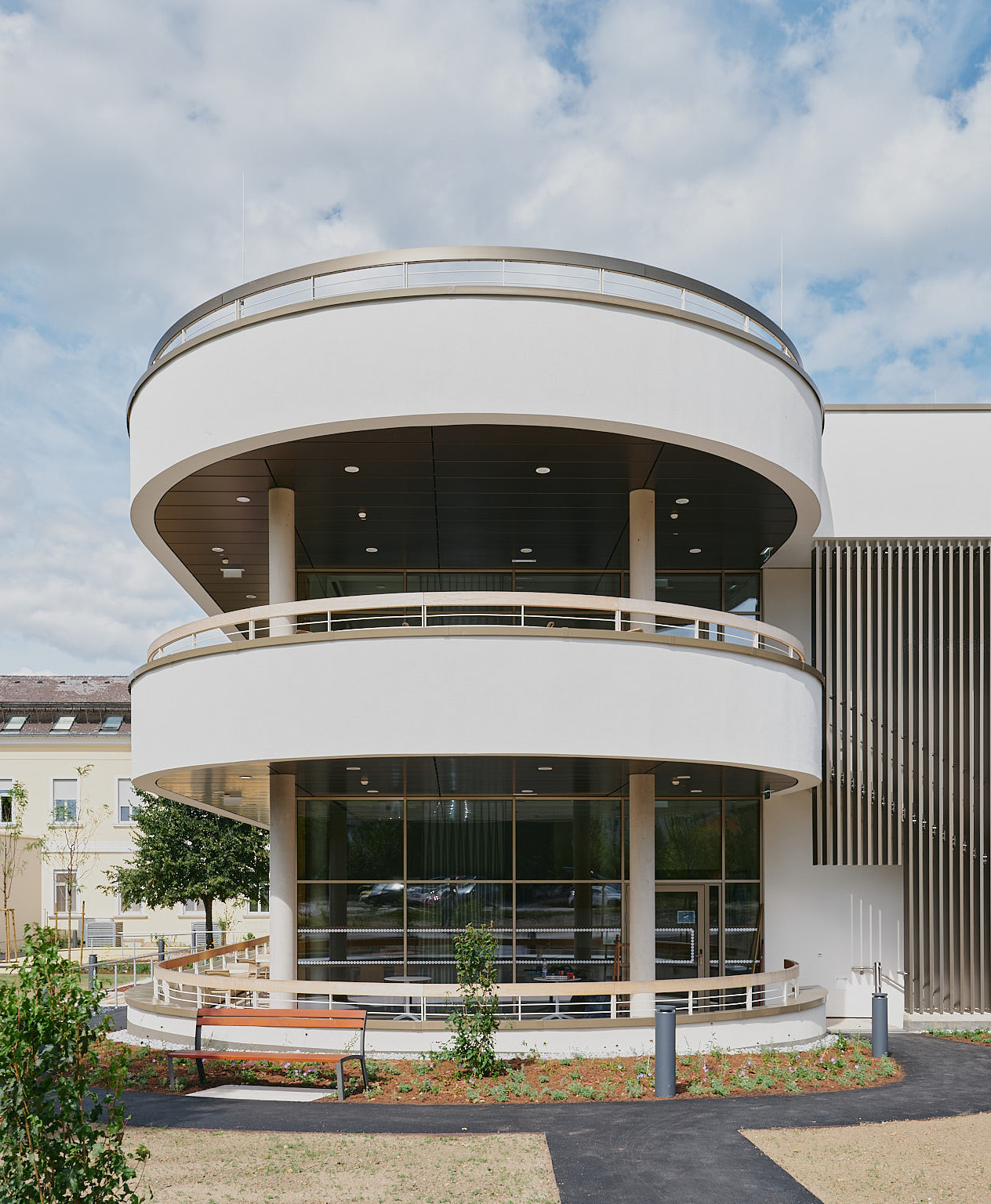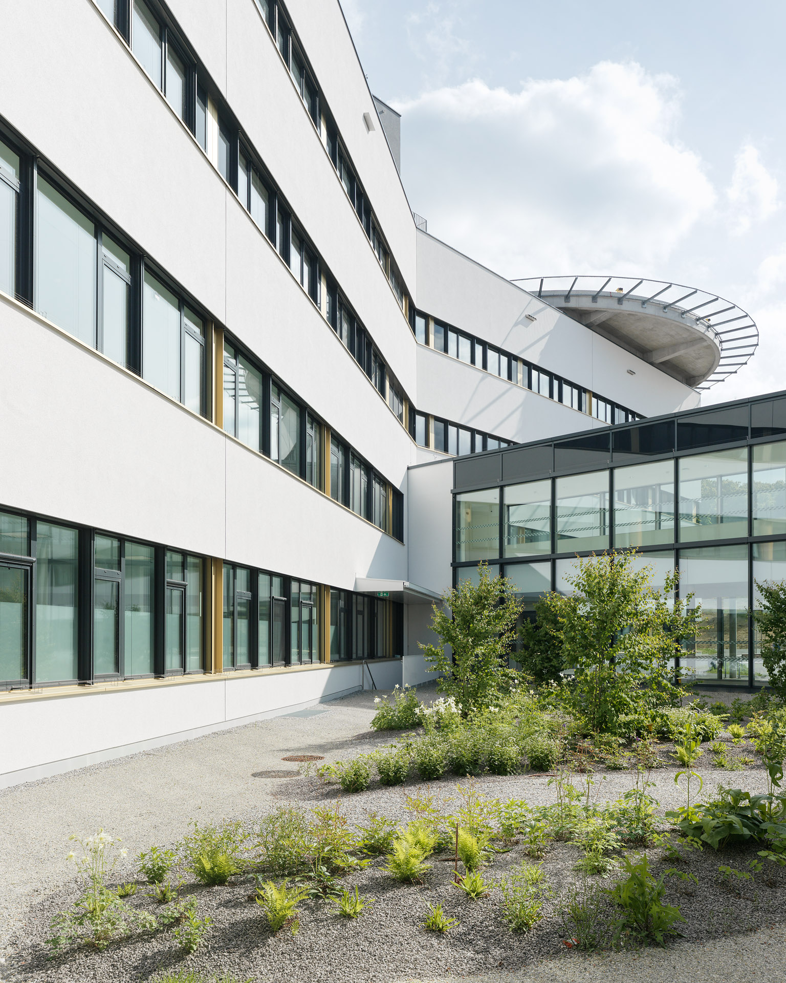 Die neu errichtete Klinik Oberwart bietet mit ihren schlanken, zueinander verschränkten Baukörpern einen lichtdurchfluteten und abwechslungsreichen Rahmen für die vielfältigen Behandlungs- und Pflegeaufgaben eines modernen Krankenhauses. Hauptmagistrale, Nebenmagistralen und Gänge bilden kleinteilige, helle Verteiler-, Warte- und Kommunikationsräume, die auch an dunklen und nassen Tagen zu Bewegung und sozialem Austausch einladen. Mehrgeschoßige Licht-, Luft- und Blickverbindungen fassen mit sanft ansteigenden Treppenanlagen das Gebäude über mehrere Geschoße hinweg zu einer großen Einheit zusammen.