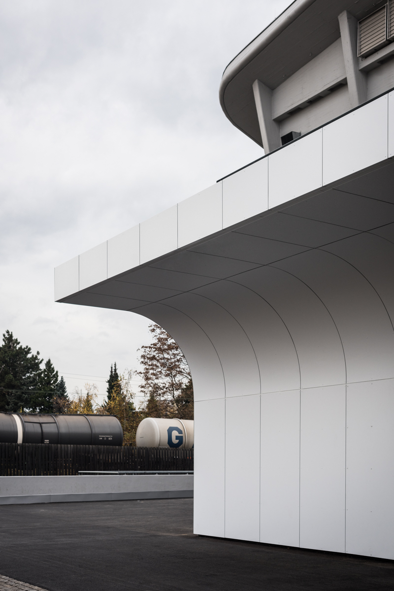 Um bei diesem Bild zu bleiben, entspräche die Zufahrt zum unterirdisch gelegenen Anlieferhof etwa einer Laderampe unter dem Bug. Abermals wird dieser – zwar sehr persönliche – Eindruck durch das Material der Fassade bestärkt, die durchwegs mit verzinkten und weiß lackierten Blechpaneelen verkleidet ist.