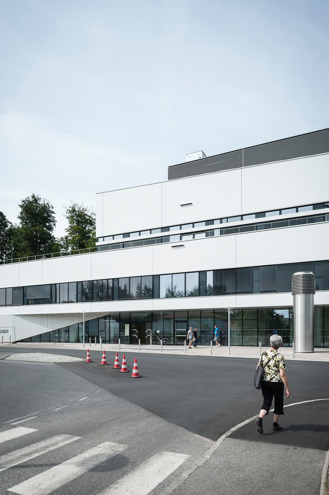 Die zentrale, mehrgeschoßige Magistrale bildet das Rückgrat des Gebäudes. Sie verbindet und erschließt alle vorhandenen Funktionseinheiten und ermöglicht gleichermaßen die unkomplizierte Integrierung künftiger Bauteile. Die beiden östlichsten Baukörper beherbergen Verwaltung, Logistik und Speisenversorgung; der Mitarbeiterspeisesaal bietet weiten Ausblick und ermöglicht dem Personal Entspannung und Abstand von der Krankenhausroutine. Die fünf westlicheren Bauteile beherbergen Behandlung und Pflege: Notfälle, Ambulanzen und Tagkliniken im Erdgeschoß; Operationsbereich, Intensivstationen, Entbindung und Pädiatrie im ersten Obergeschoß; Pflegestationen im zweiten und dritten Obergeschoß, Mitarbeiterumkleiden und Haustechnik im Untergeschoß.