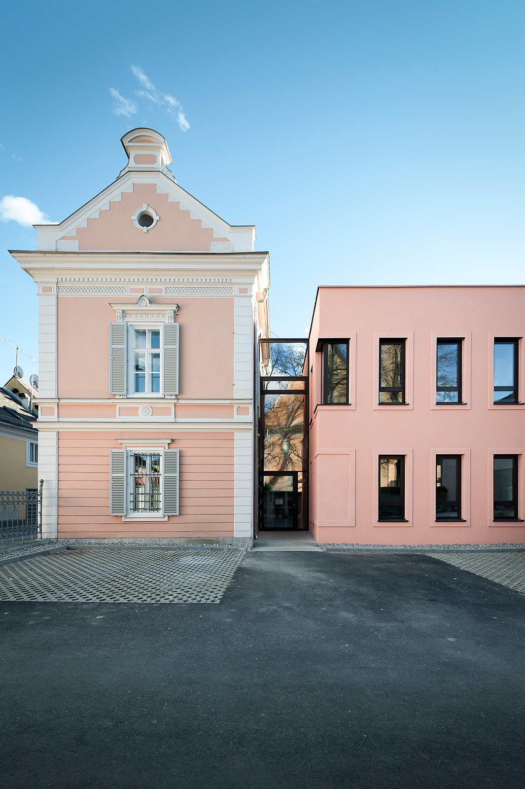 Der Nord-Süd gerichtete, zweigeschoßige Zubau setzt sich mit einer klaren Zäsur vom Bestandsgebäude ab. Ein von der Nordfassade zurückversetztes gläsernes Zwischenelement in dem sich die Umgebung spiegelt und das sich in seiner Materialität nahezu aufzulösen scheint bildet einen dezenten Berührungspunkt zwischen Alt und Neu.