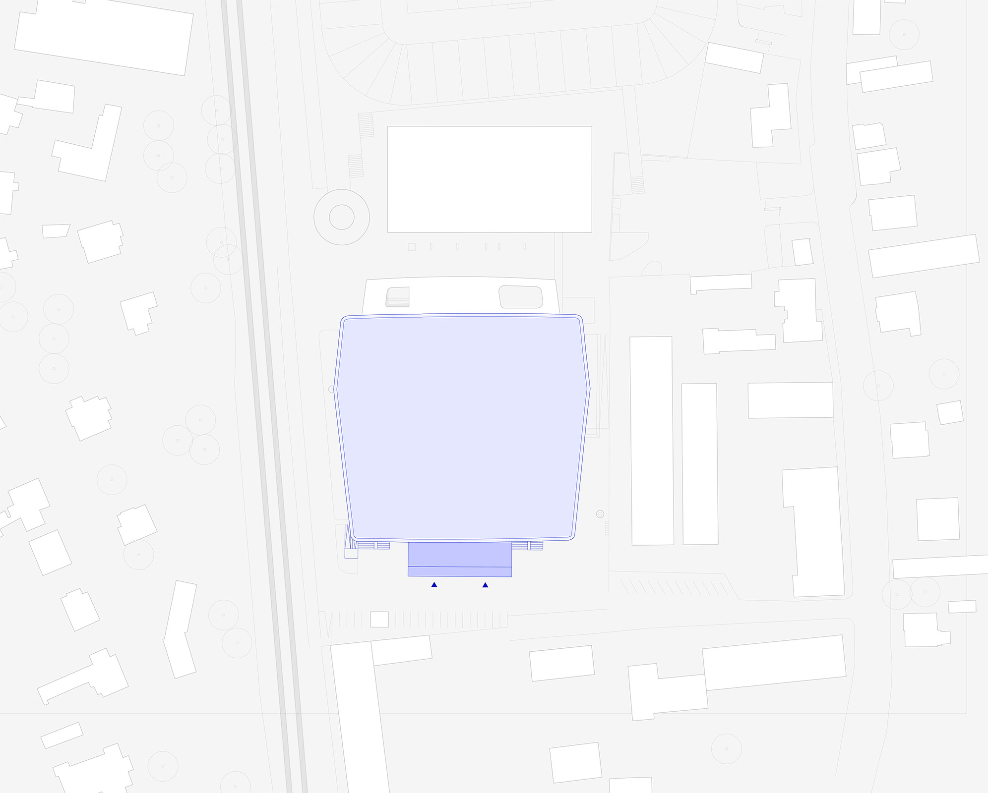 Dies gelingt, indem der neue Baukörper auf der Seite der Wohnblöcke die Straßenflucht zweigeschossig aufnimmt und dadurch eine repräsentative urbane Situation ausbildet. Hangseitig ist das Gebäude eingegraben, um  mit den kleineren Nachbarhäusern in Form einer eingeschossigen Fassade in Dialog zu treten.